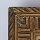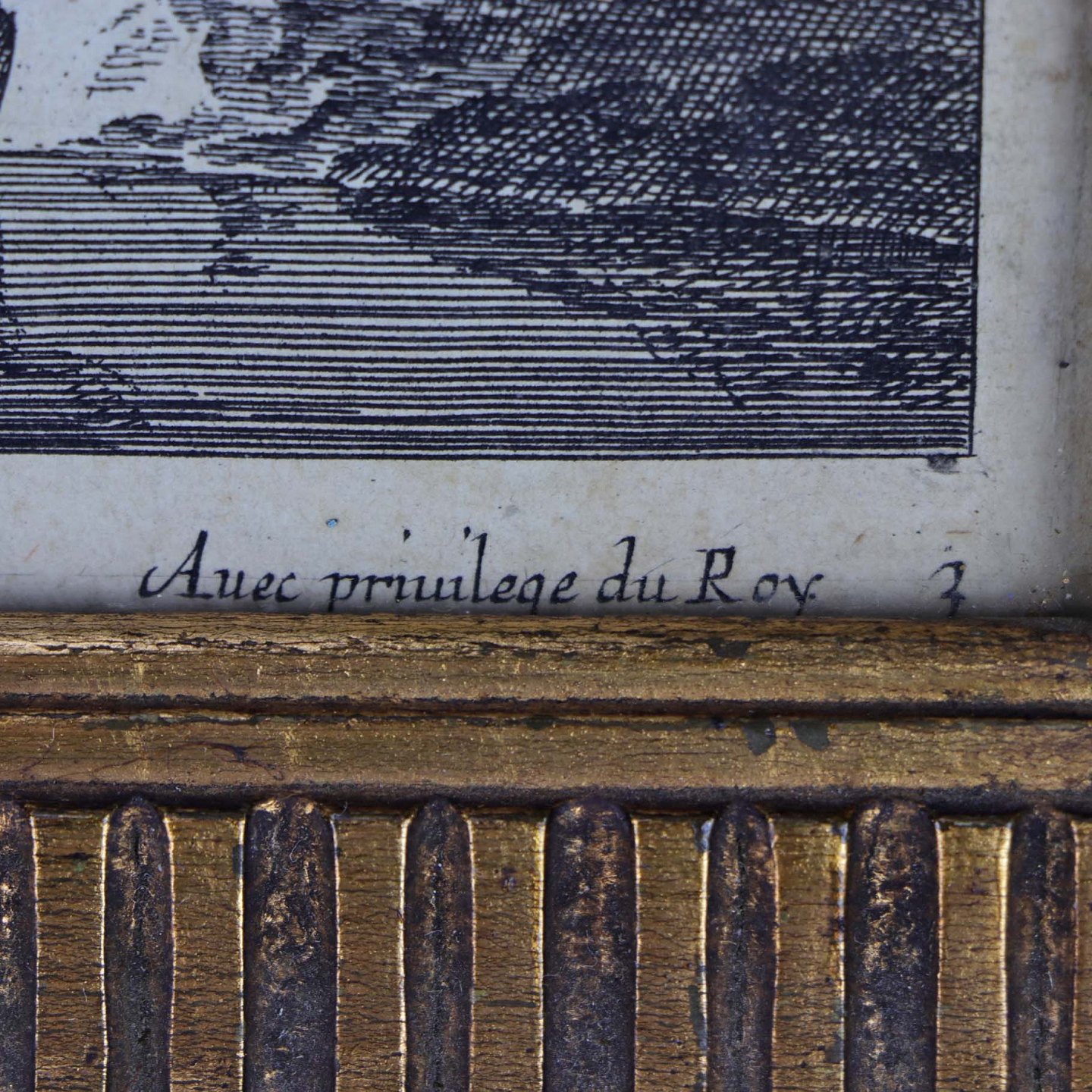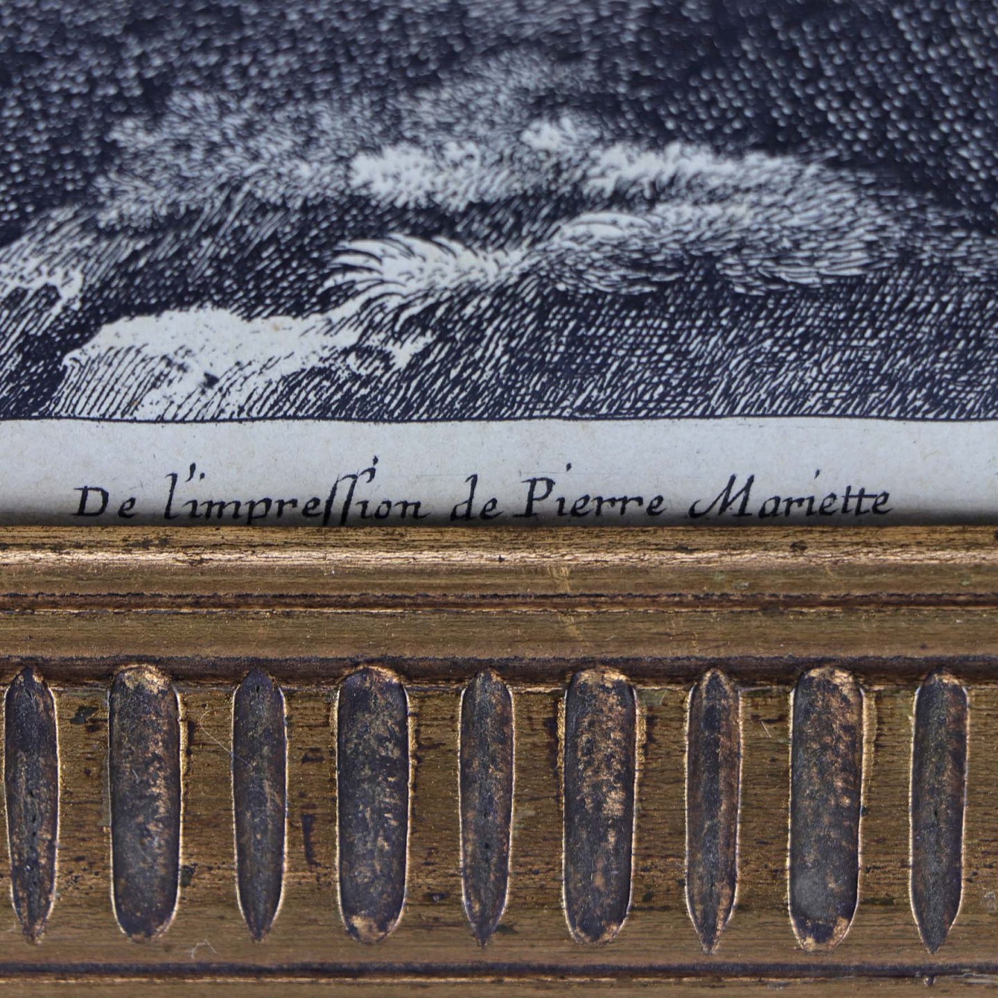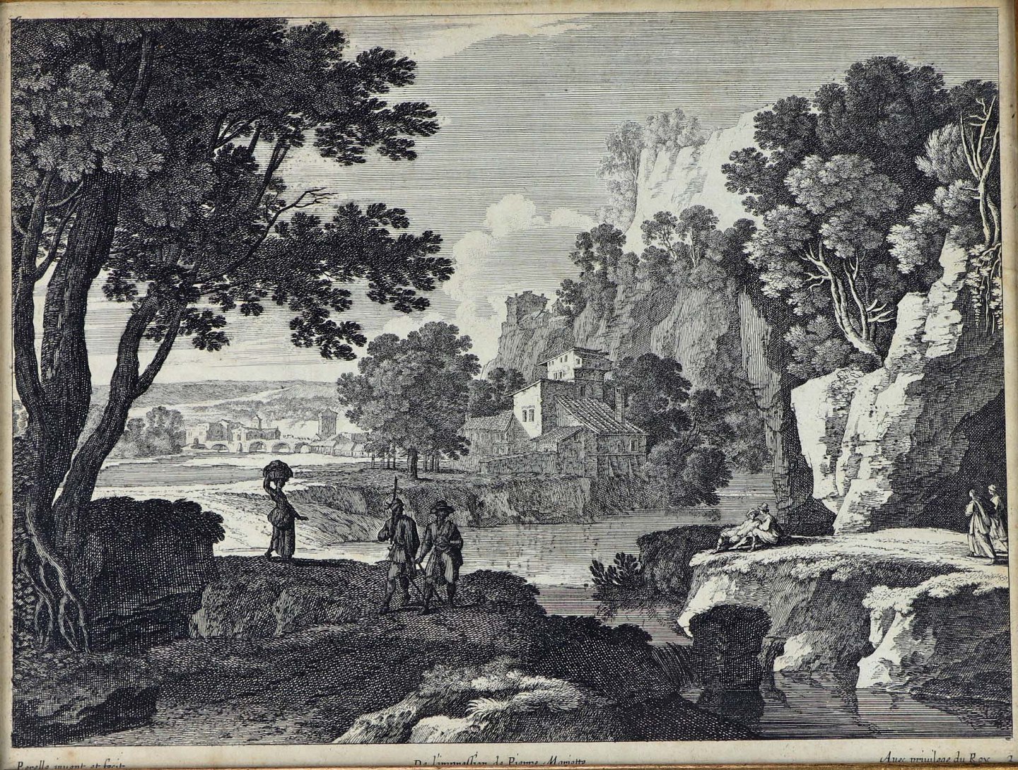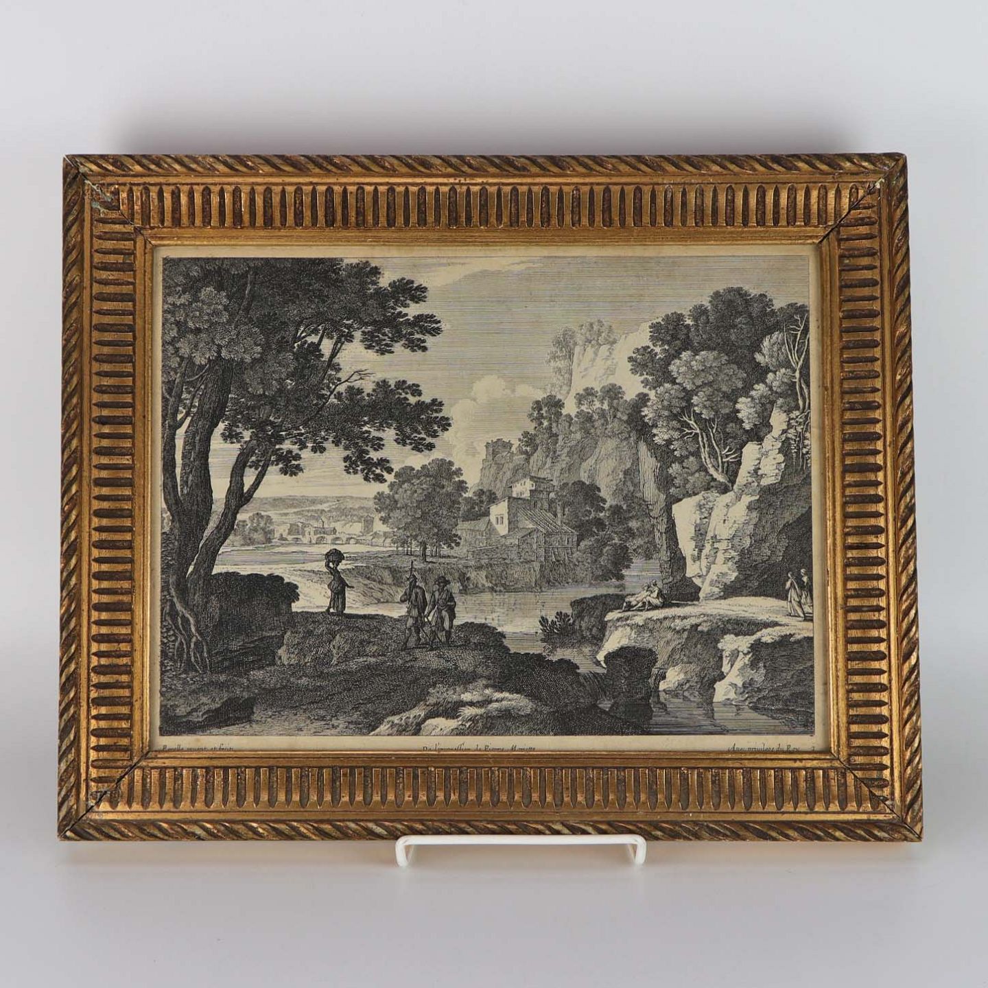 Indrammet bogtryk i guldmalet struktureret træramme med motiv af grupper af mennesker i klippeområde med udsigt til huse og flod.