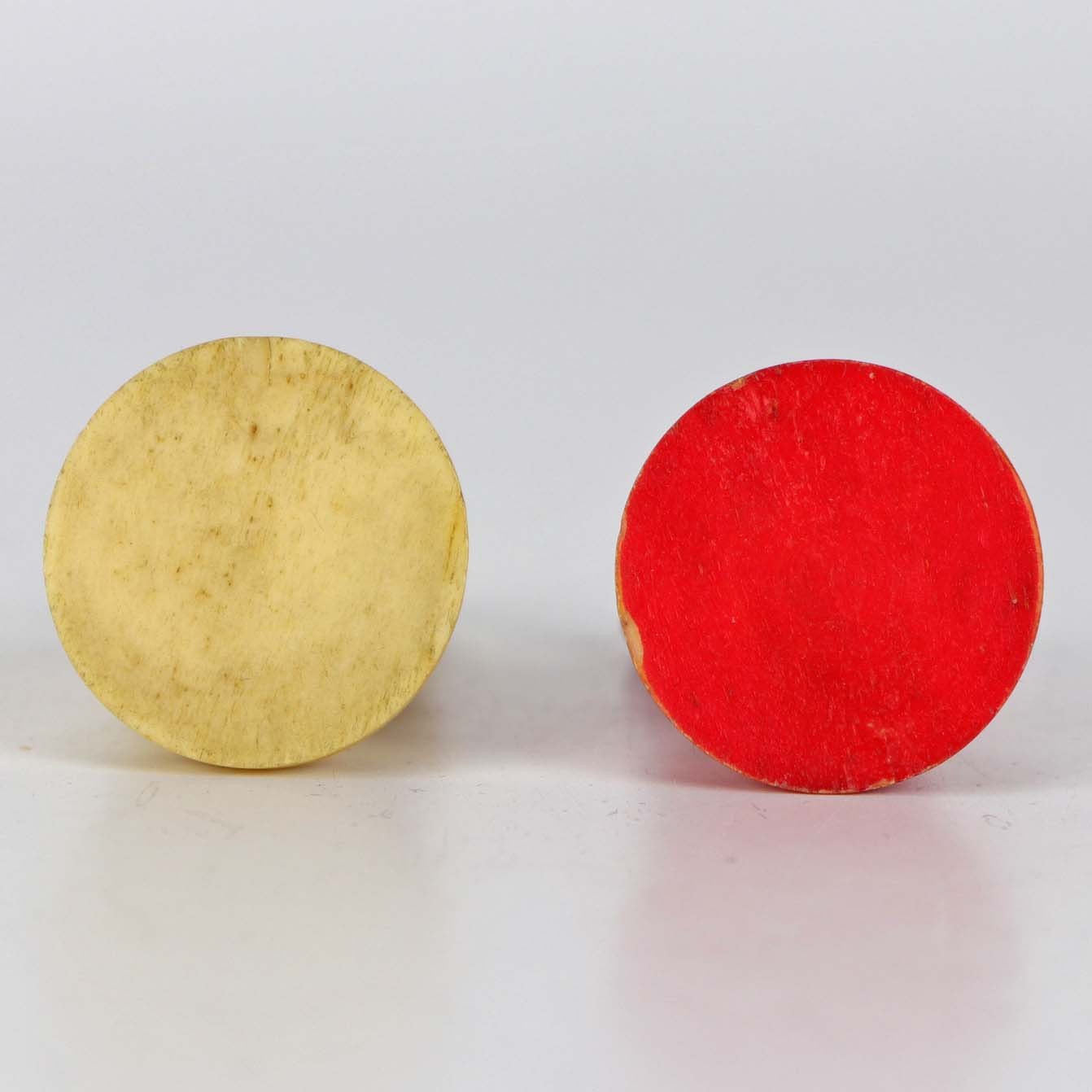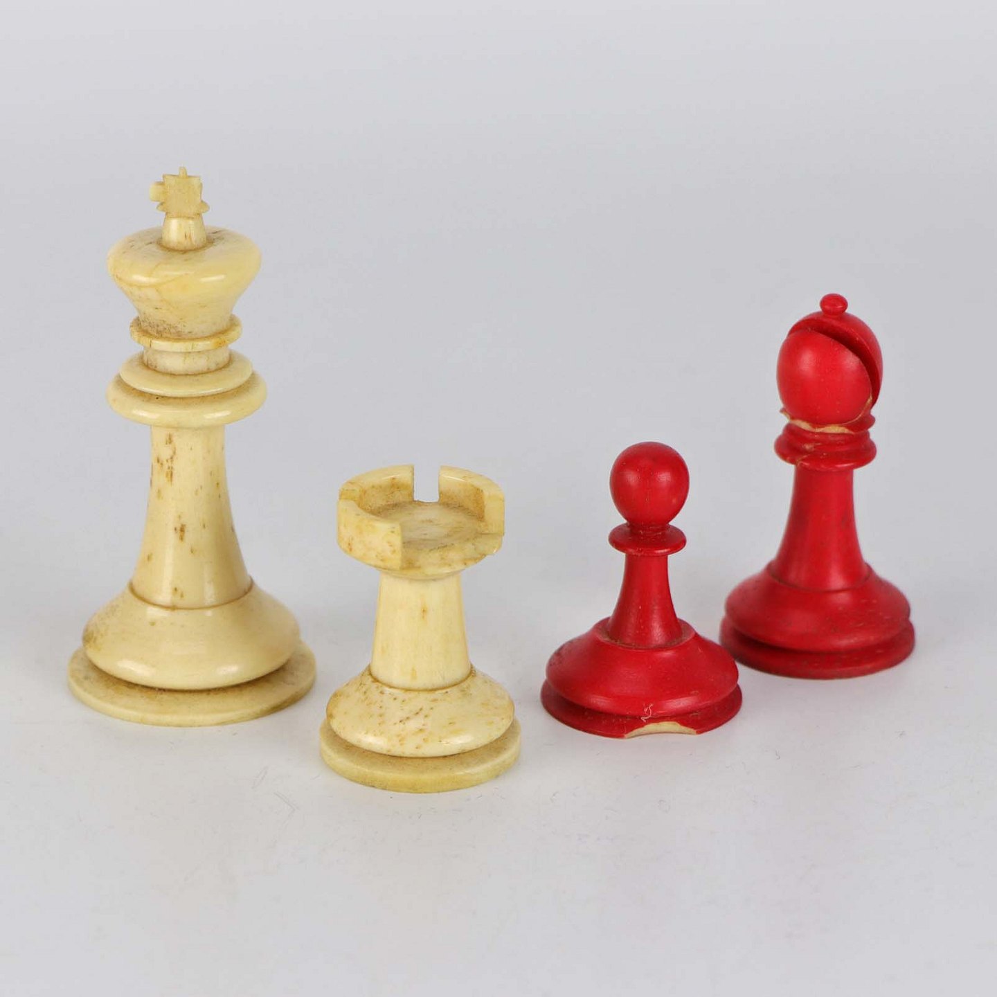 Ældre sæt røde og hvide skak brikker af ben. brikkerne kommer i ældre polstret cigaretboks. I alt 32 brikker.