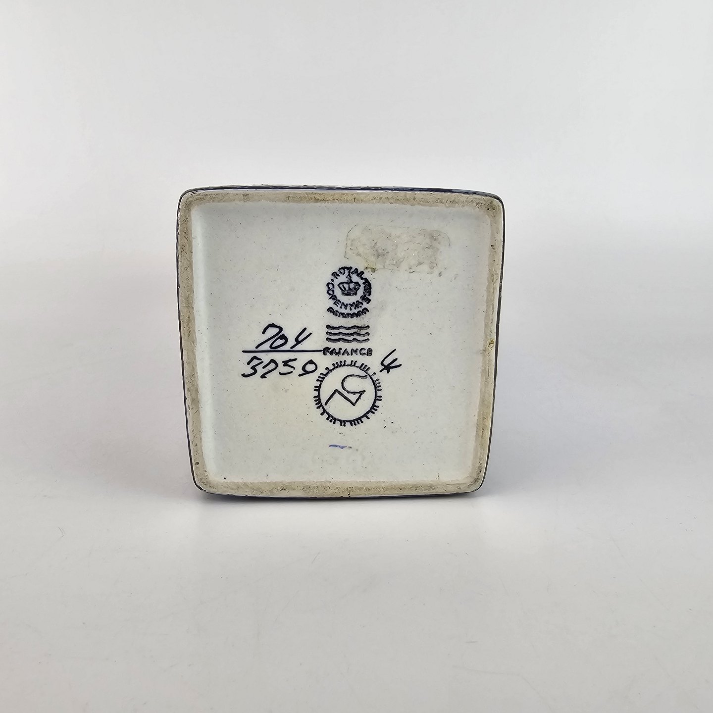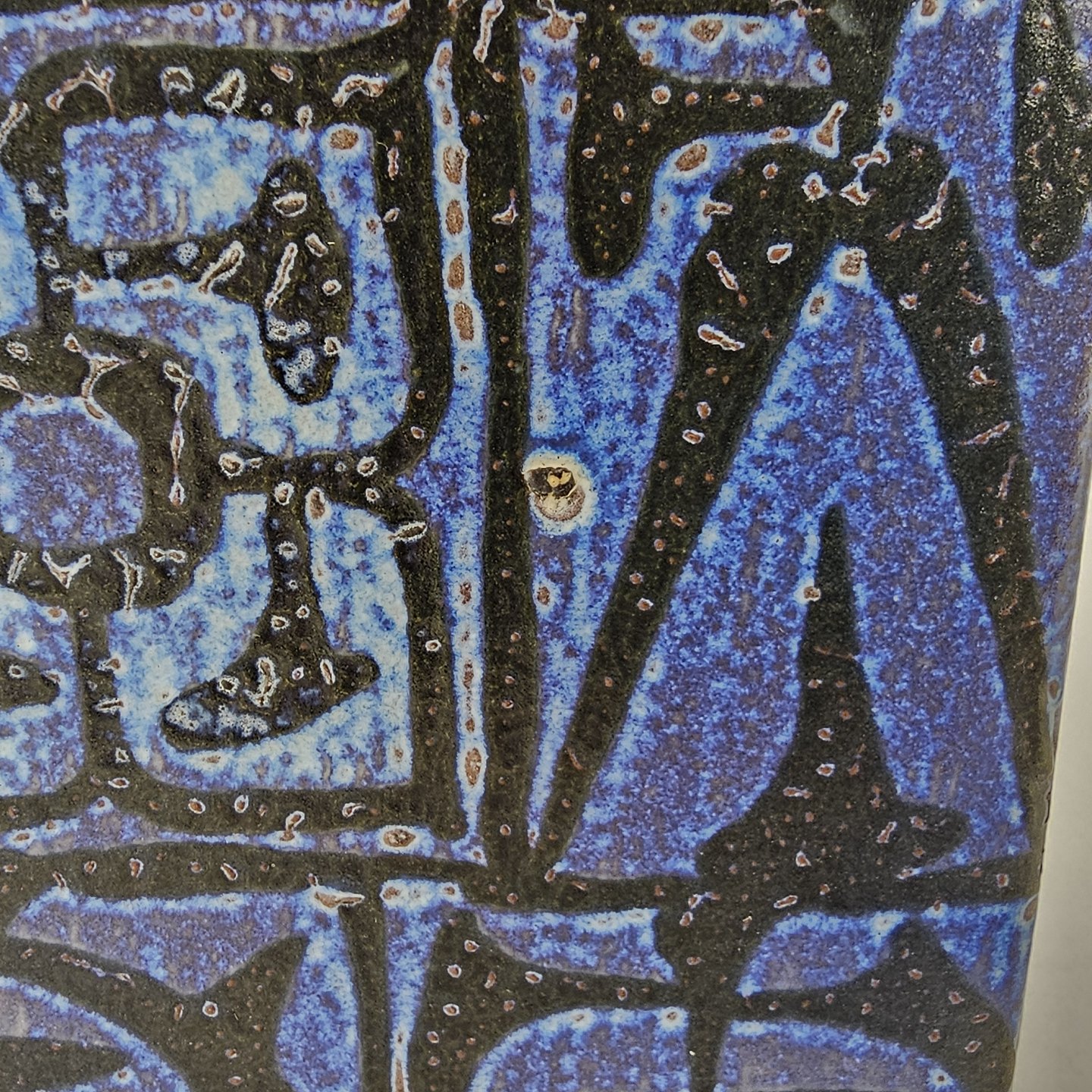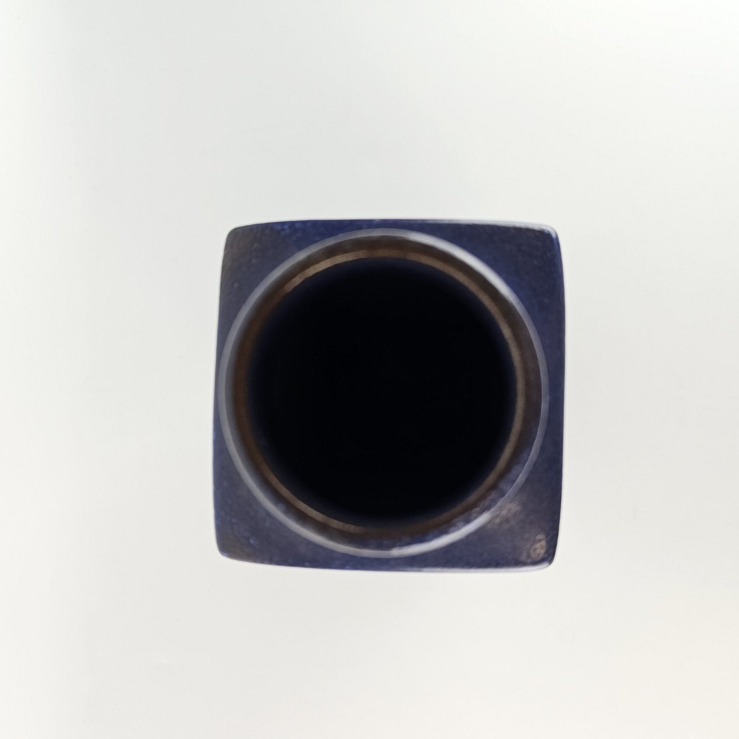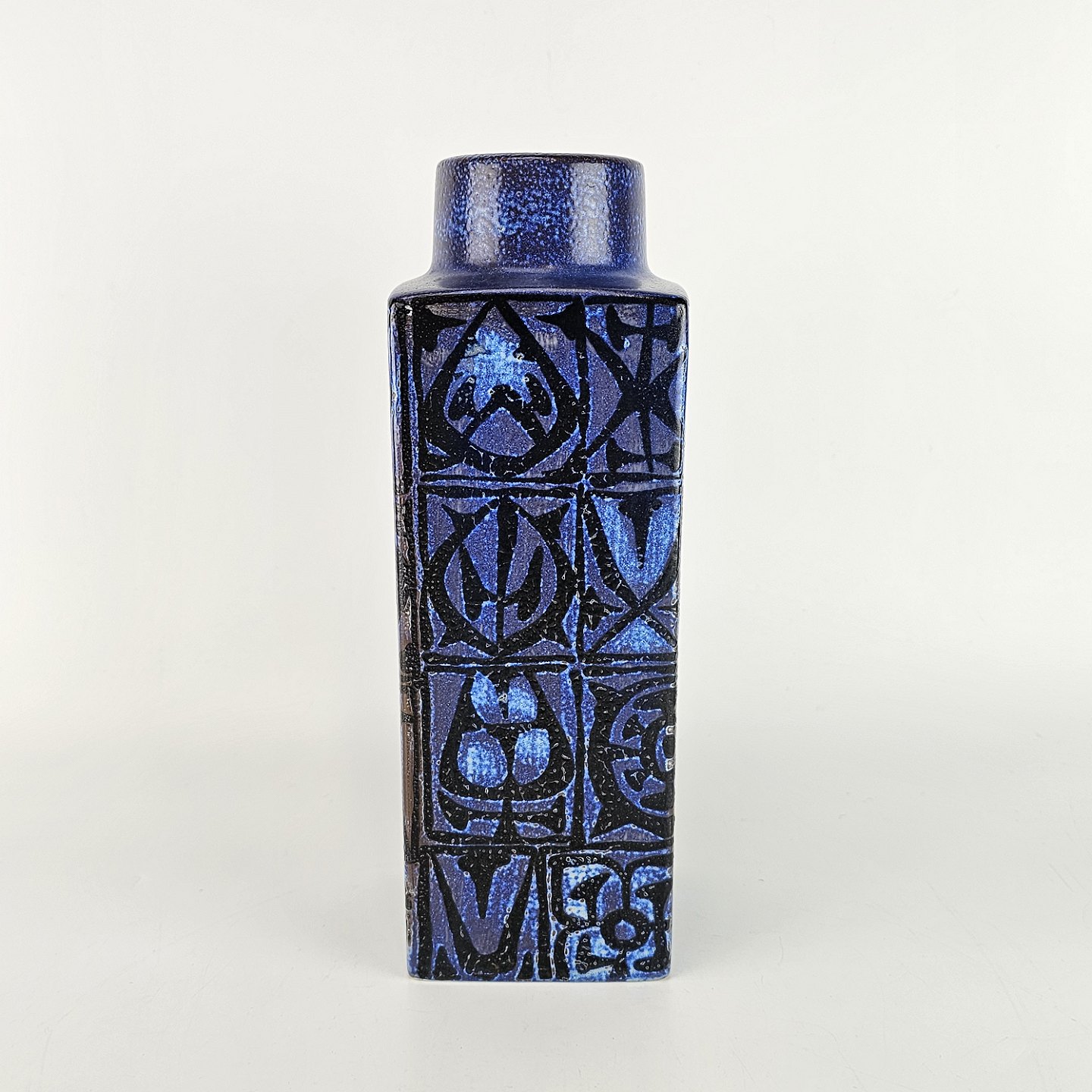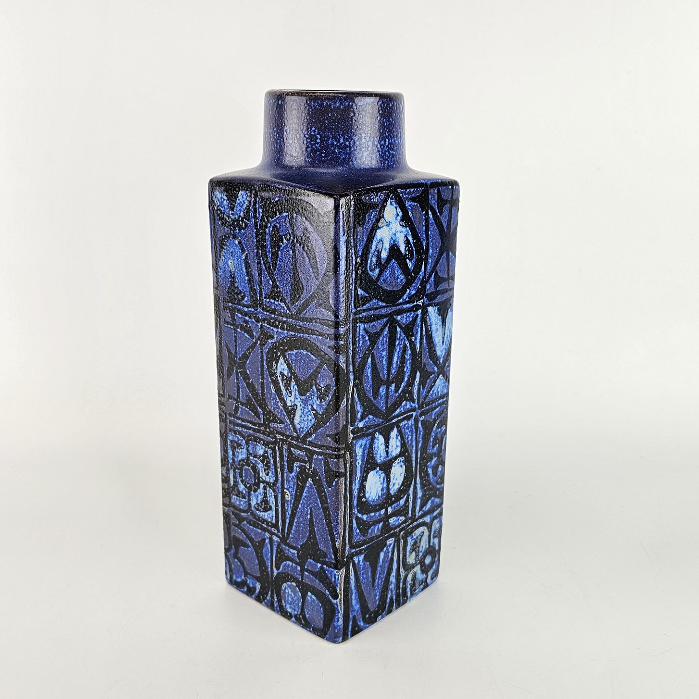 Høj kvadratisk vase, i mørkeblå nuancer, af fajance.