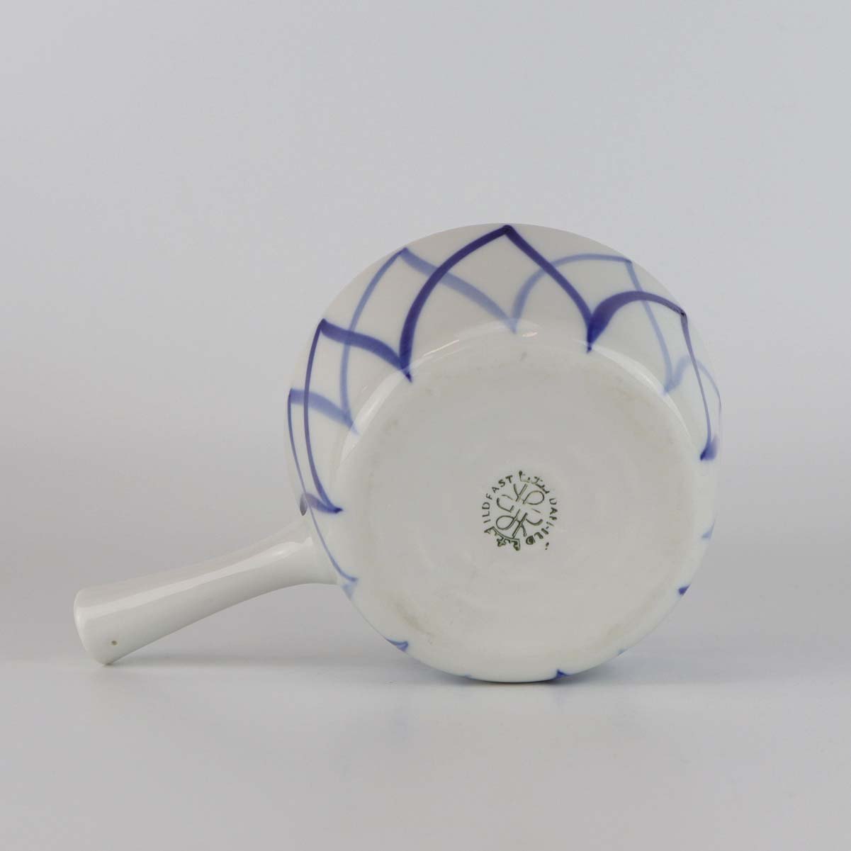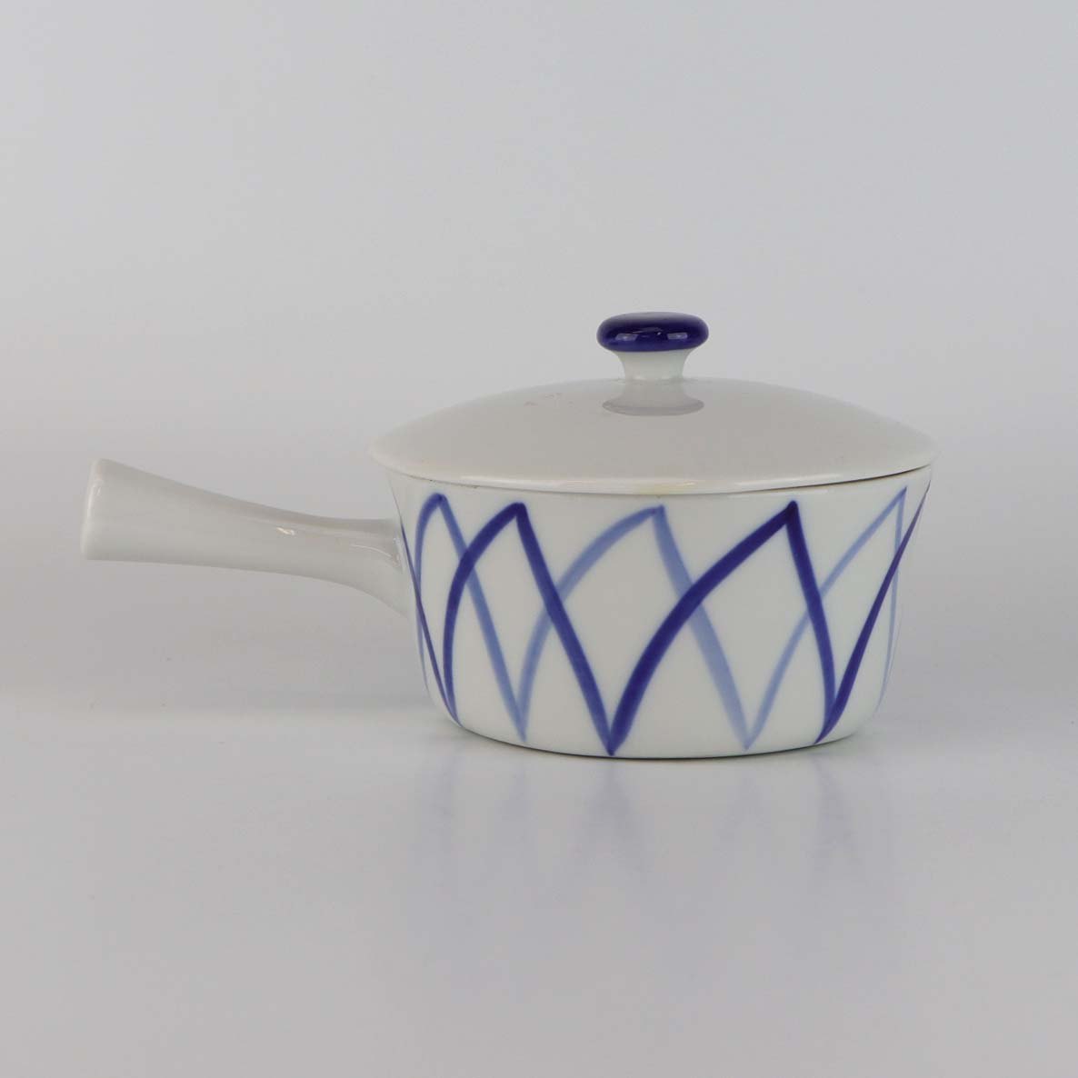 Smørnæb med låg i porcelæn fra stellet Dan-Ild 40, som også er kendt under navne som Blå Flamme eller Harlekin.