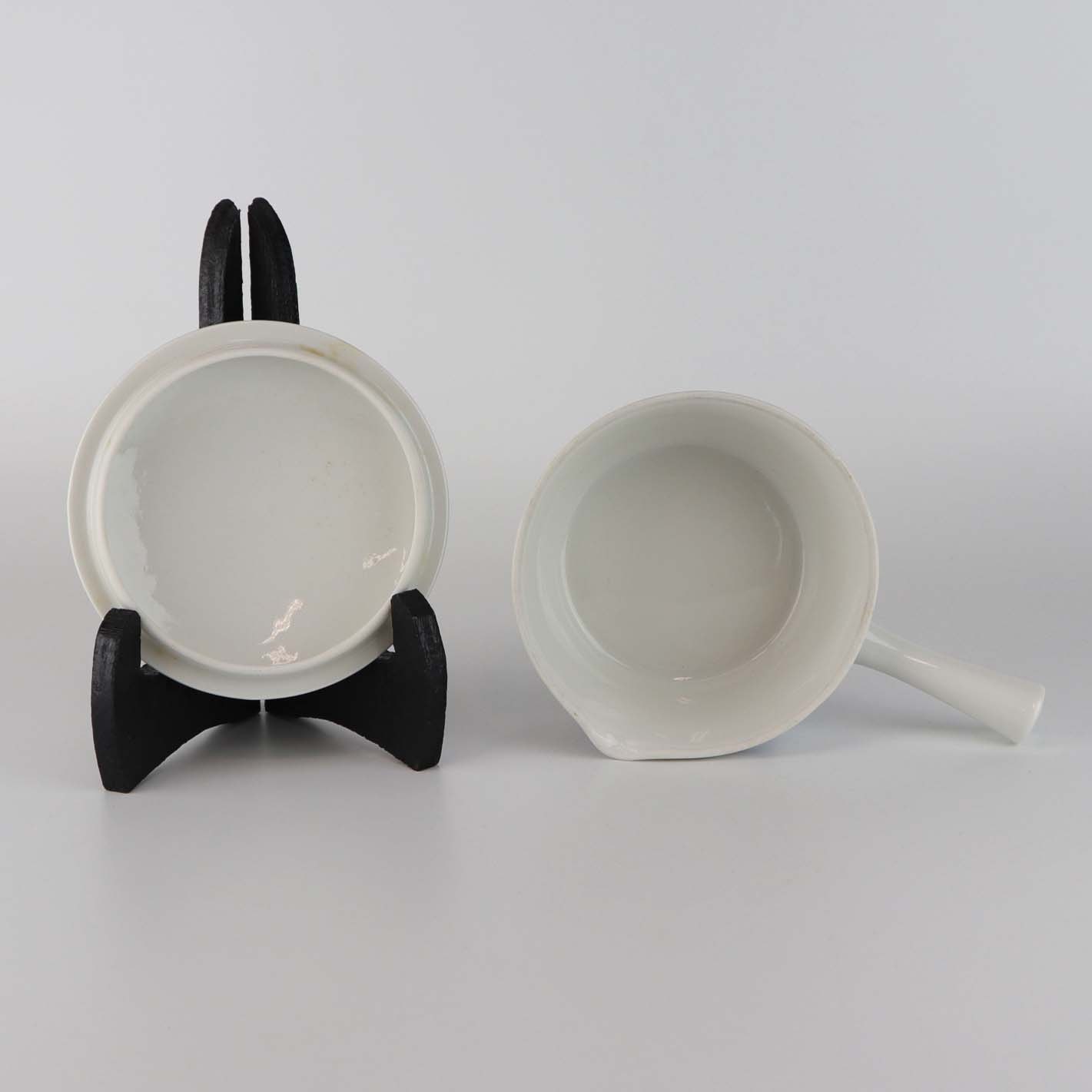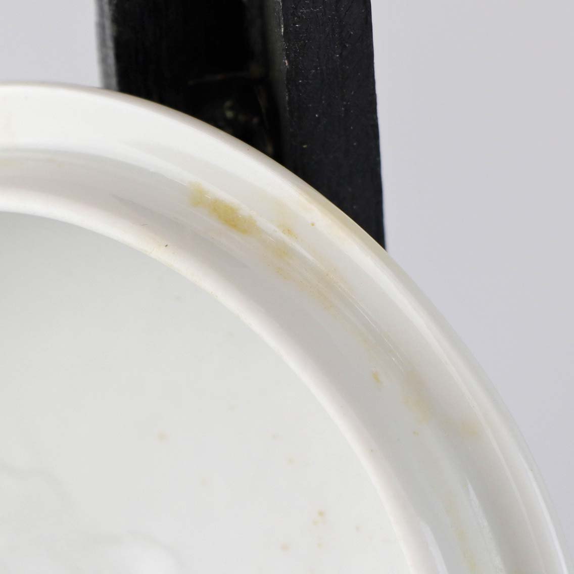 Fremstår med mindre ujævnheder i glasuren samt indvendige brugsspor ved lågkant