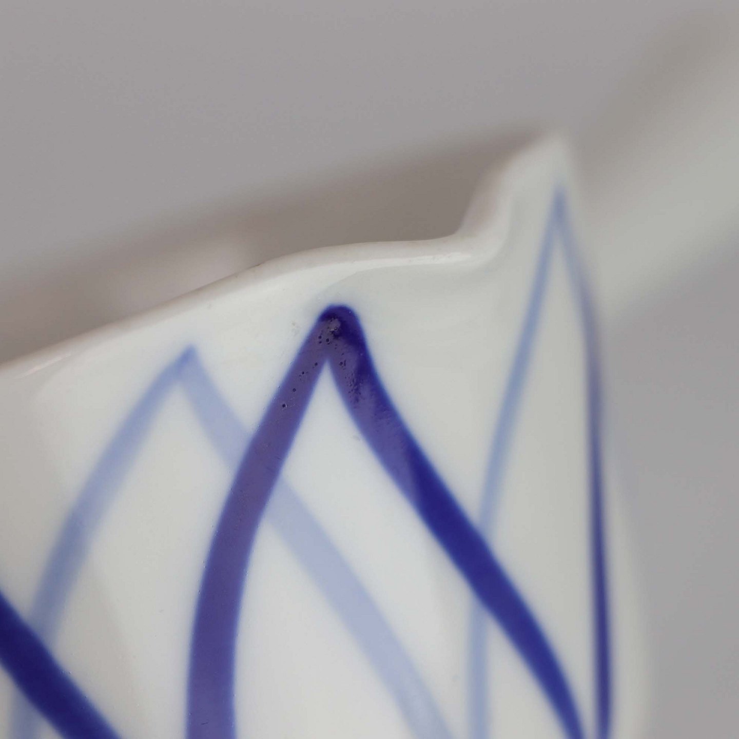 Blå Flamme er hvidt ildfast porcelæn, dekoreret med blå striber, der ligner flammer. Brugsspor kan forekomme