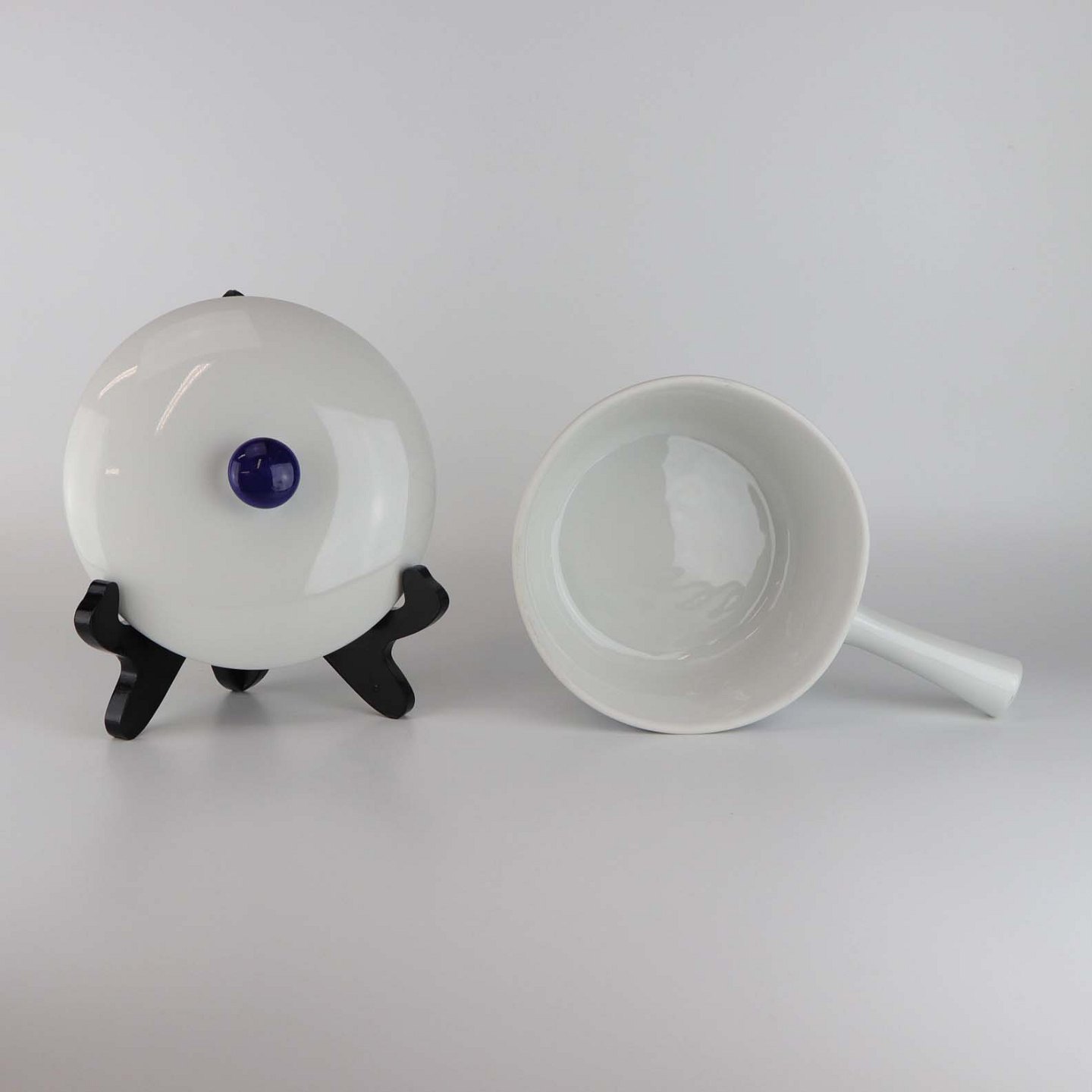 Lille gryde med låg i porcelæn fra stellet Dan-Ild 40, som også er kendt under navne som Blå Flamme eller Harlekin.