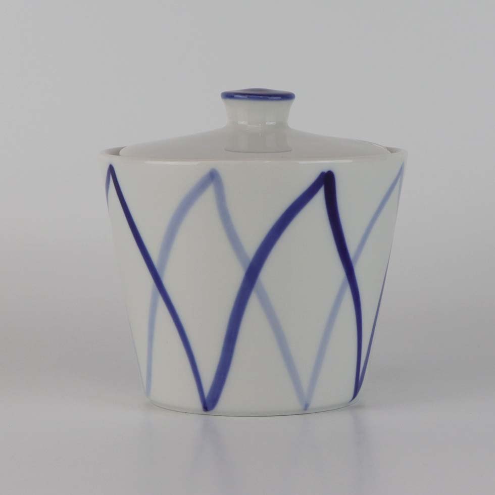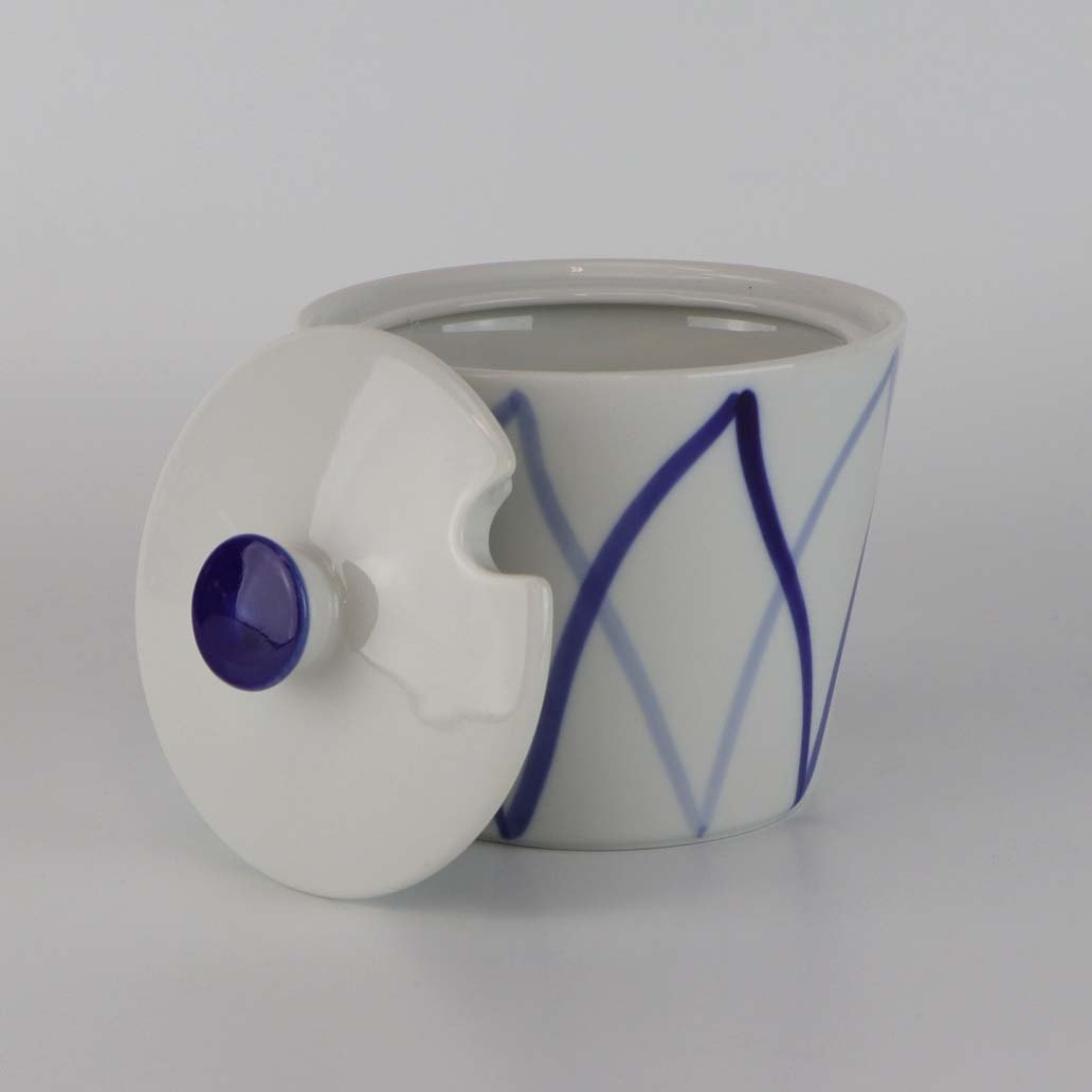 Marmeladekrukke med låg i porcelæn fra stellet Dan-Ild 40, som også er kendt under navne som Blå Flamme eller Harlekin.