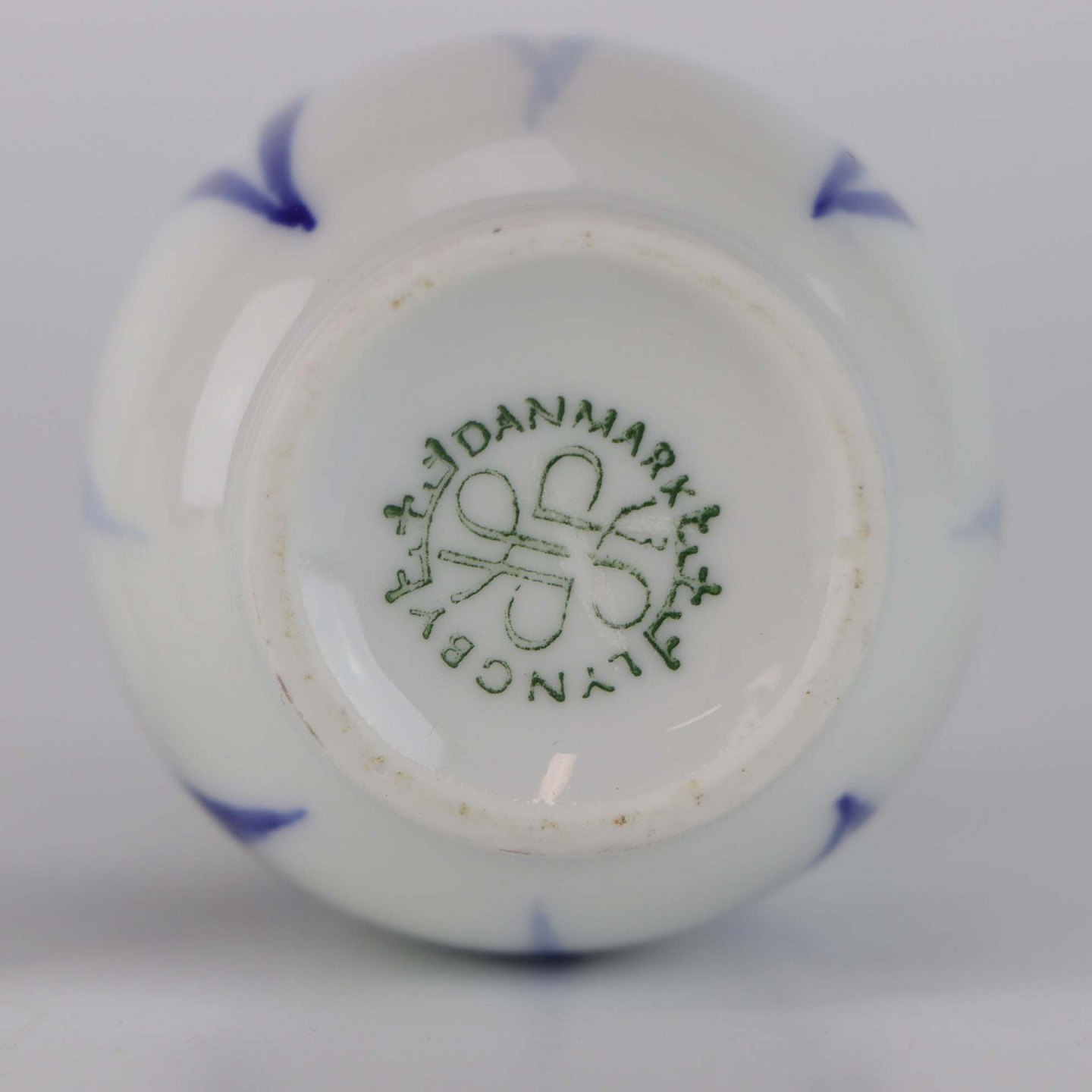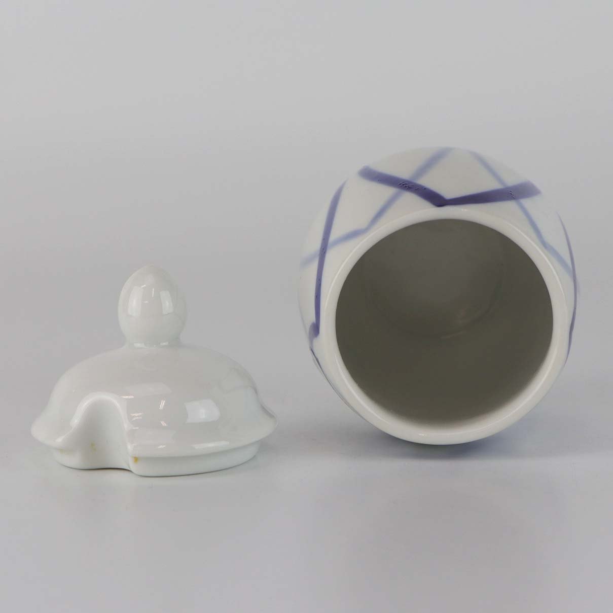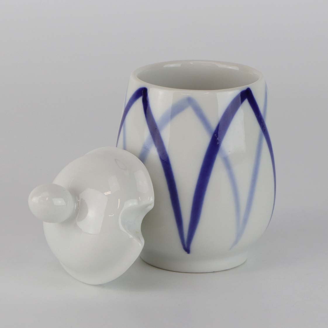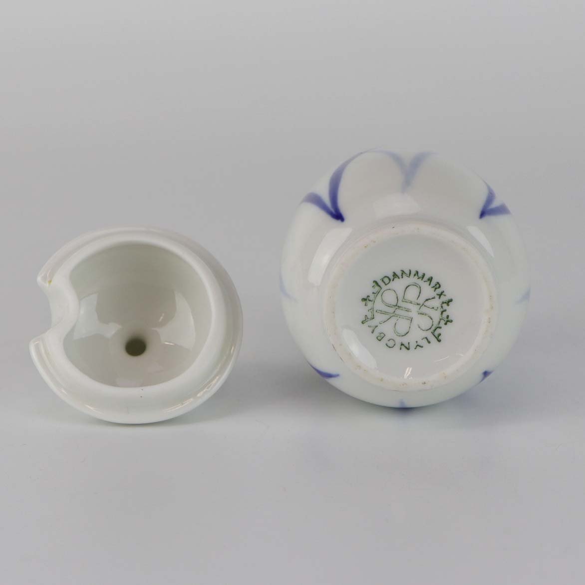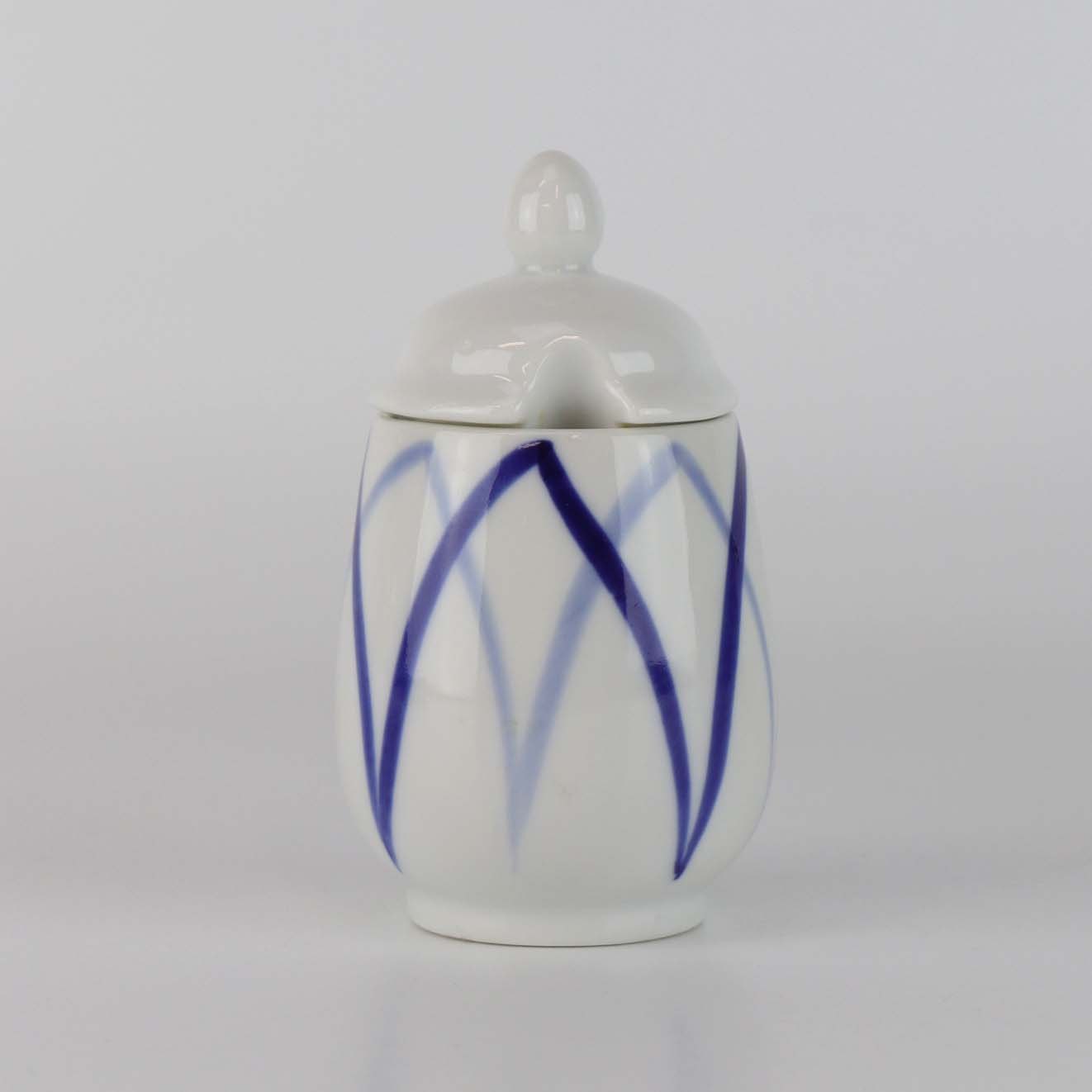 Lågkrukke til sennep med hvidt låg i porcelæn fra stellet Dan-Ild 40, som også er kendt under navne som Blå Flamme eller Harlekin.