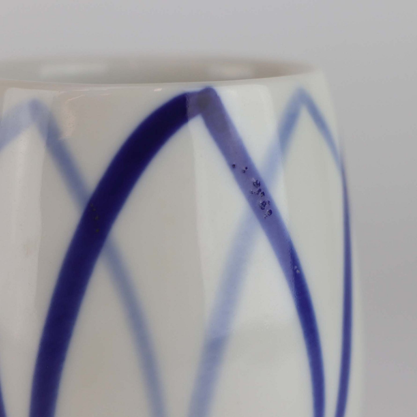 Blå Flamme er hvidt ildfast porcelæn, dekoreret med blå striber, der ligner flammer. Brugsspor kan forekomme