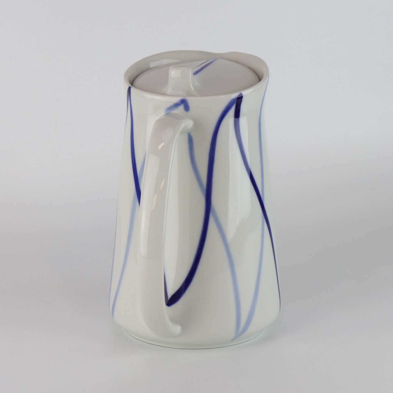 Kande til chokolade med låg i porcelæn fra stellet Dan-Ild 40, som også er kendt under navne som Blå Flamme eller Harlekin.