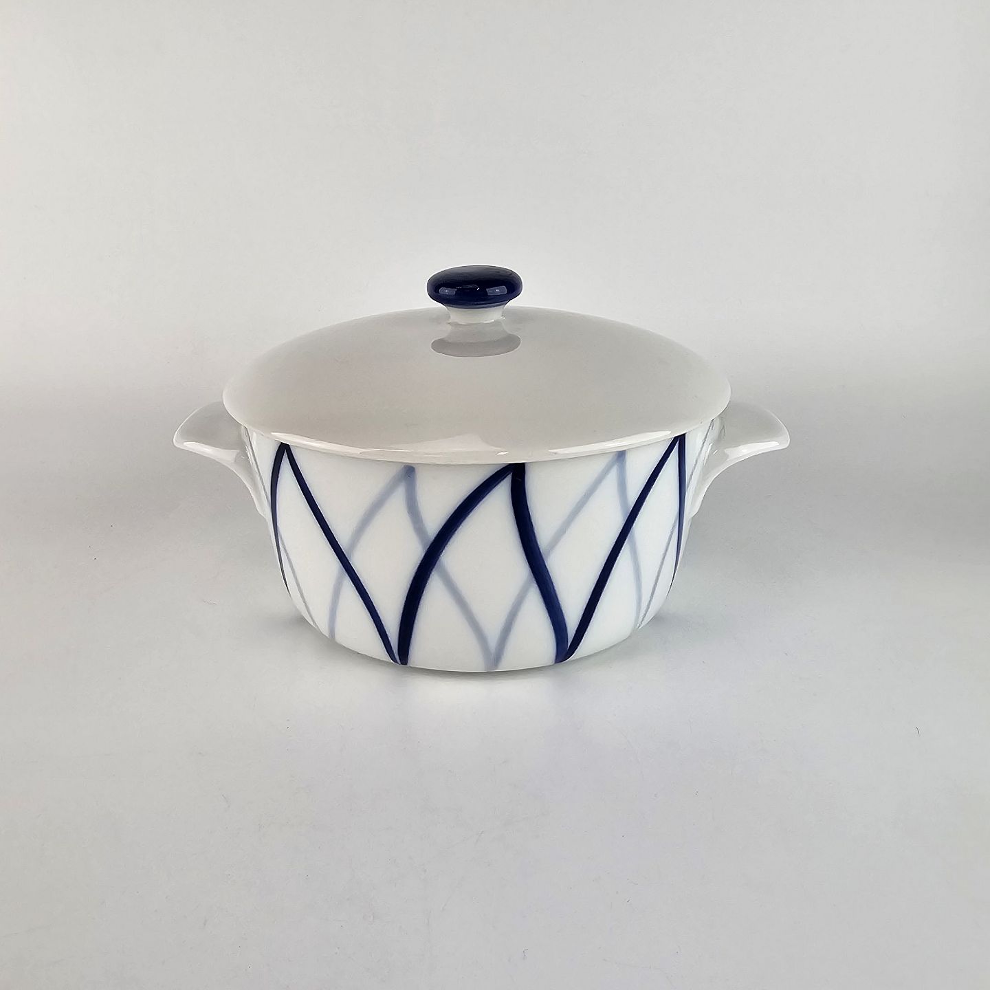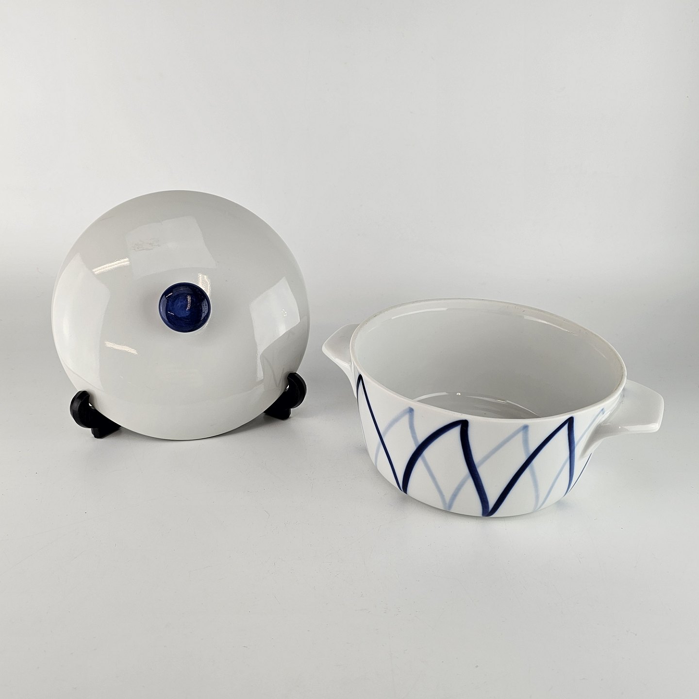 Blå Flamme er hvidt ildfast porcelæn, dekoreret med blå striber, der ligner flammer.