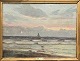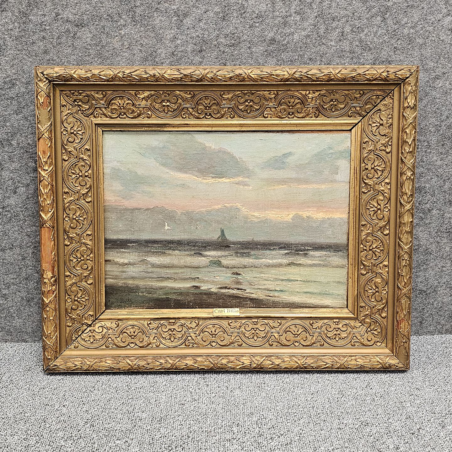 Oliemaleri på plade, med motiv af hav med et sejlskib. På rammen sidder et skilt med teksten Carl Bille