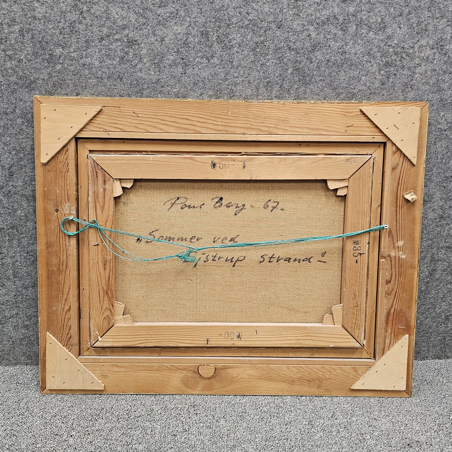 Oliemaleri på lærred med motiv af en strand. Titel "Sommer ved Ejstrup Strand"