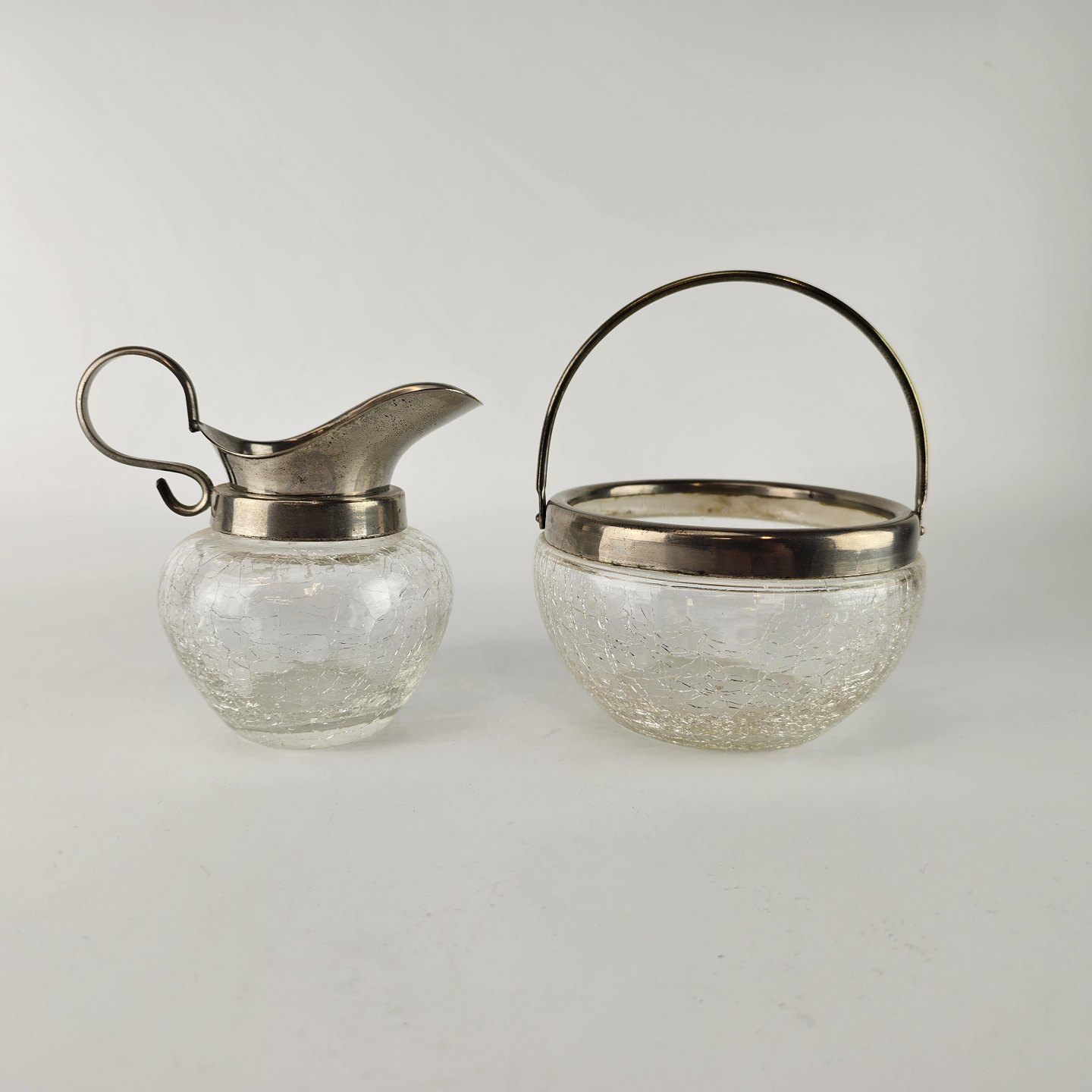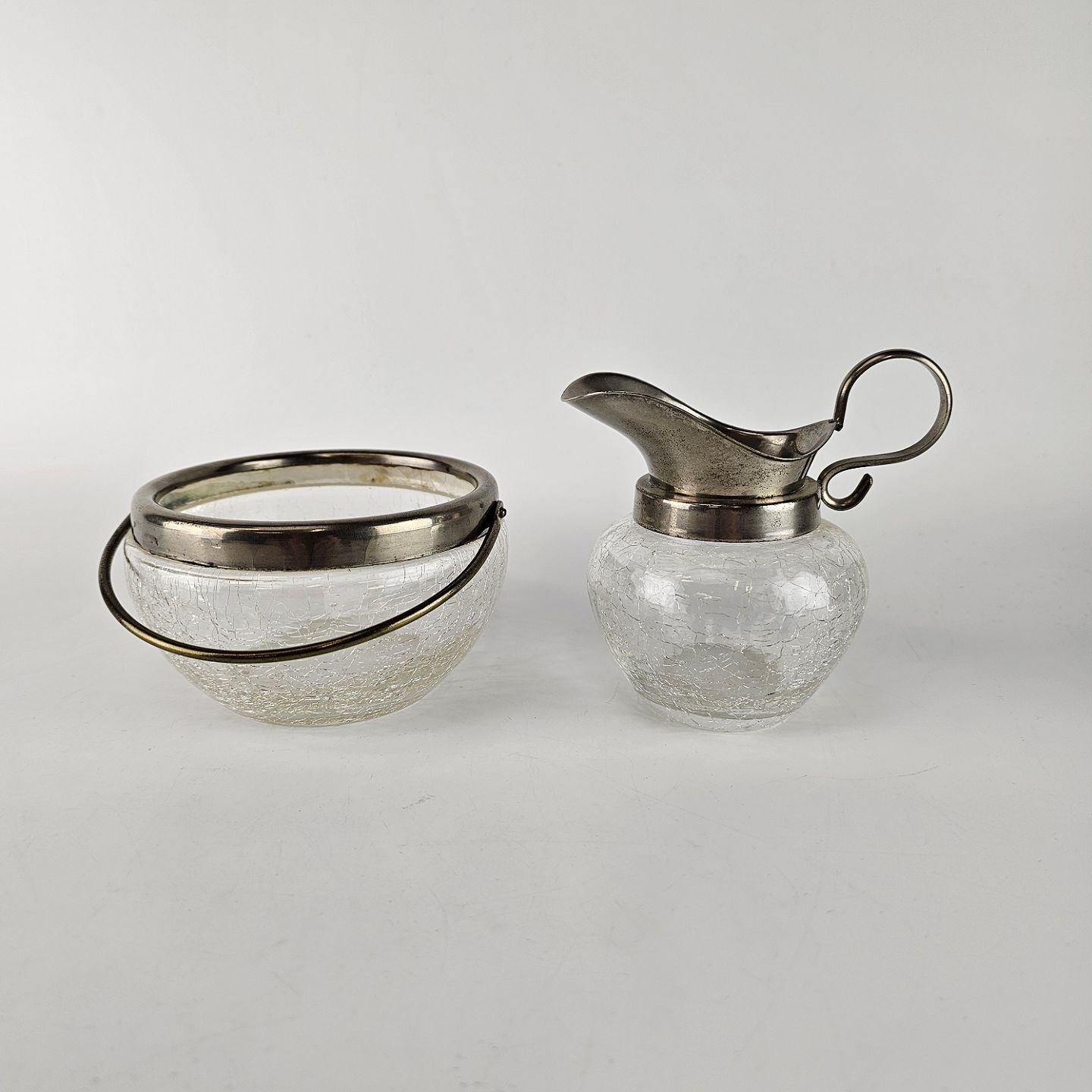 Sæt med flødekande og sukkerskål, begge af krakele glas og med kant af sølvplet