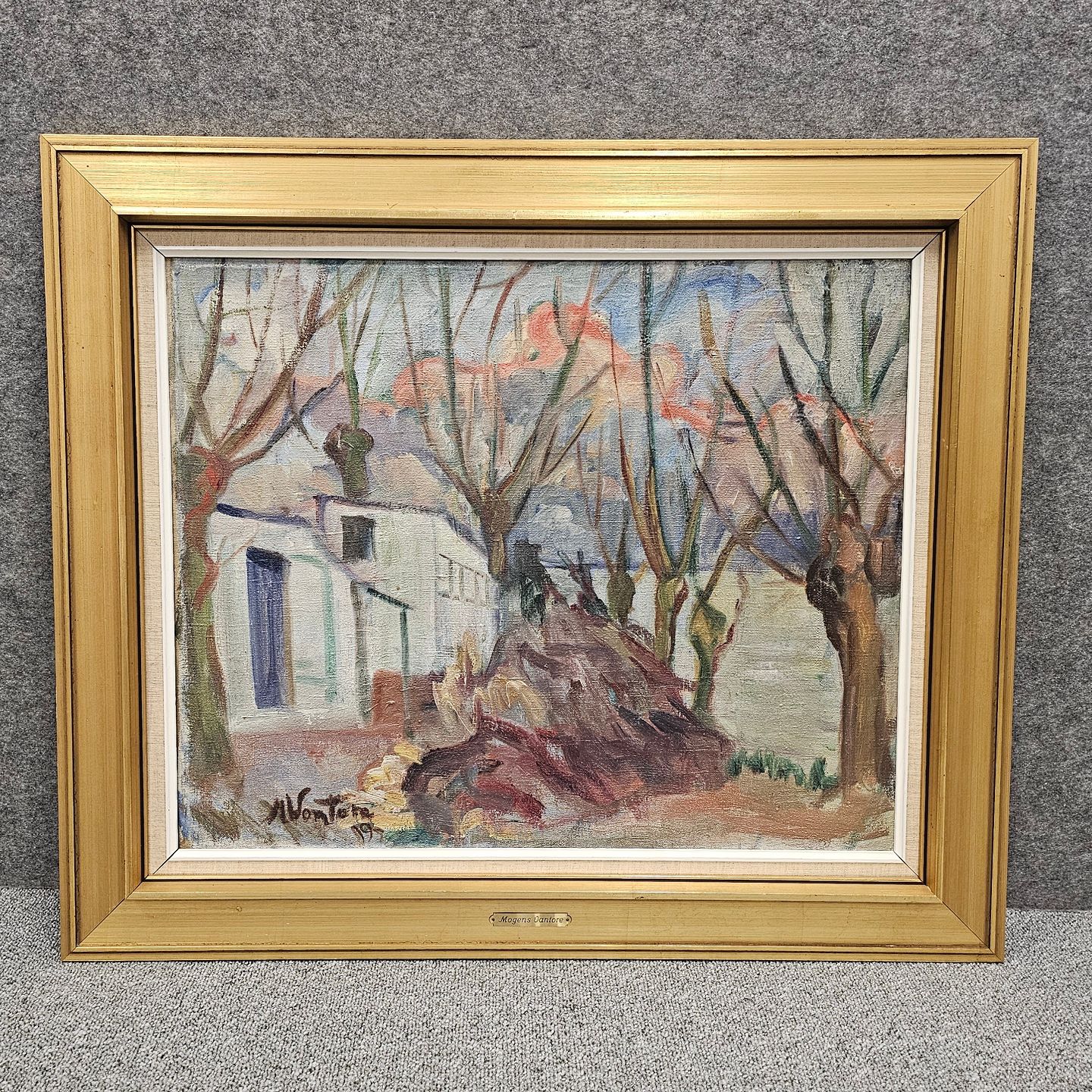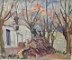 Oliemaleri på lærred, sat i guldramme, med motiv af huse og træer uden blade.