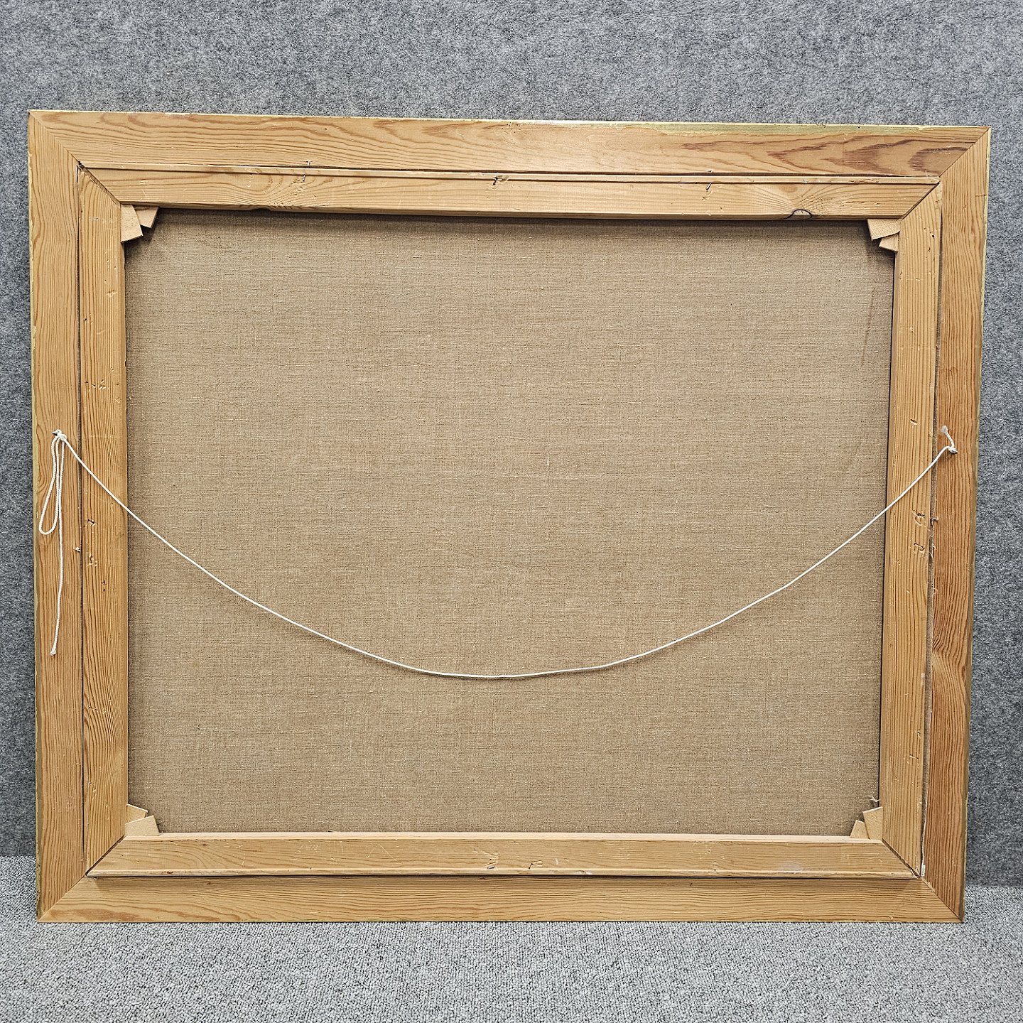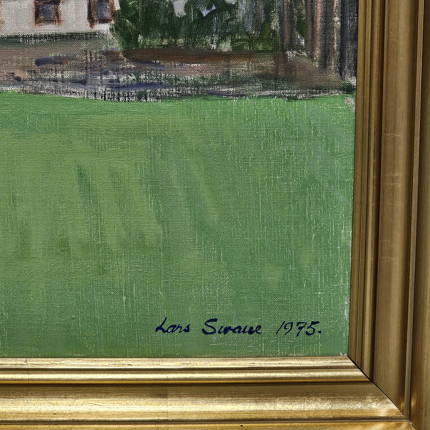 Oliemaleri på lærred, sat i guldramme, med motiv af marker, gårde og havet som baggrund.
