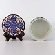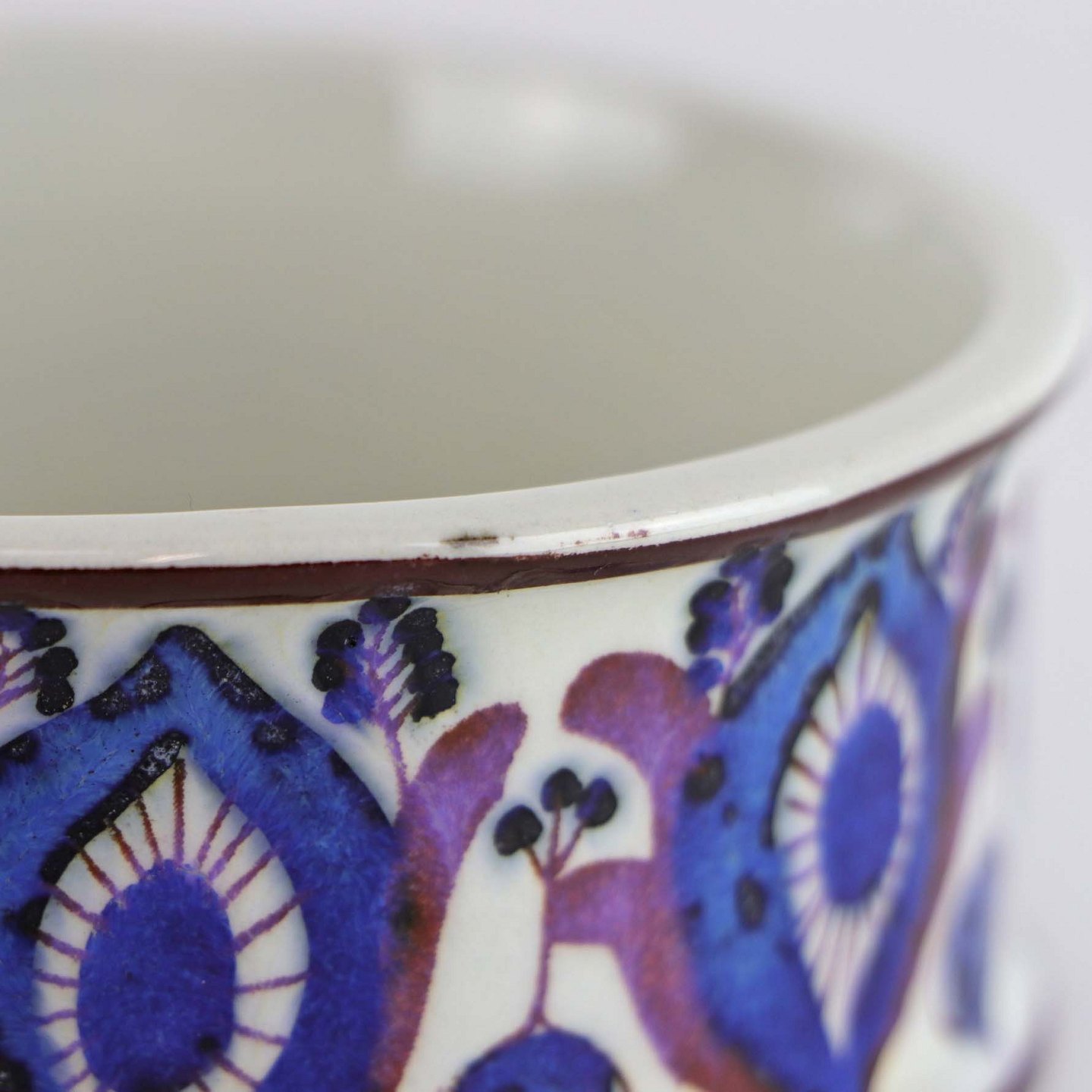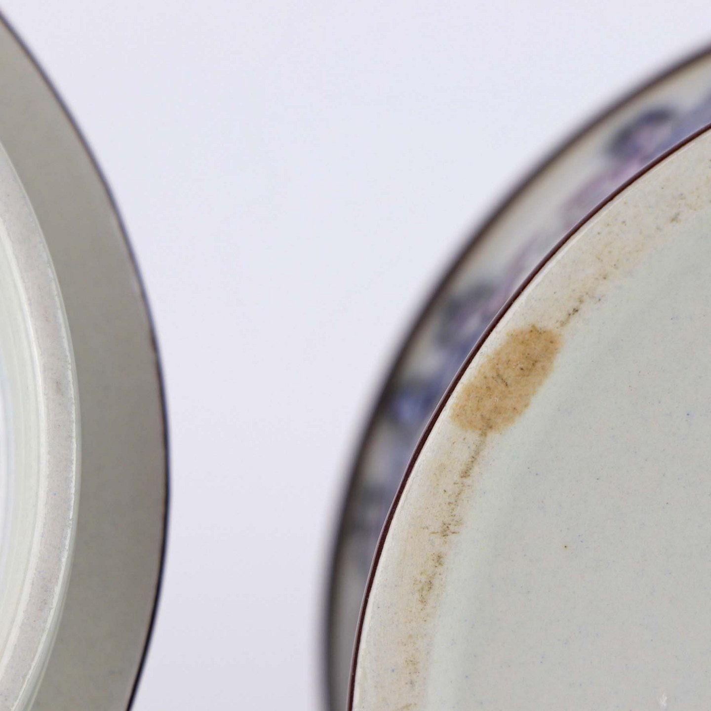 Fremstår med mindre misfarvet område under bund samt mindre mørkning under glasur ved topkanten.