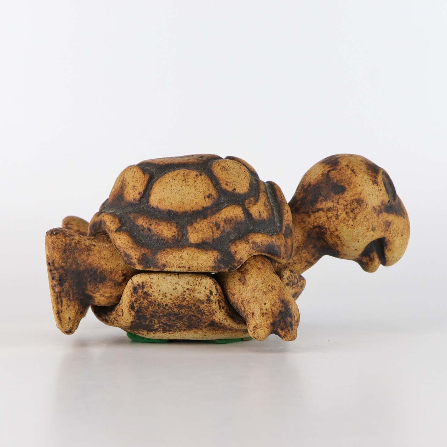 Figur i keramik med motiv af skildpadde. Figuren er tre-delt og består af over- og underskjold samt afklædt padde.
