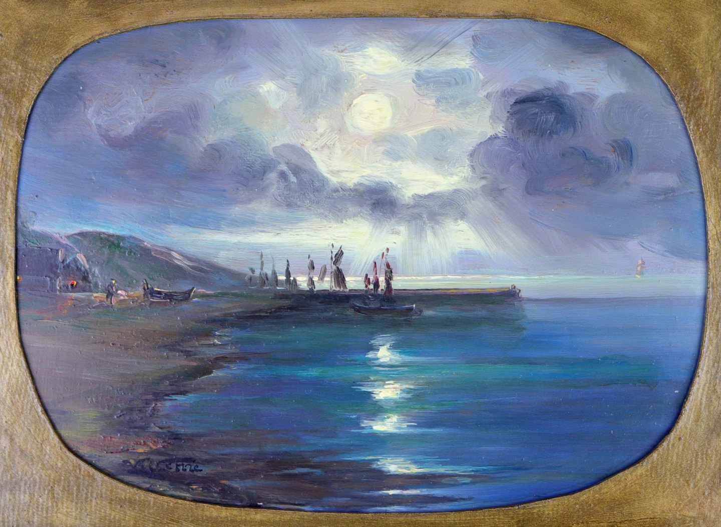 Gammel maleri på plade i malet gips ramme med motiv af både på land ved kystlinje.