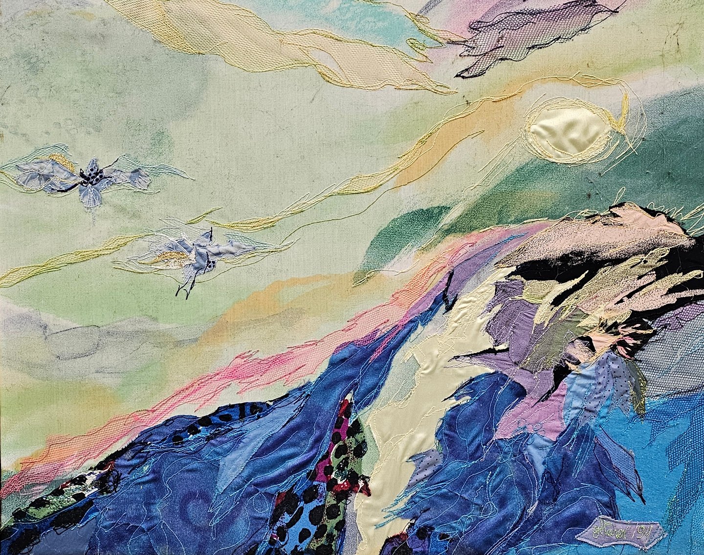 Billede lavet af stof, med abstrakt motiv af fugle.
