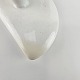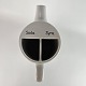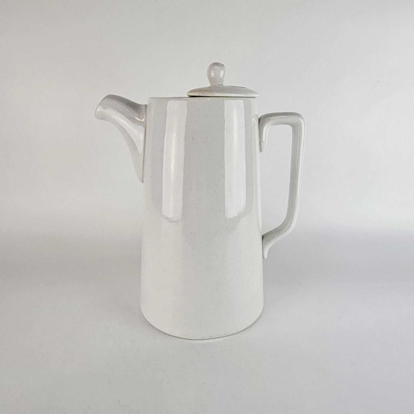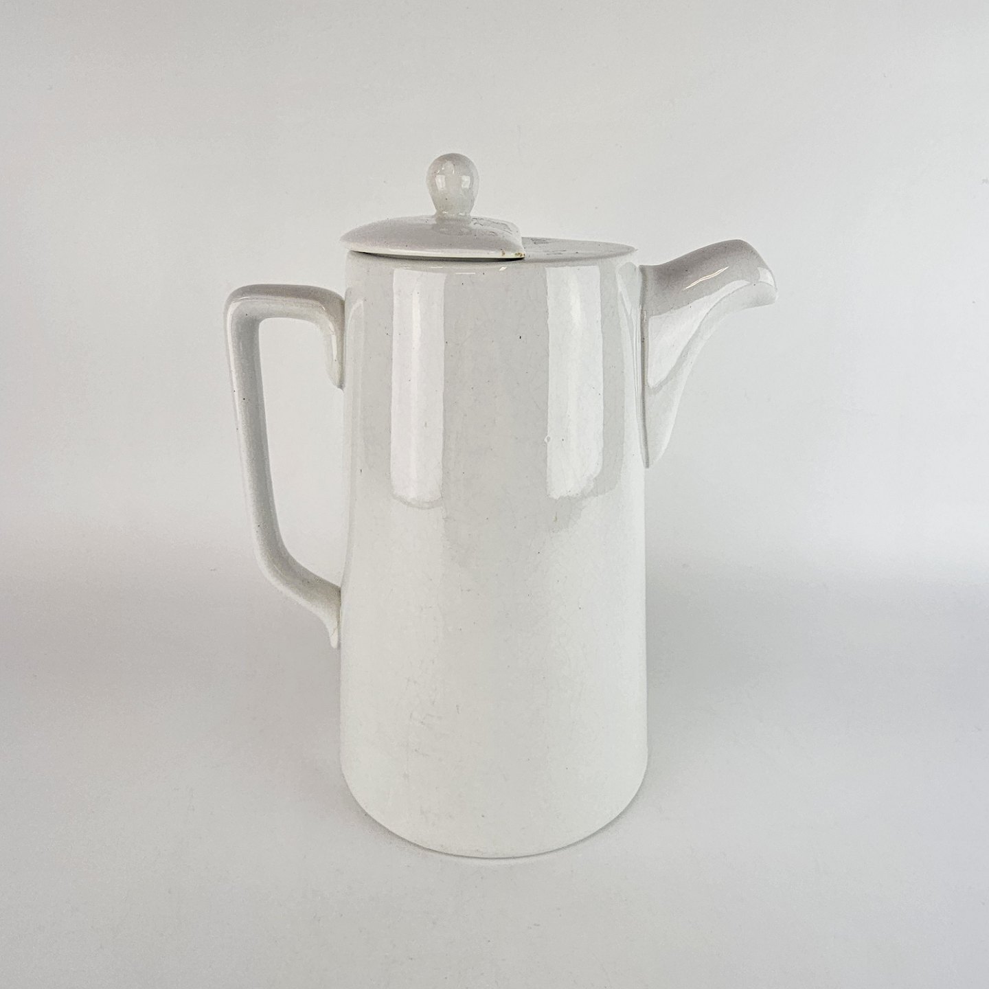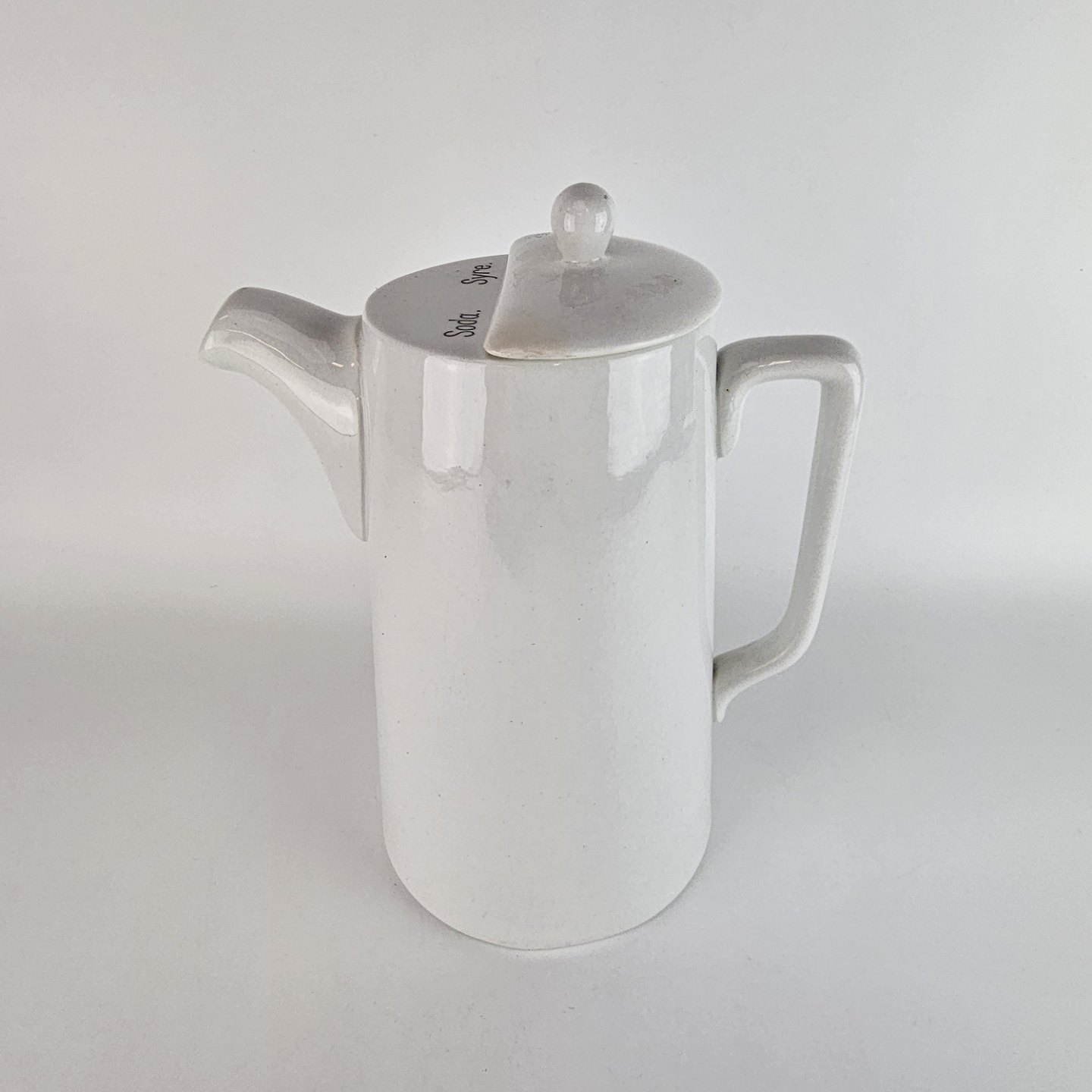 Høj hvid kande, af fajance, med to rum i og to huller i tuden.