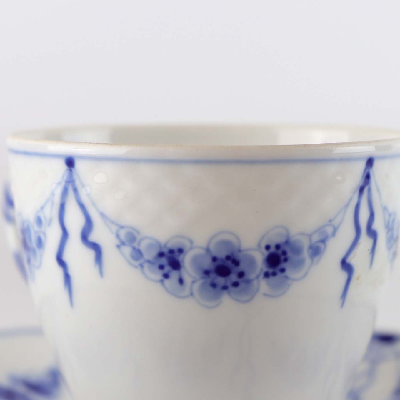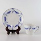 Service i hvidt porcelæn med skelform og motiv af guirlander med blå blomster.