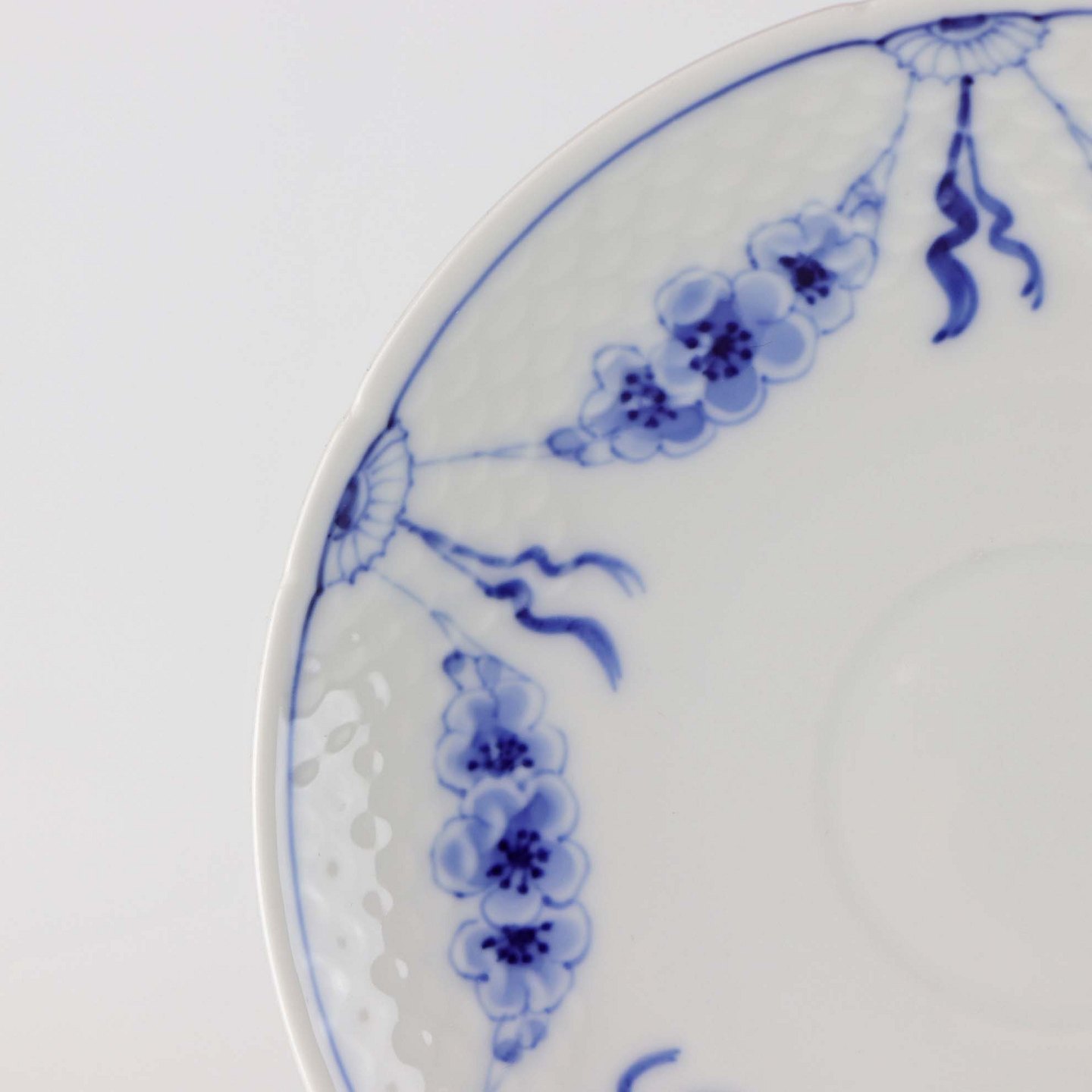 Service i hvidt porcelæn med skelform og motiv af guirlander med blå blomster.