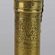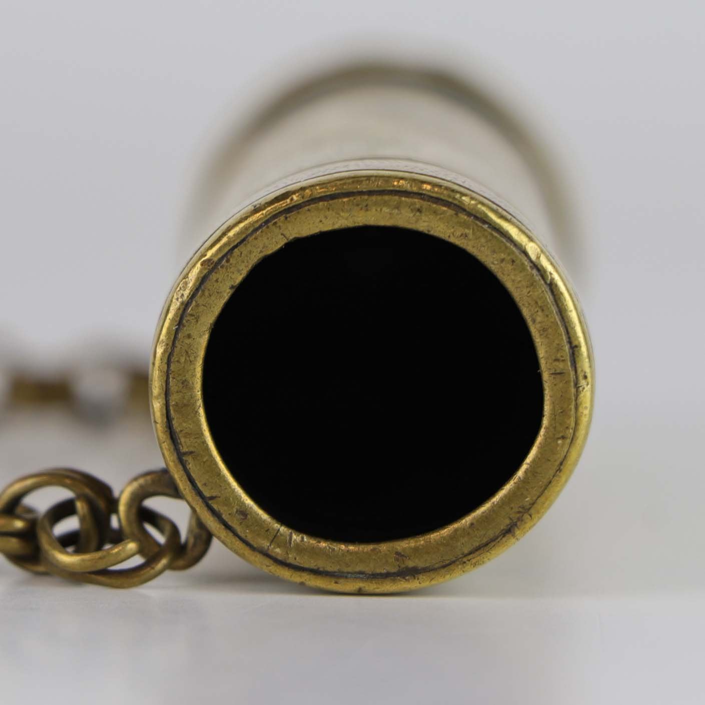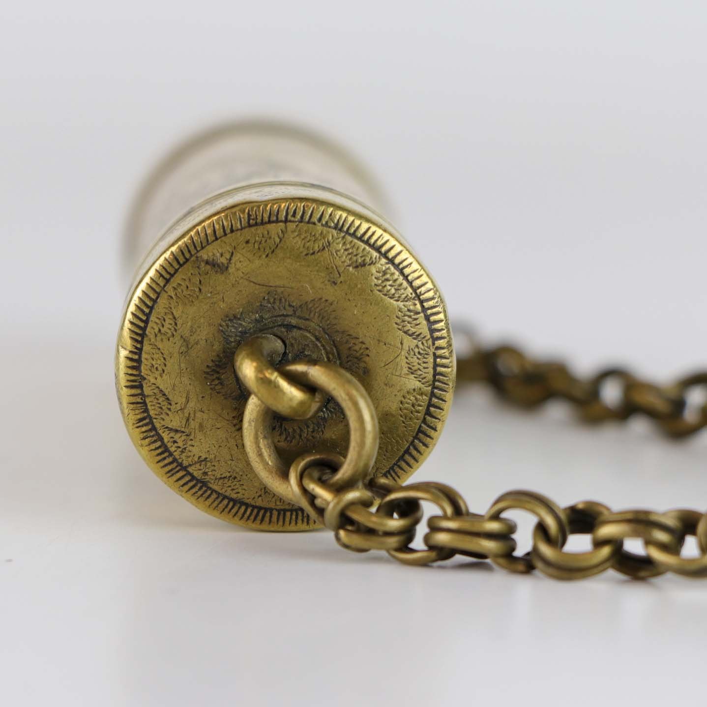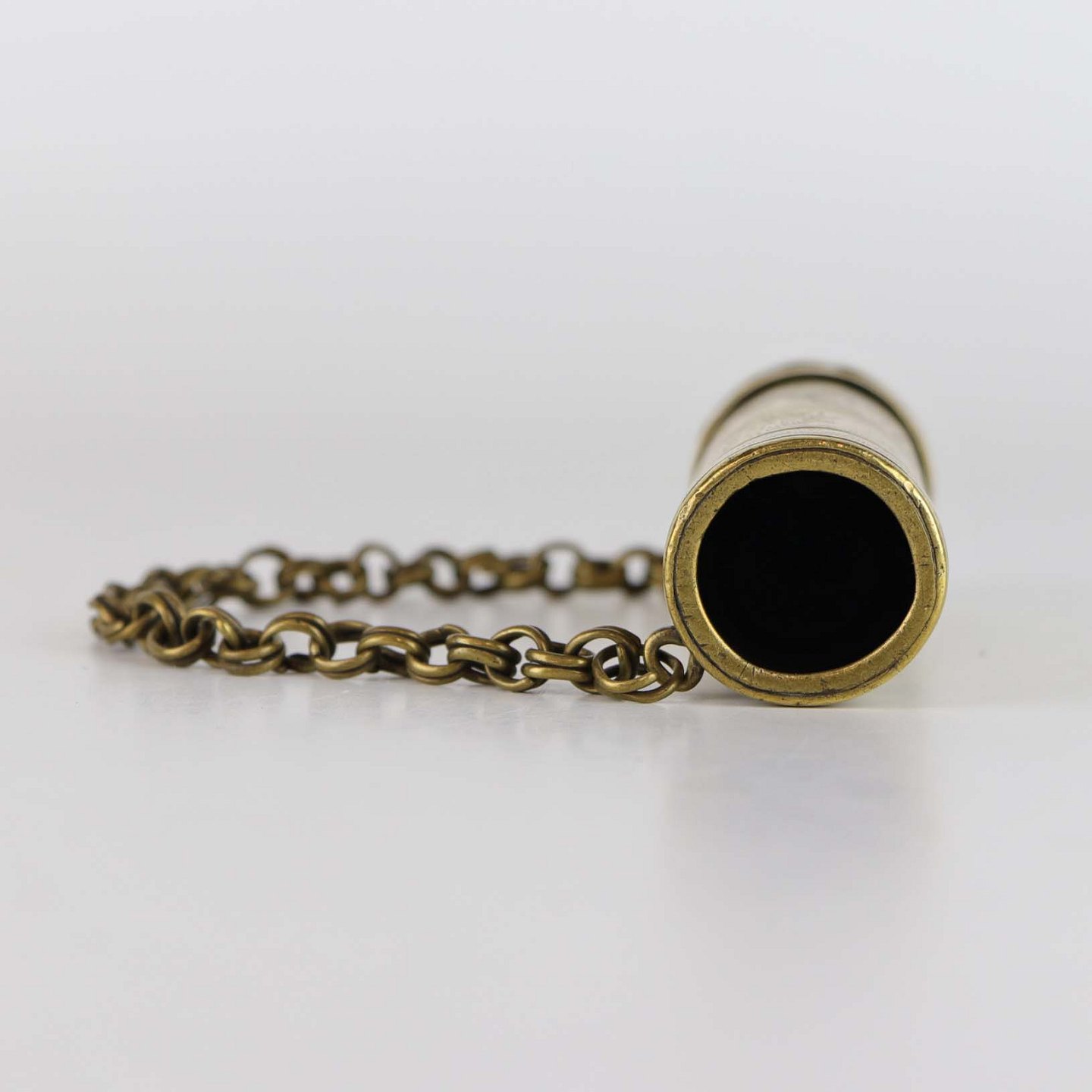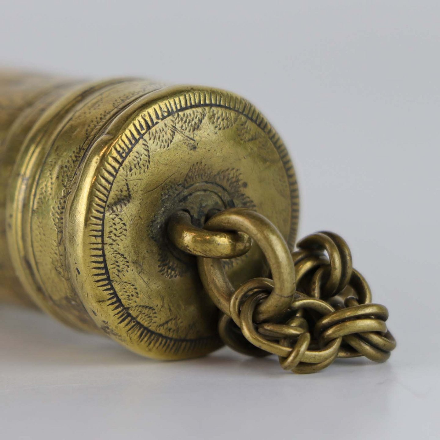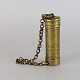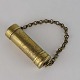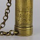 Antik tobakshylster i solid messing med kæde og tekst fra 1800-tallet