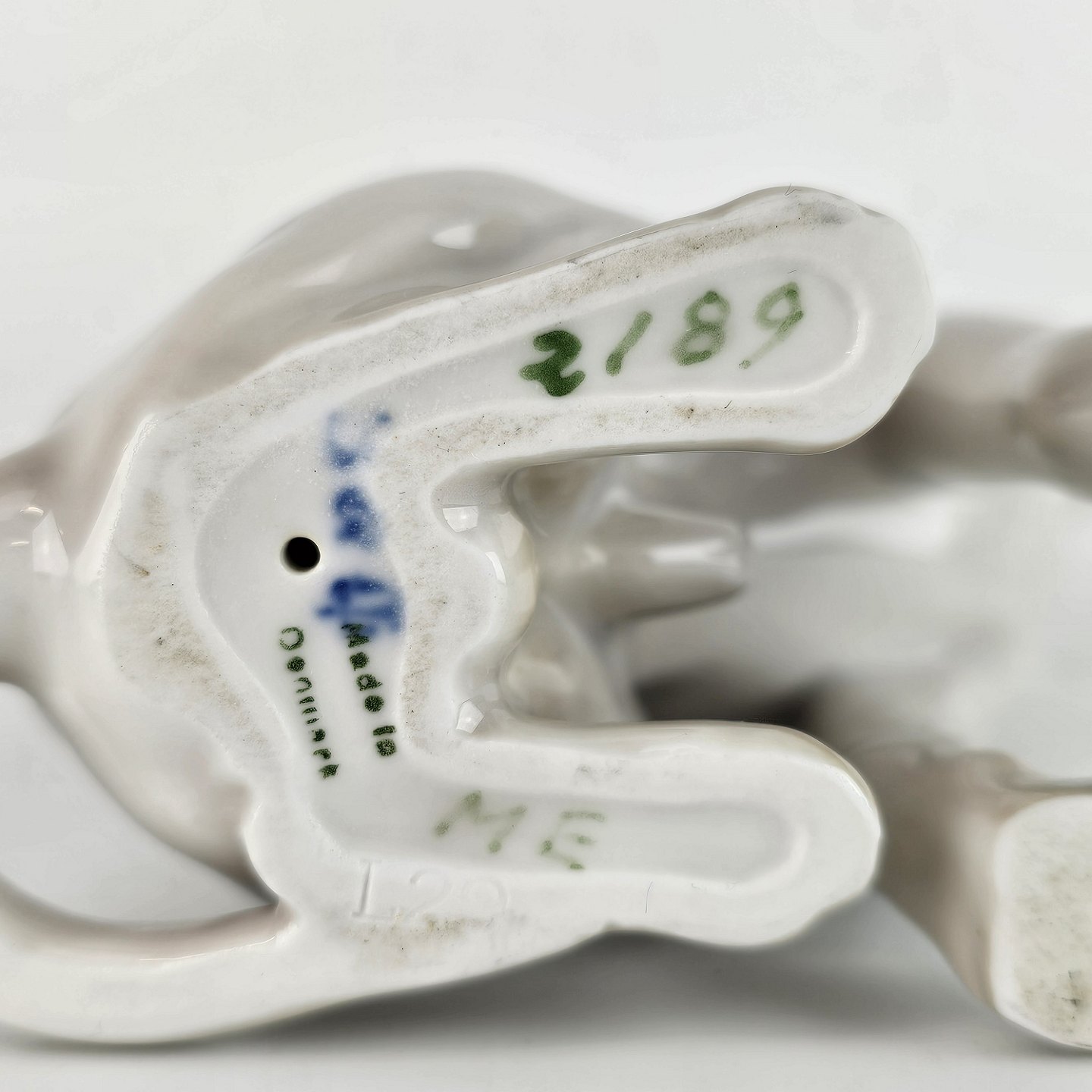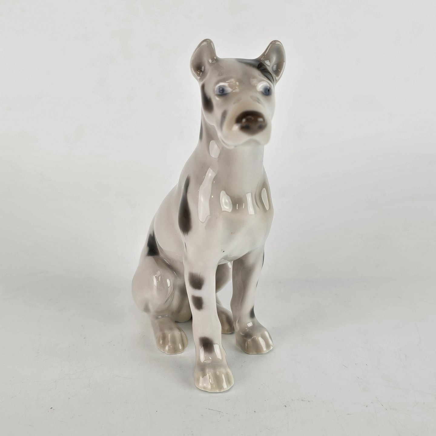 Figur i porcelæn med motiv af en siddende Gran Danois hund med sorte pletter.