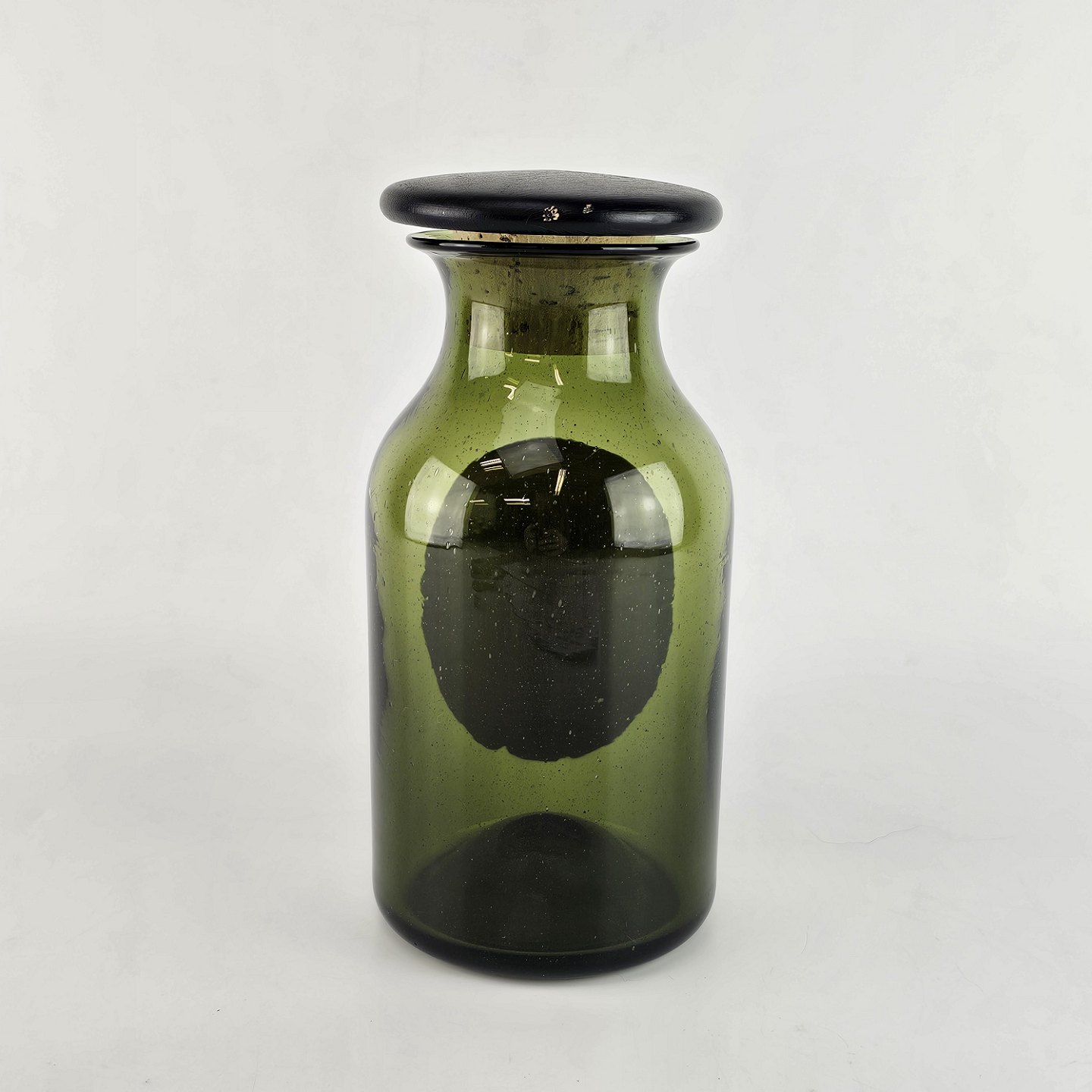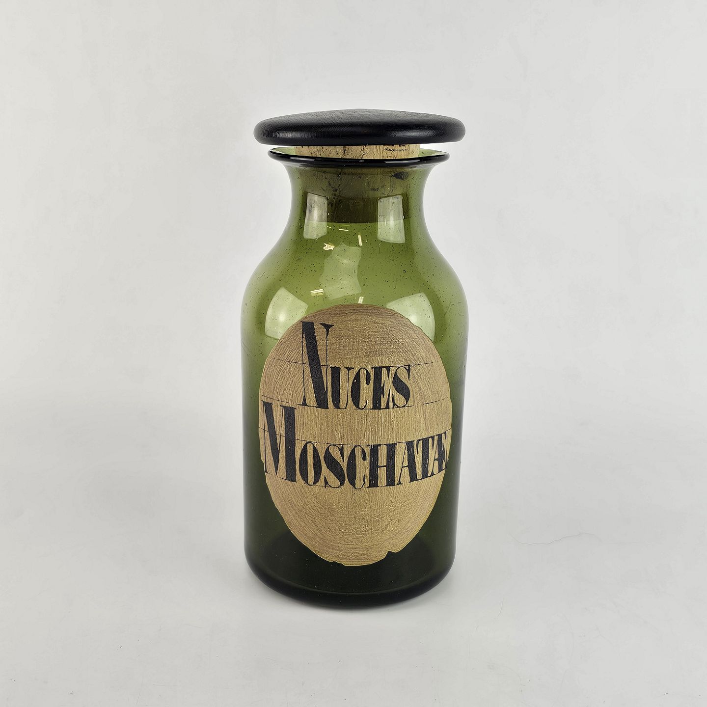 Mørkegrøn apotekerflaske med prop, med teksten Nuces Mochatræ