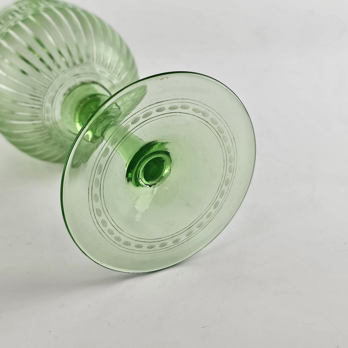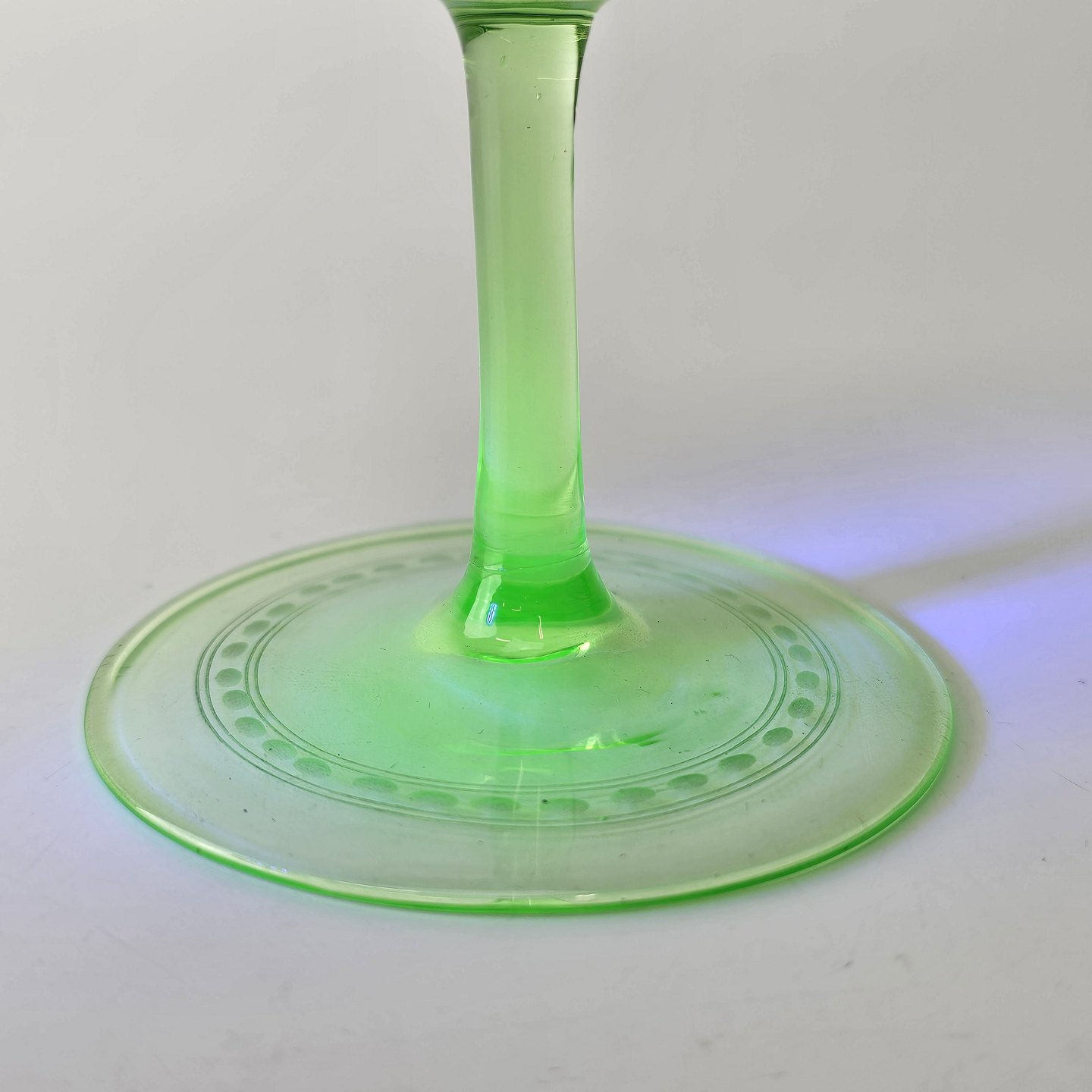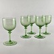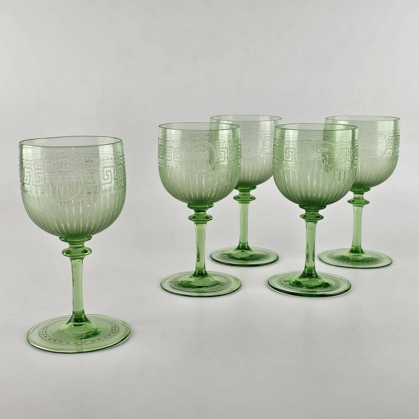 Fem vinglas i grønt glas, med indgraveret adelsmærke AR under krone.