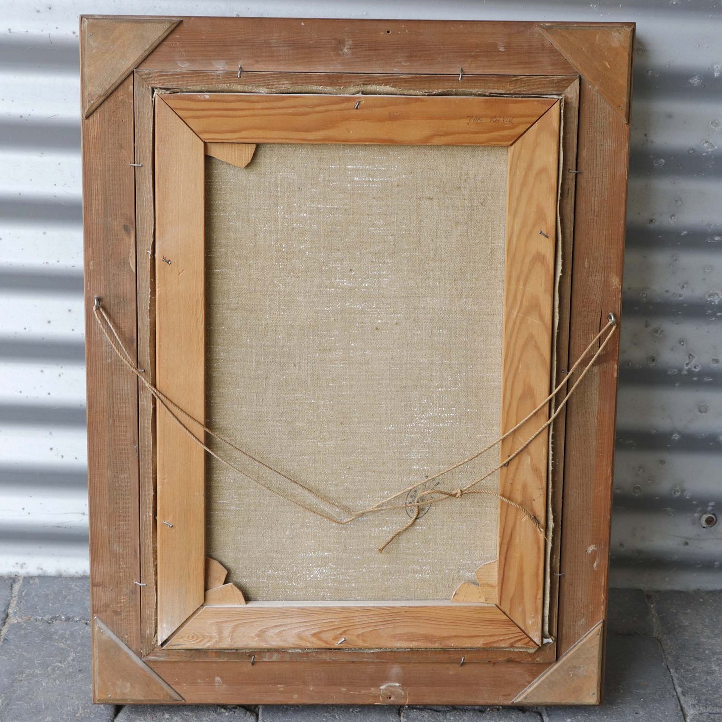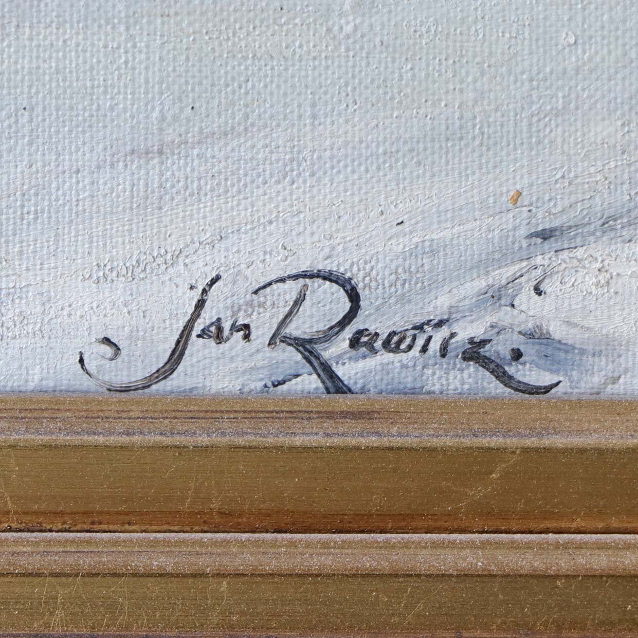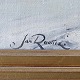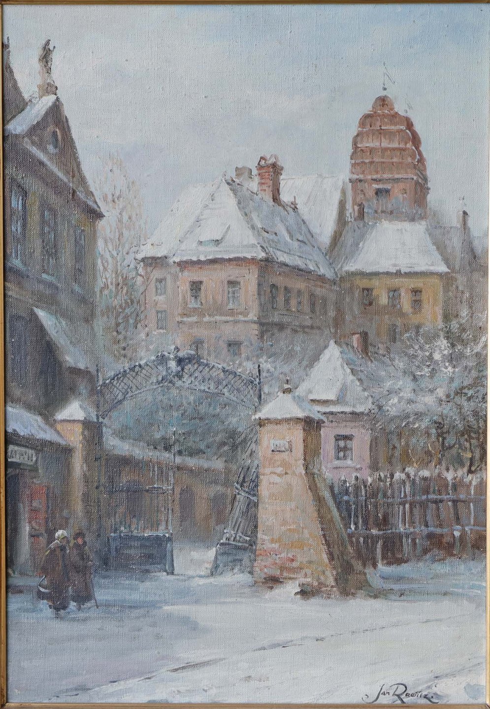 Oliemaleri på lærred i guldmalet træramme med dekoration. Vinterlig byskabsmaleri med to kvinder blandt gamle bygningsværker.