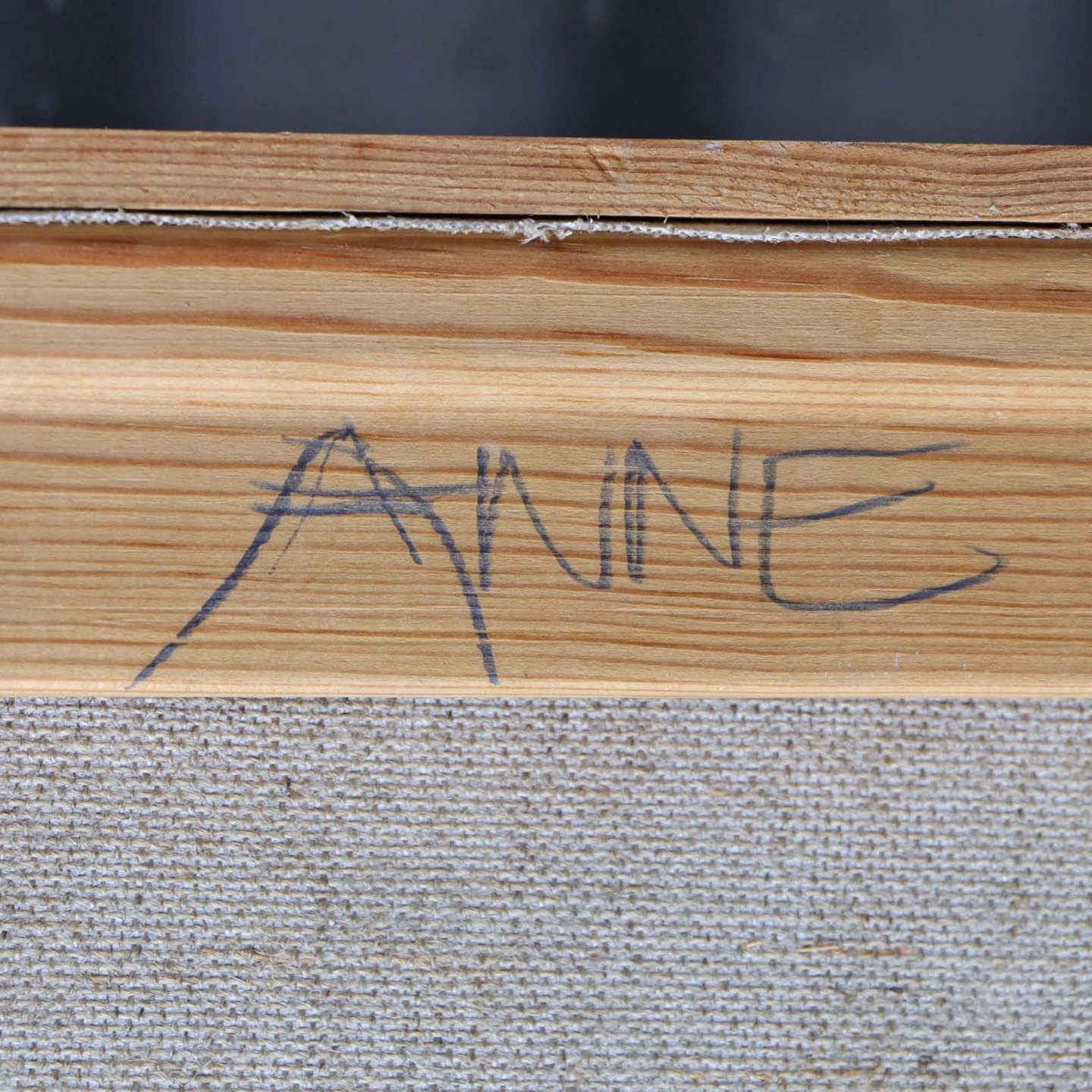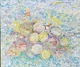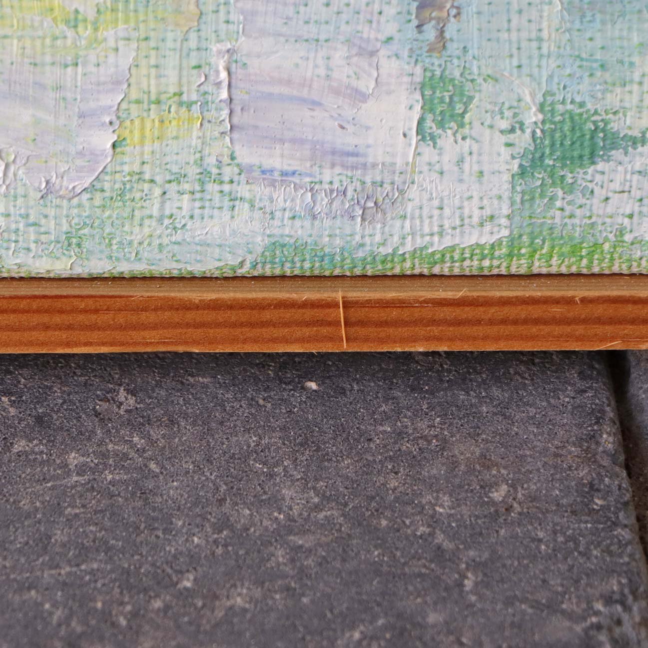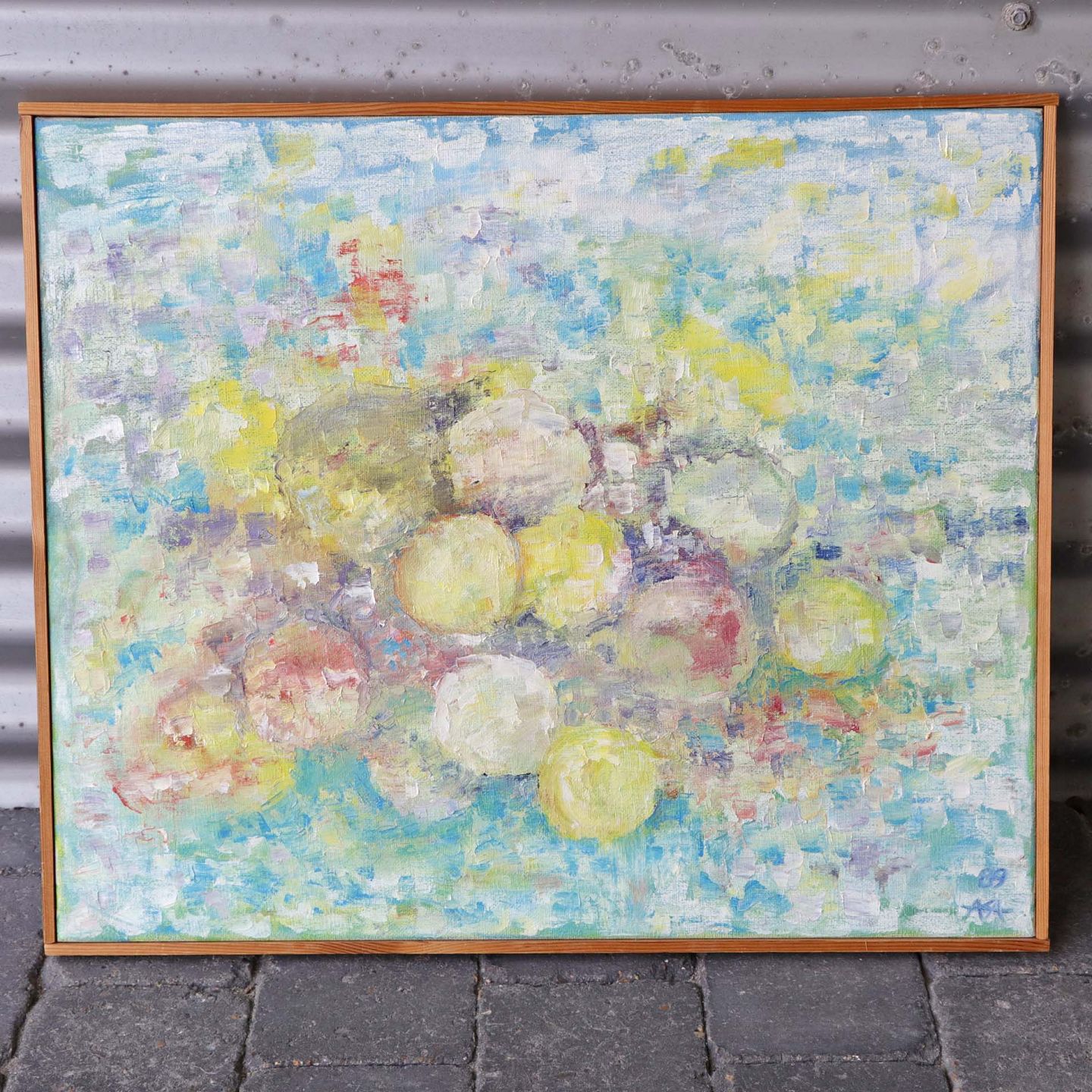 Maleri på lærred i fyrtræsramme med abstrakt motiv i pastel faver. Dateret 1989