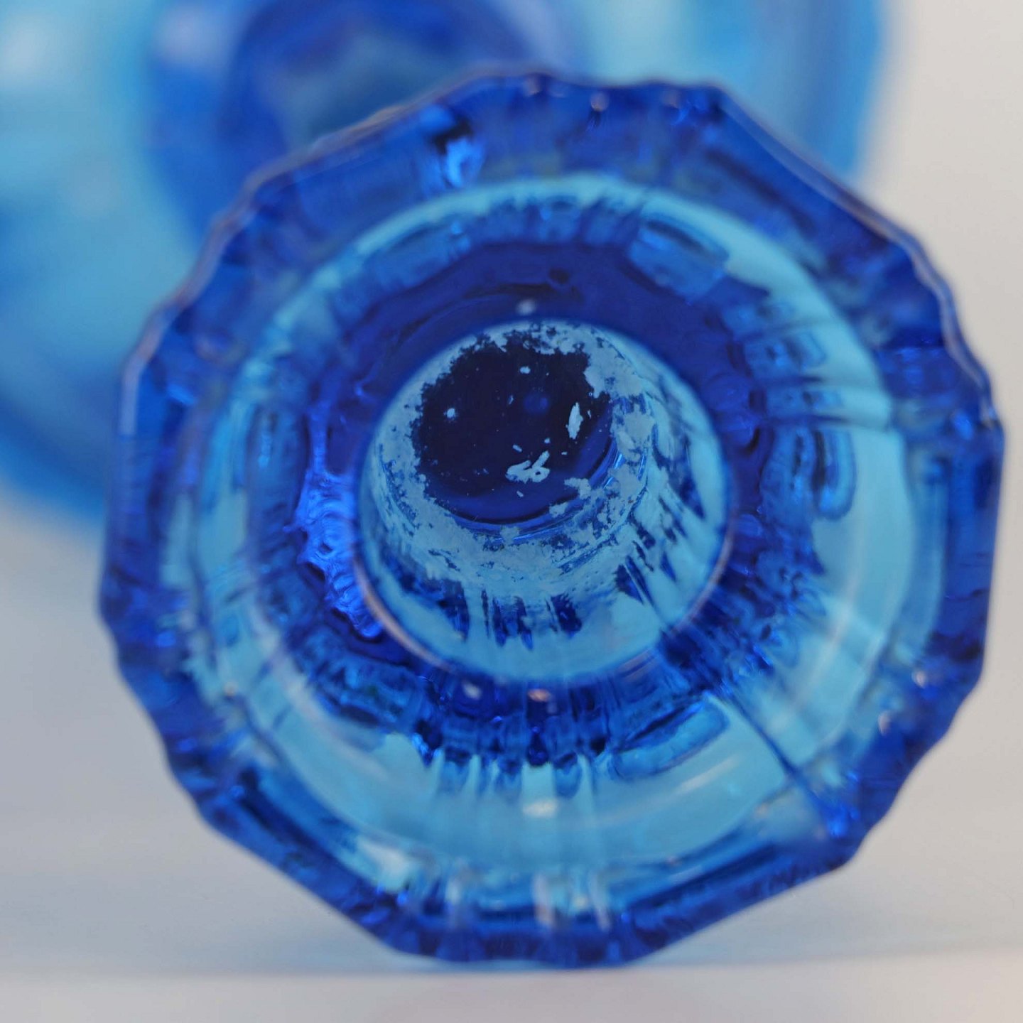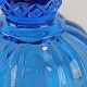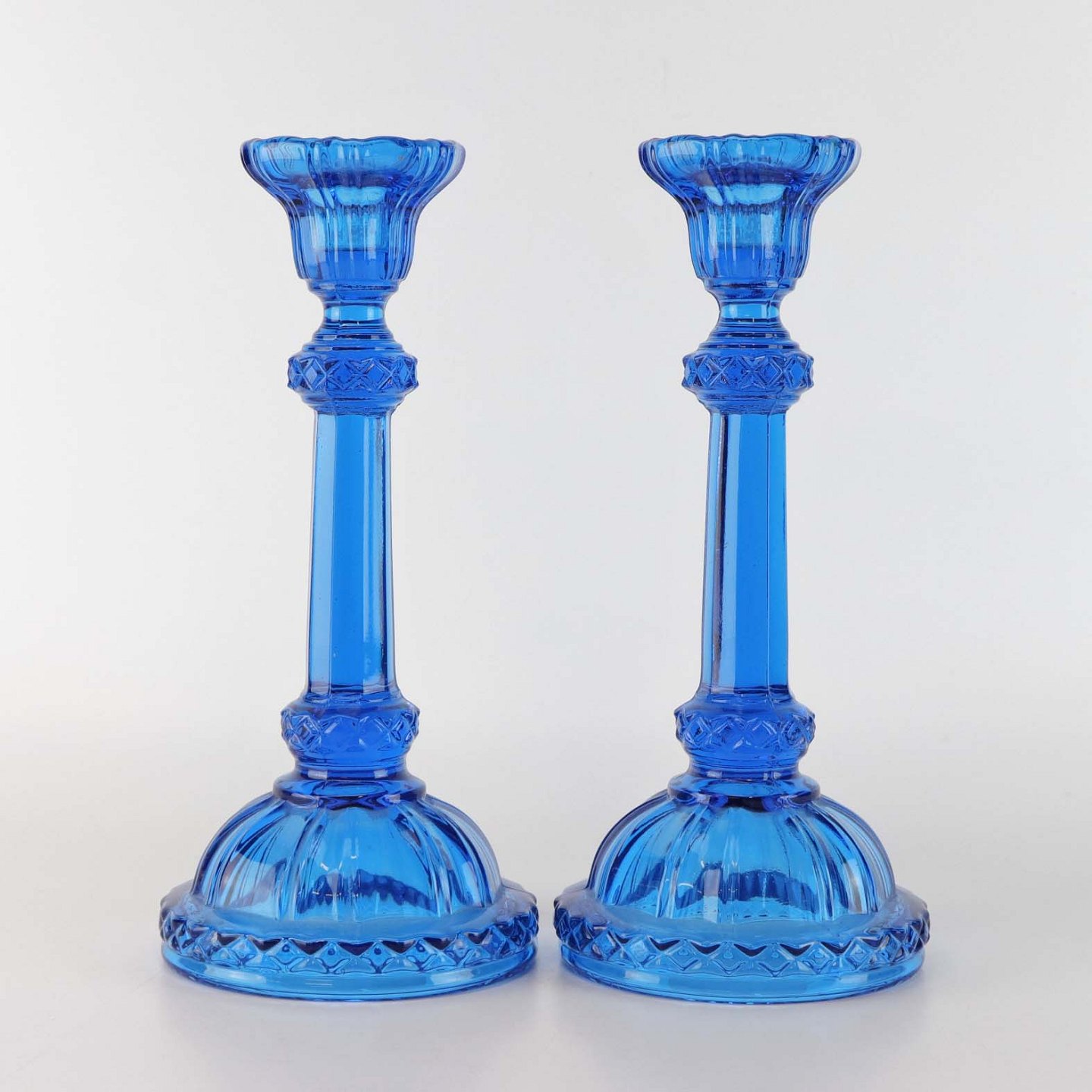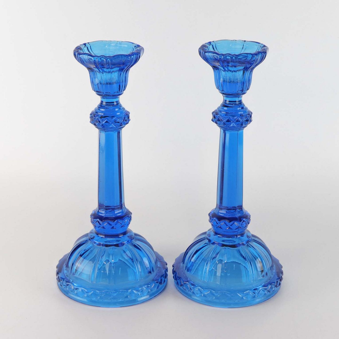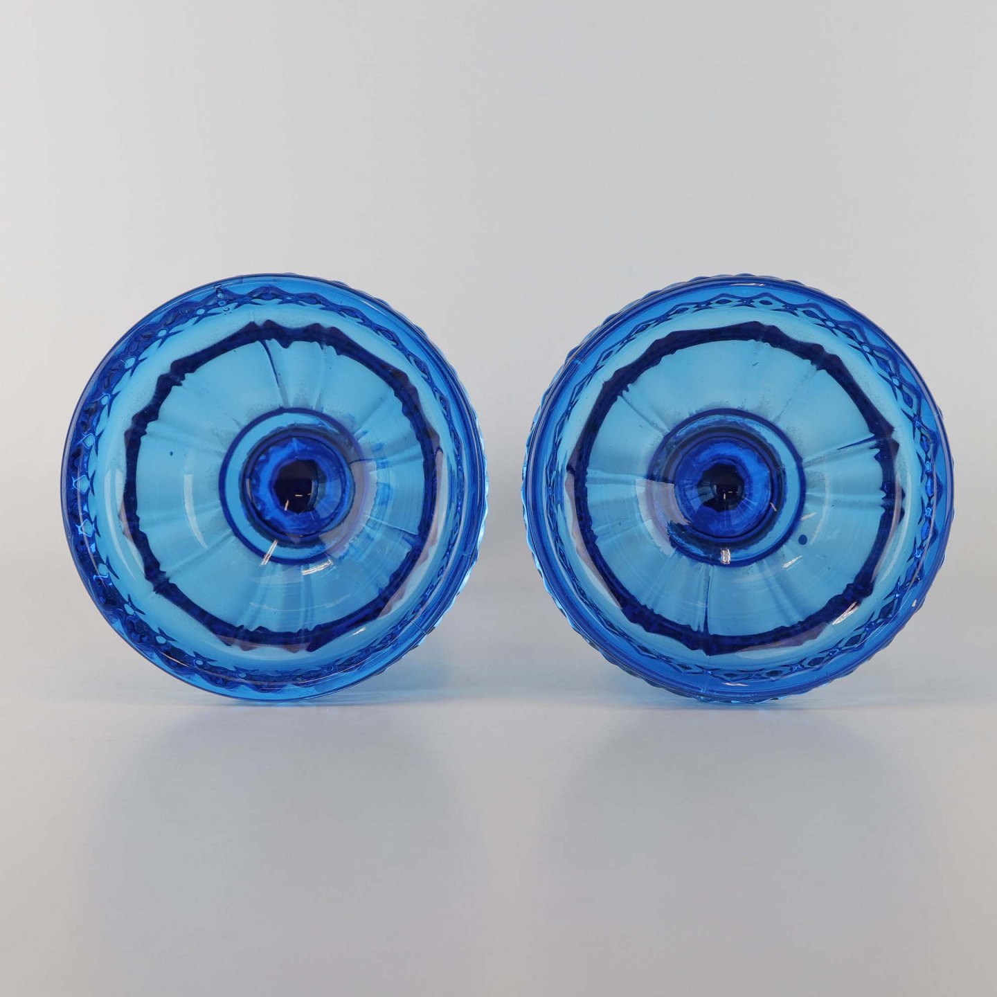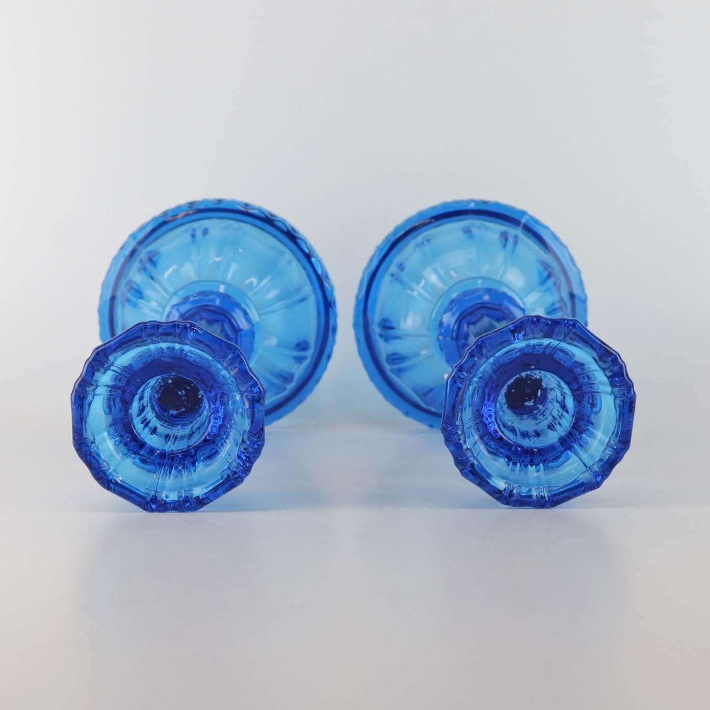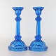 Et sæt lysestager i presset blåt glas.