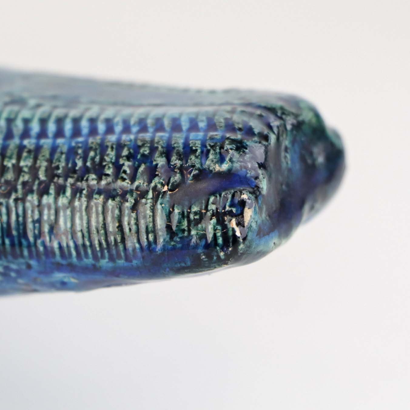 Figur i blå glaseret og struktureret keramik med motiv af en siddende fugl fra serien Rimini Blu. Nr. 4313