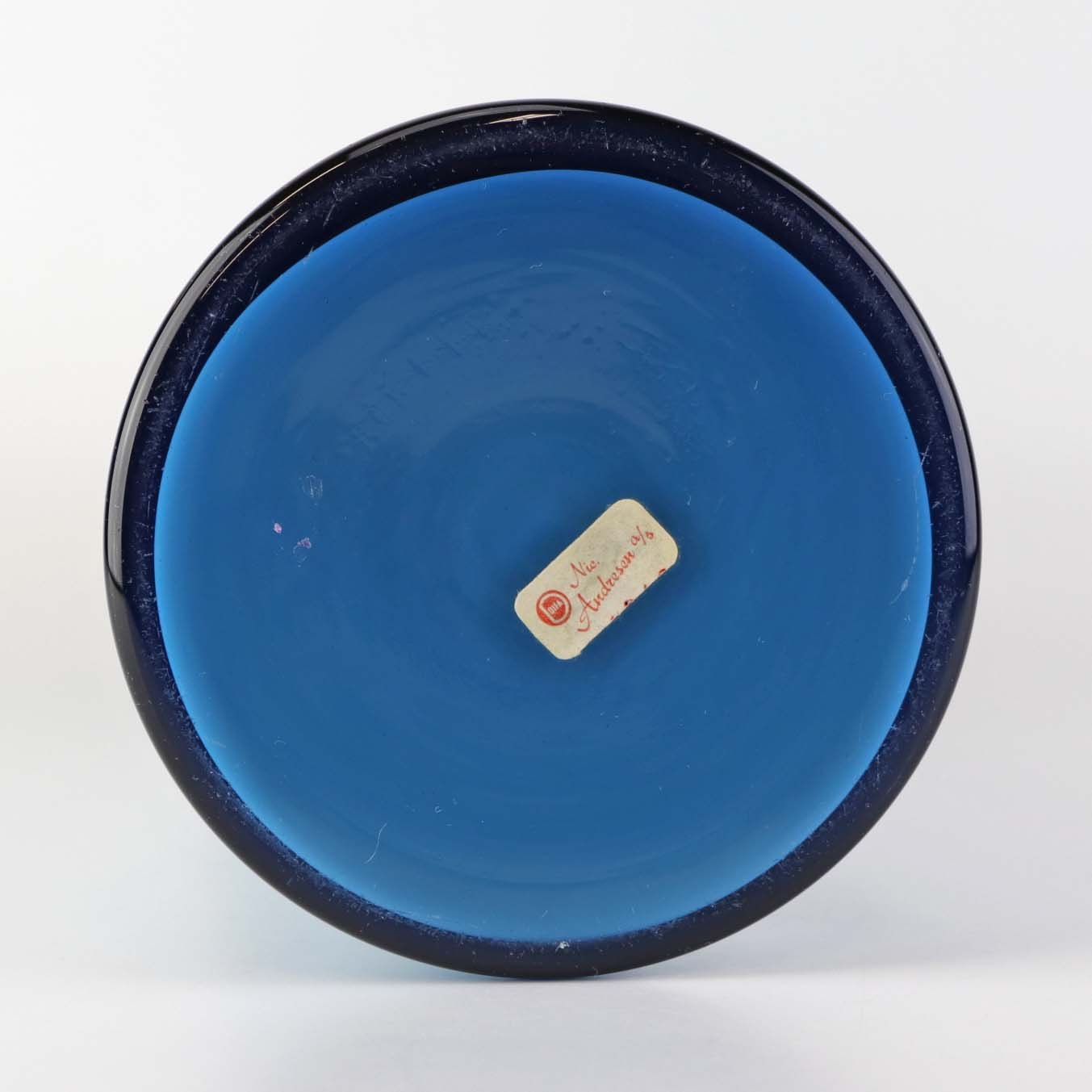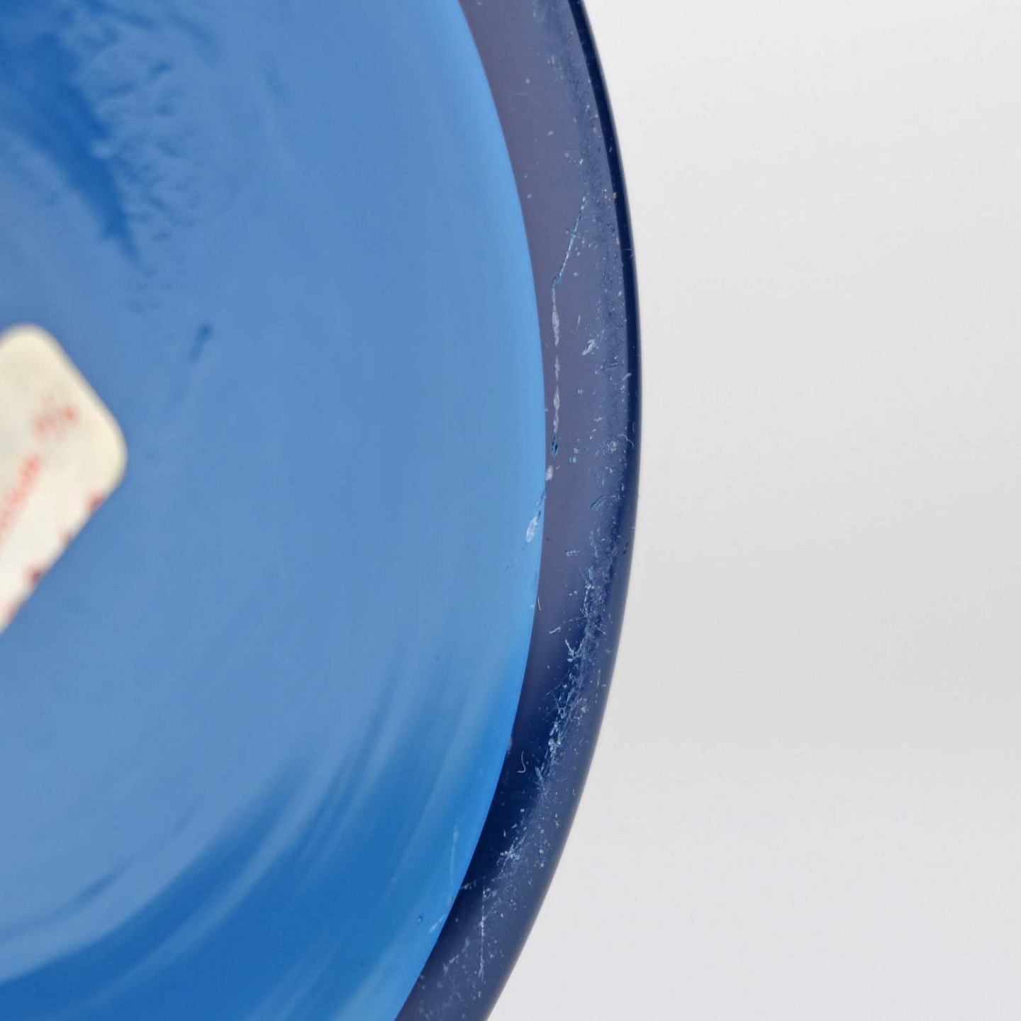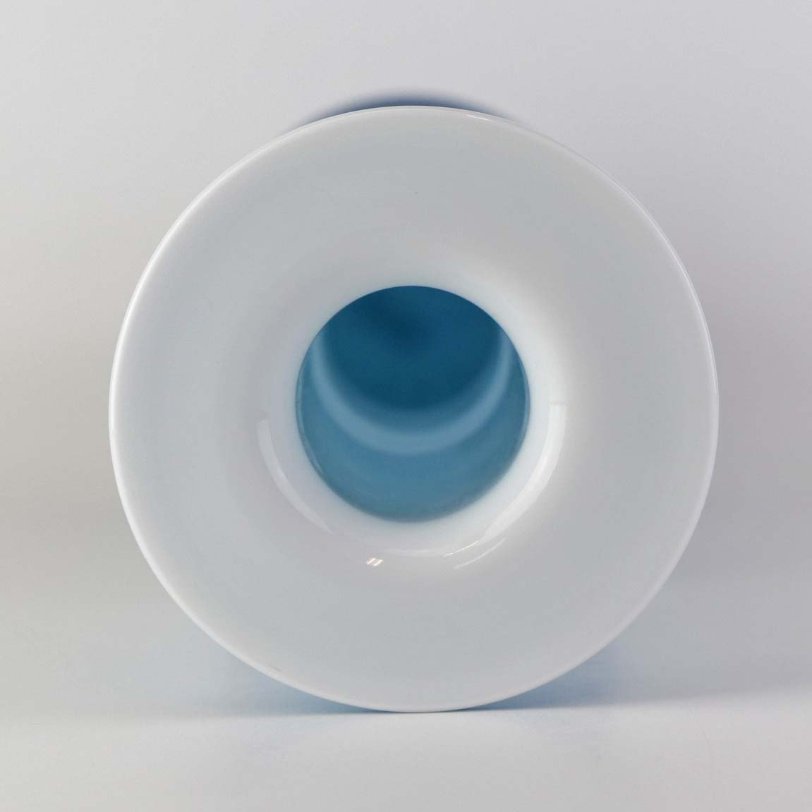 Vase i opal hvid mundblæst glas med blåt overfang. Vasen kan også bruges som lysestage.
