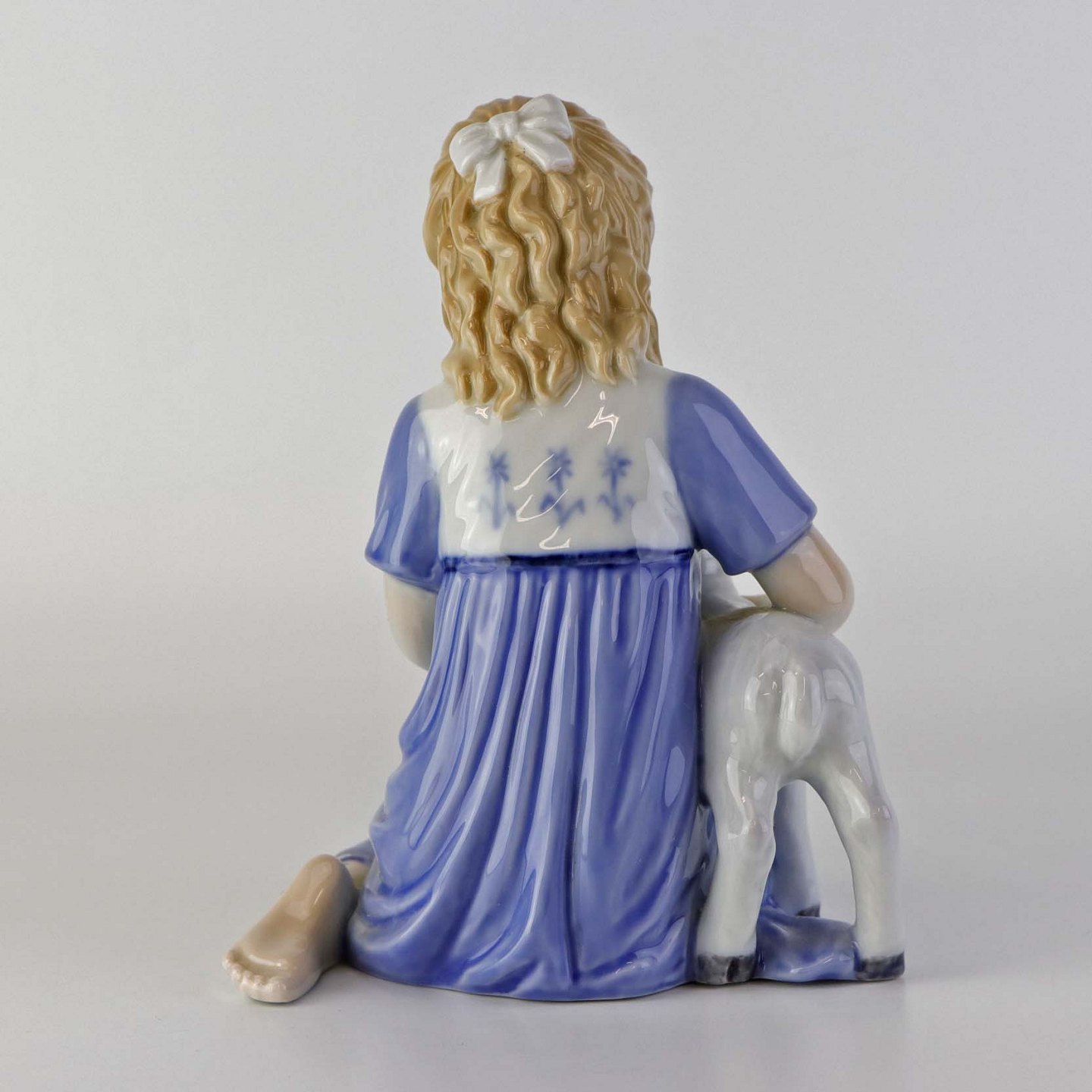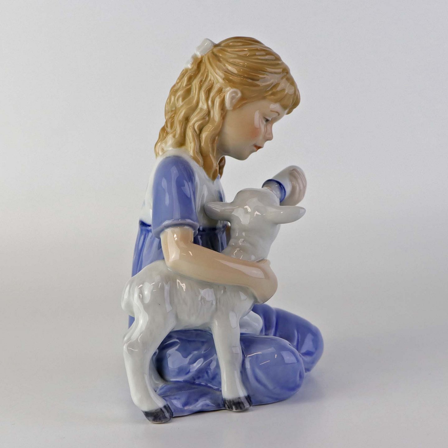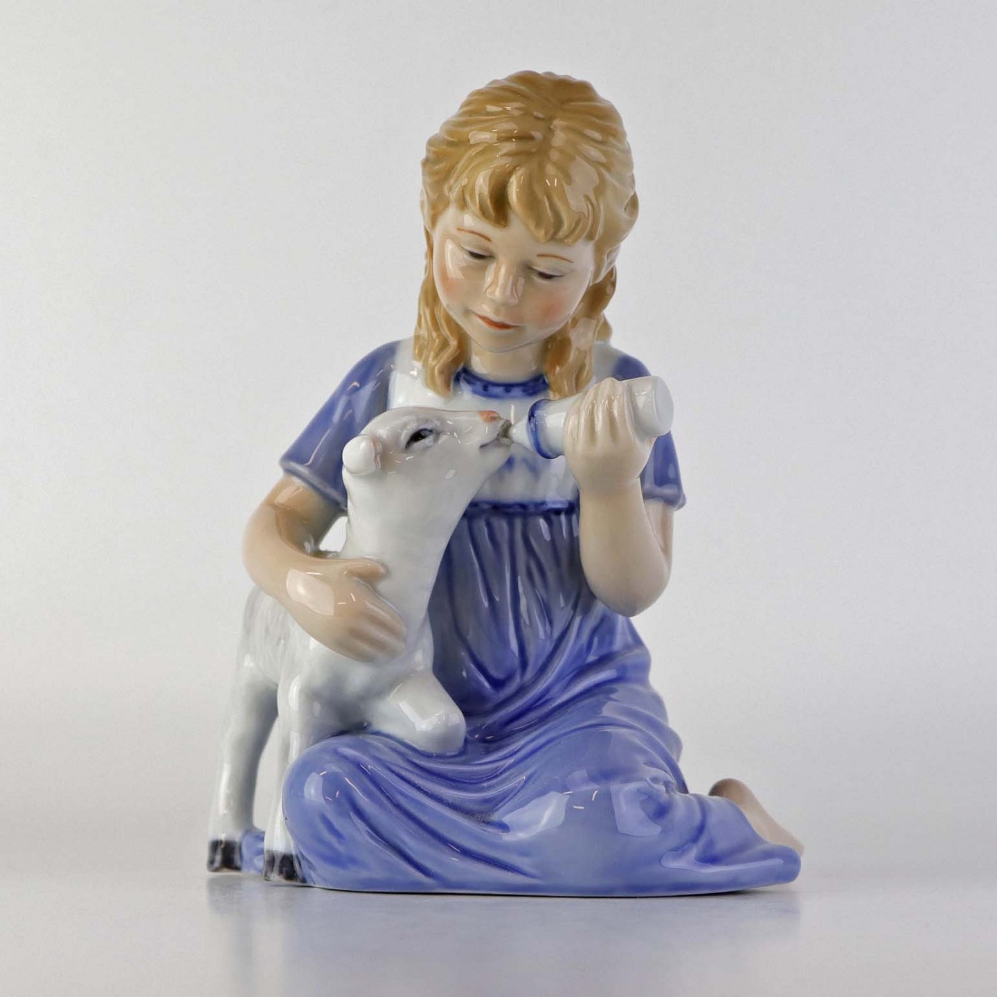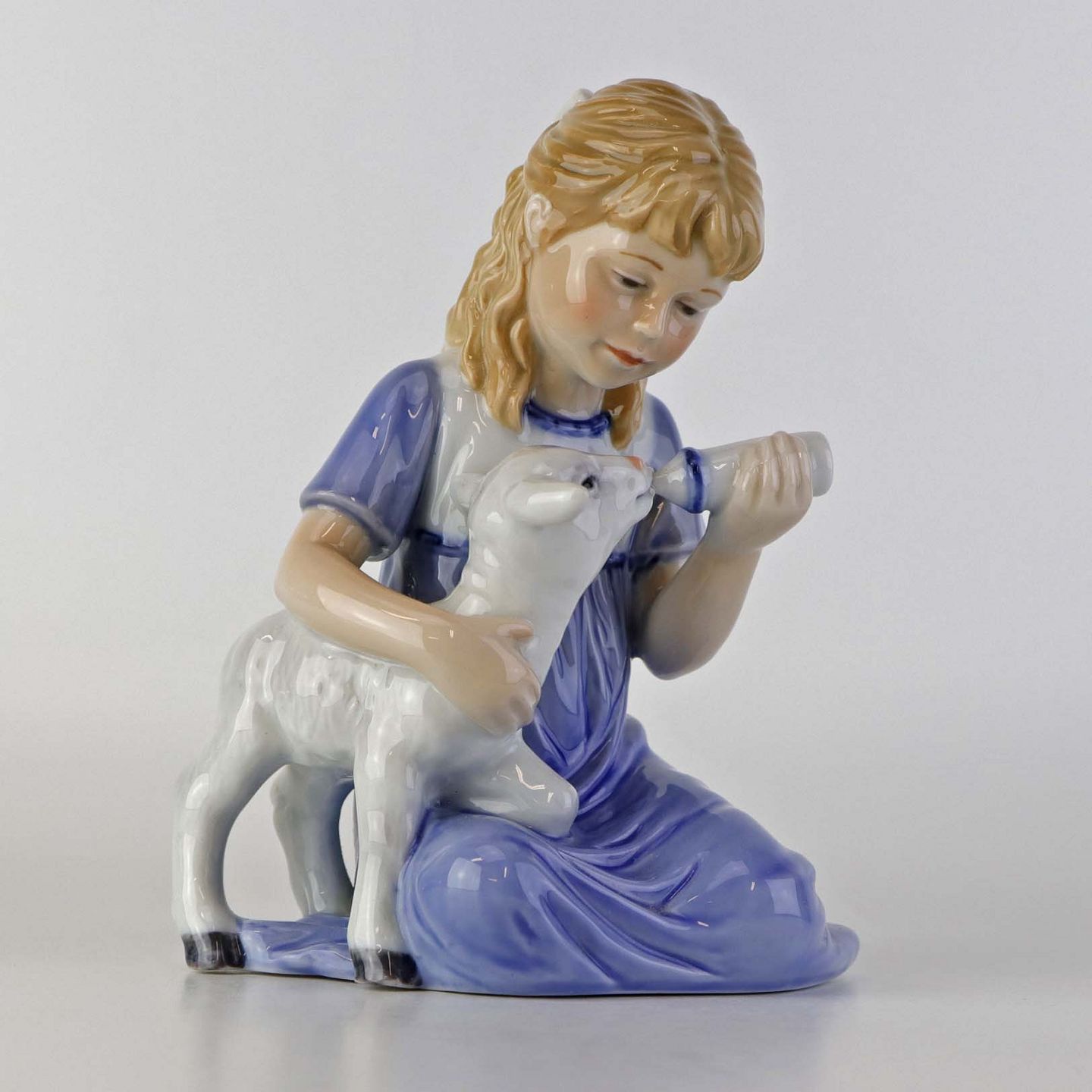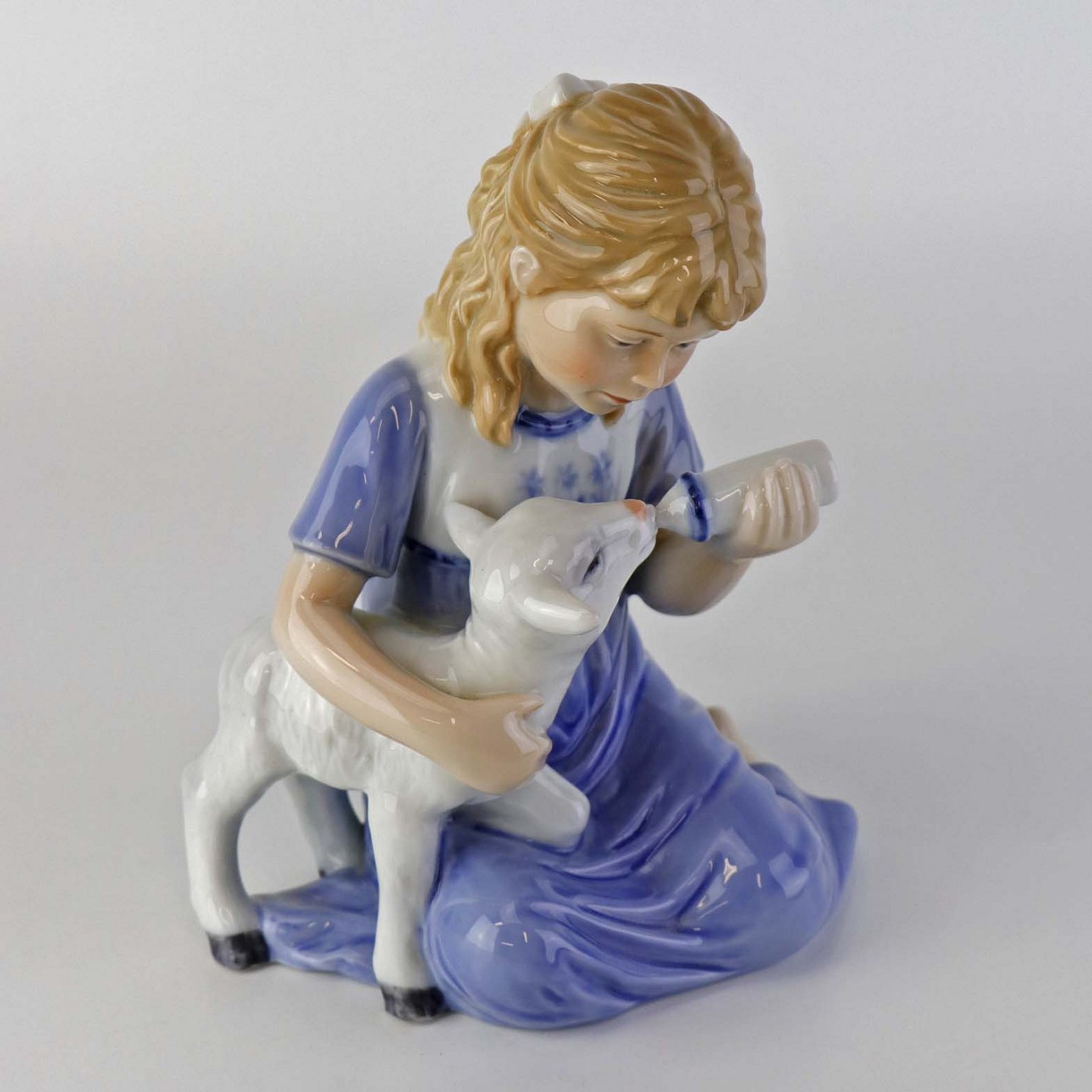 Figur i porcelæn med motiv af lille pige som giver et lam mælk med sutteflaske. Nr. 435
