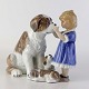 Figur i porcelæn med motiv af lille pige som klapper en Sankt Bernhard tæve, mens tævens hvalpe sidder mellem dem. Nr. 351