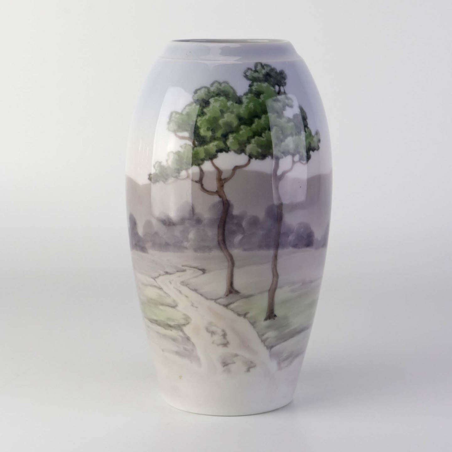 Vase i porcelæn med motiv af to træer ved jordsti. Nr. 8692/251