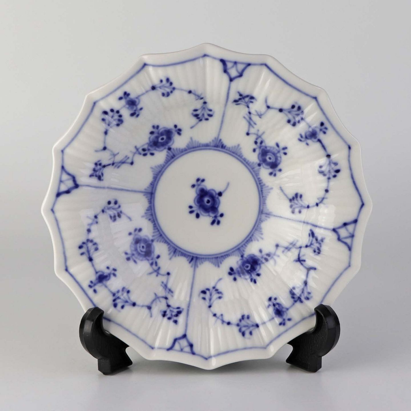 Musselmalet er af kongeligt hvidt porcelæn, dekoreret med rifler og mønster af blå ranker og blomster