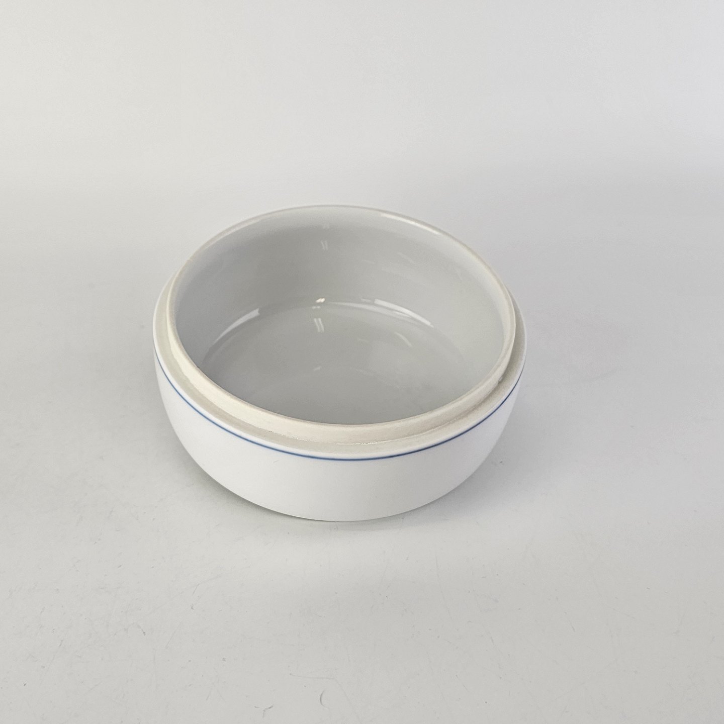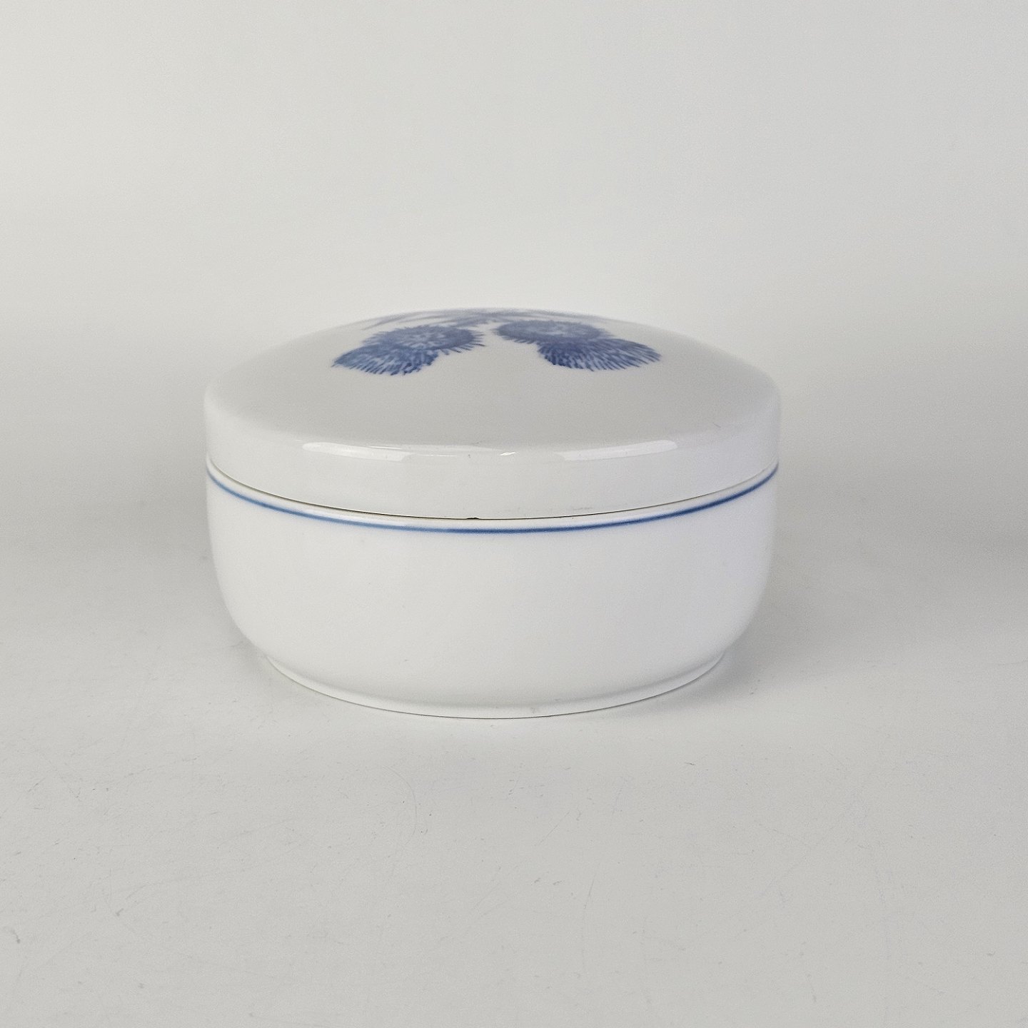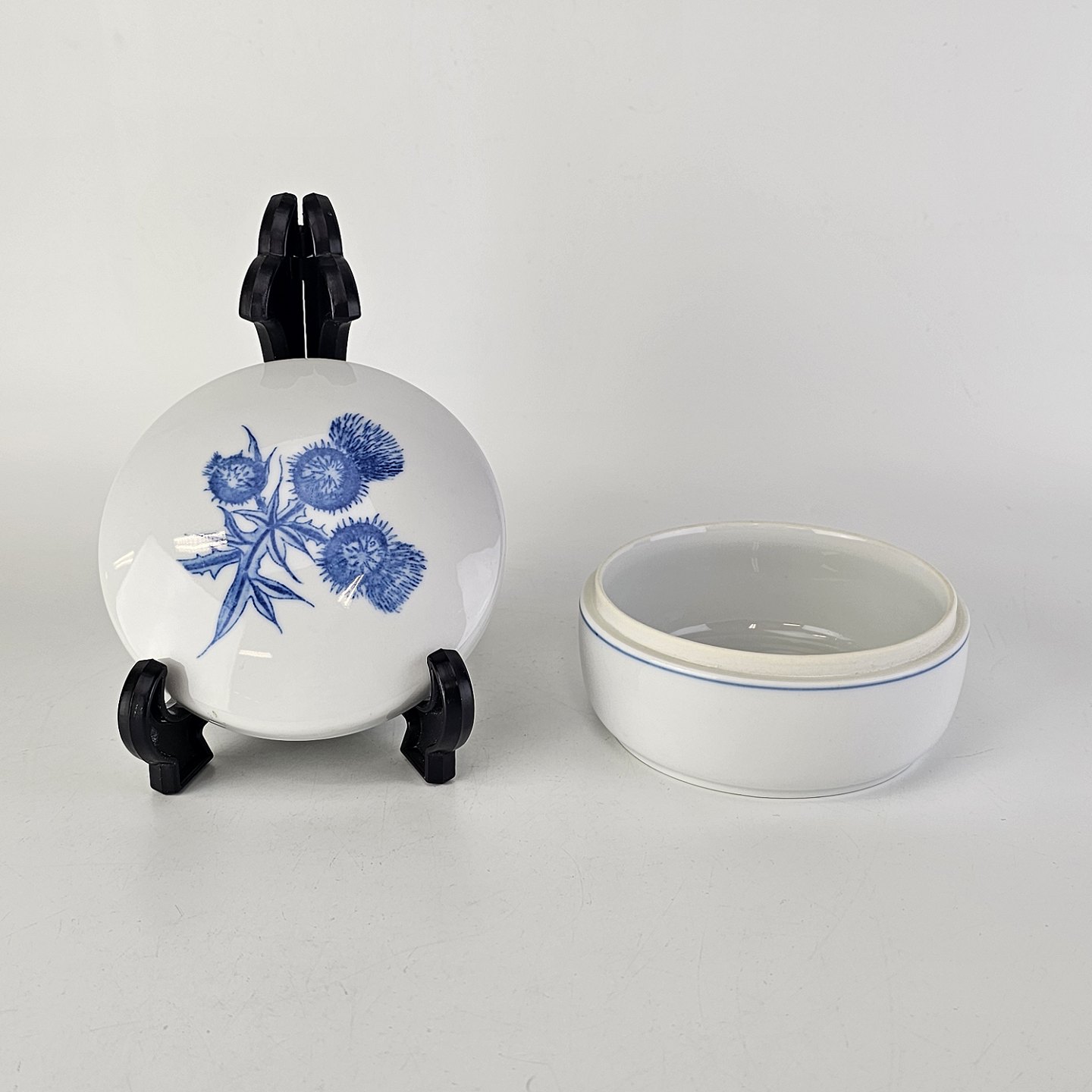 Bing & Grøndahl bonbonniere krukke med låg i hvidt porcelæn med motiv af tidsel i blå.