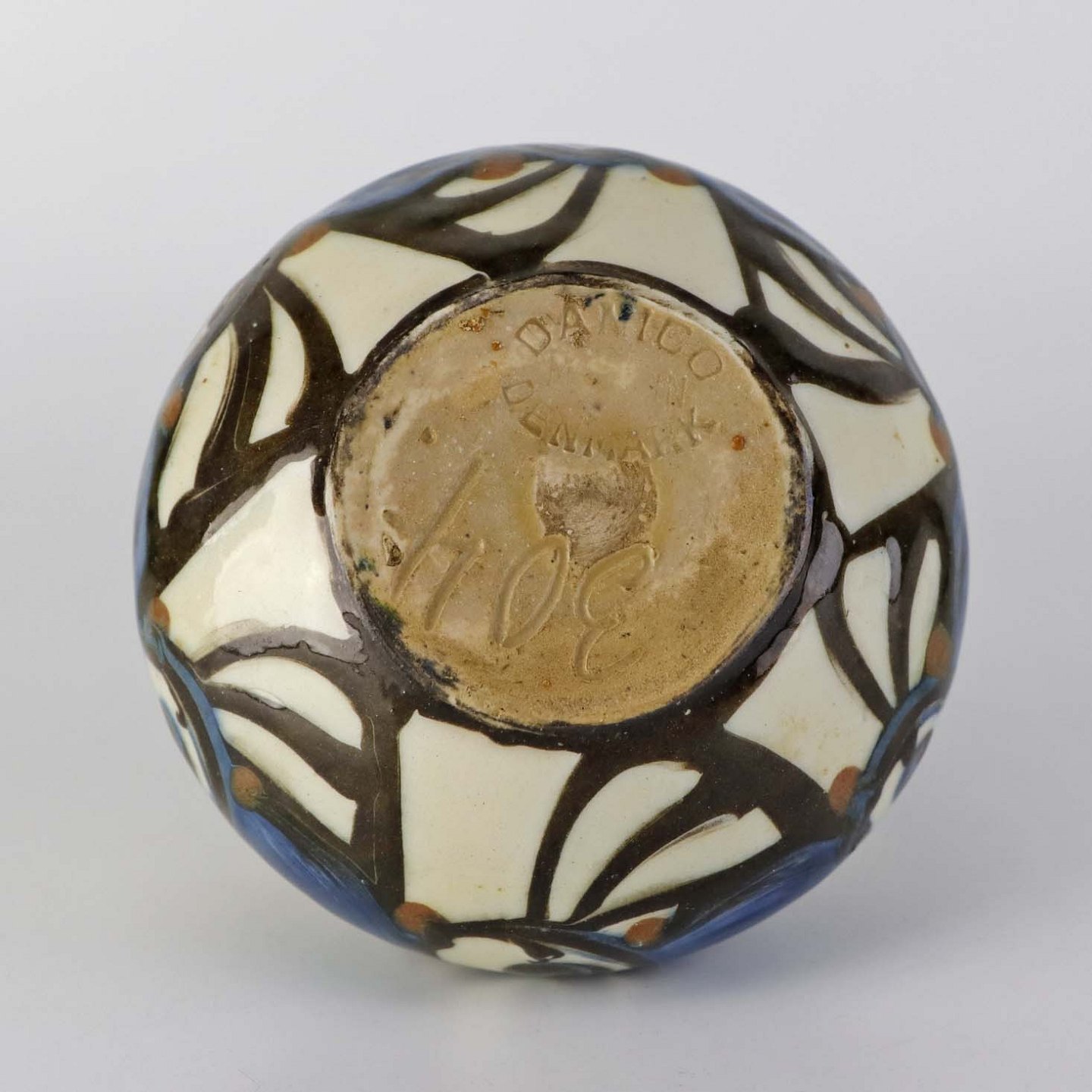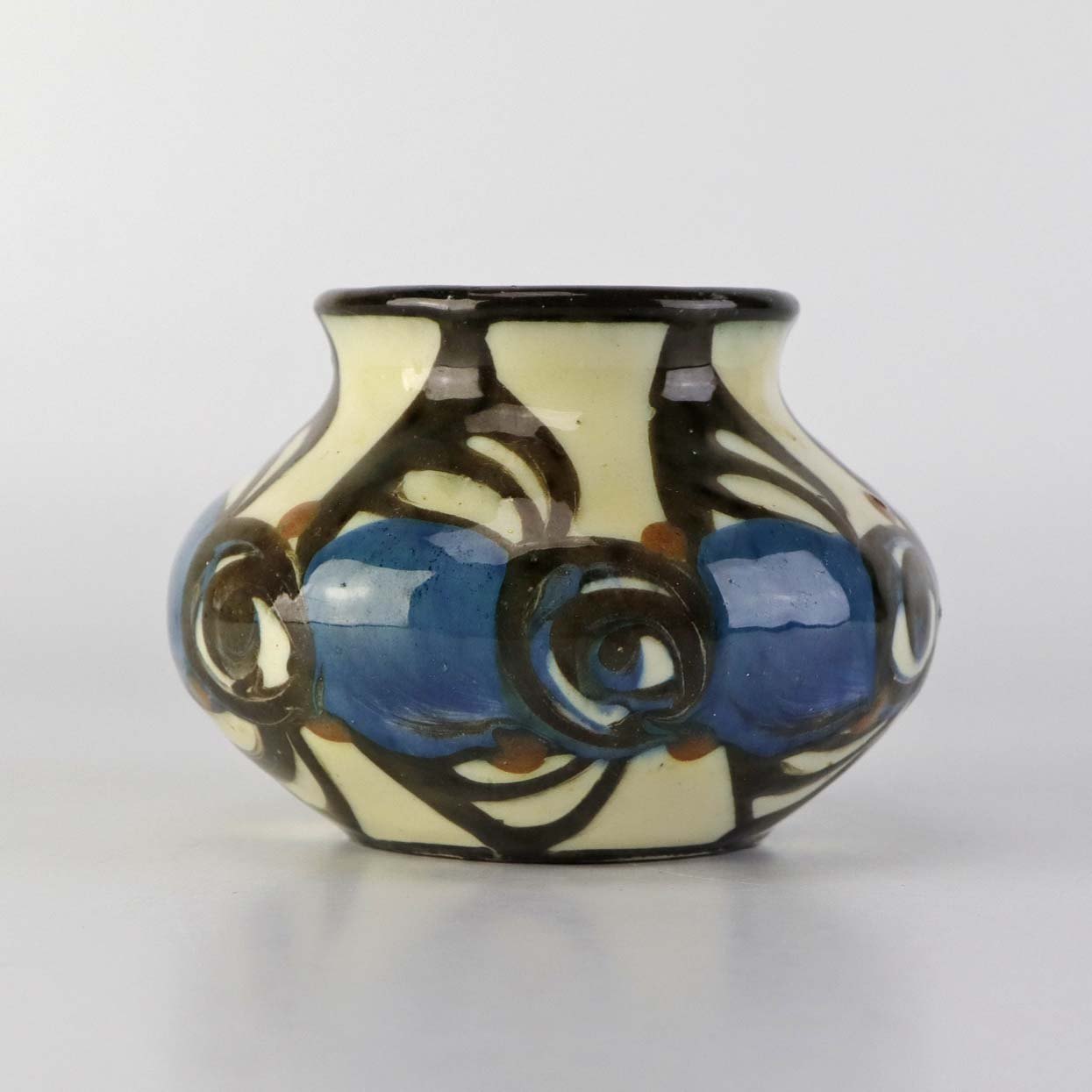 Vase med indeni glasering og sort, blå og brunt mønster på lys baggrund.