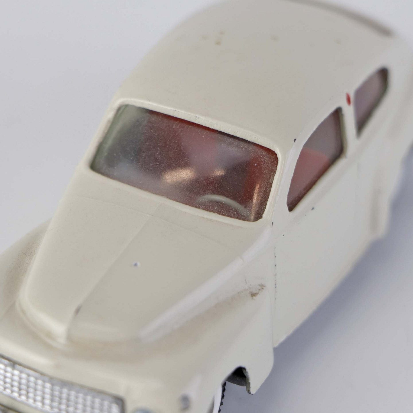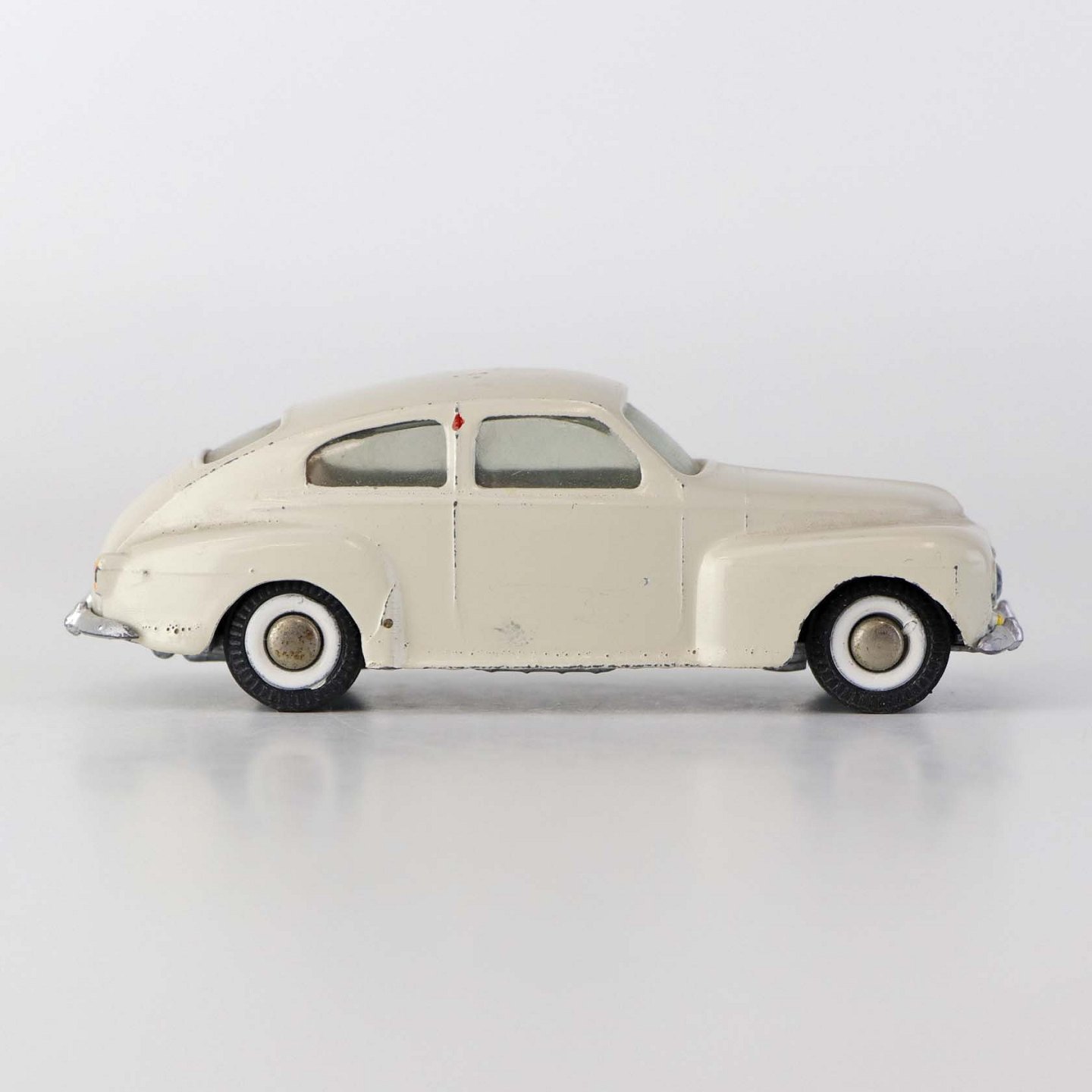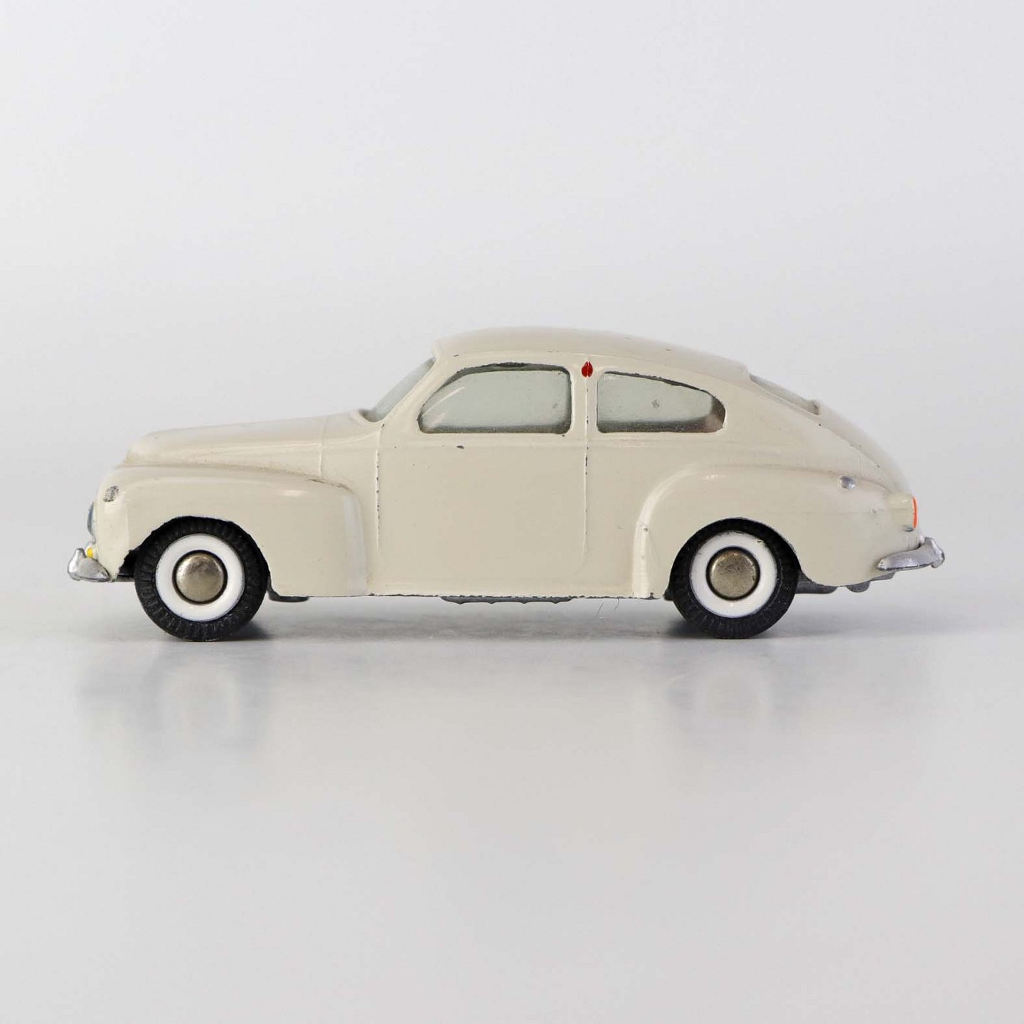Hvid Volvo PV 544 legetøjsbil i lakeret metal med gummi hjul. Nr. 822