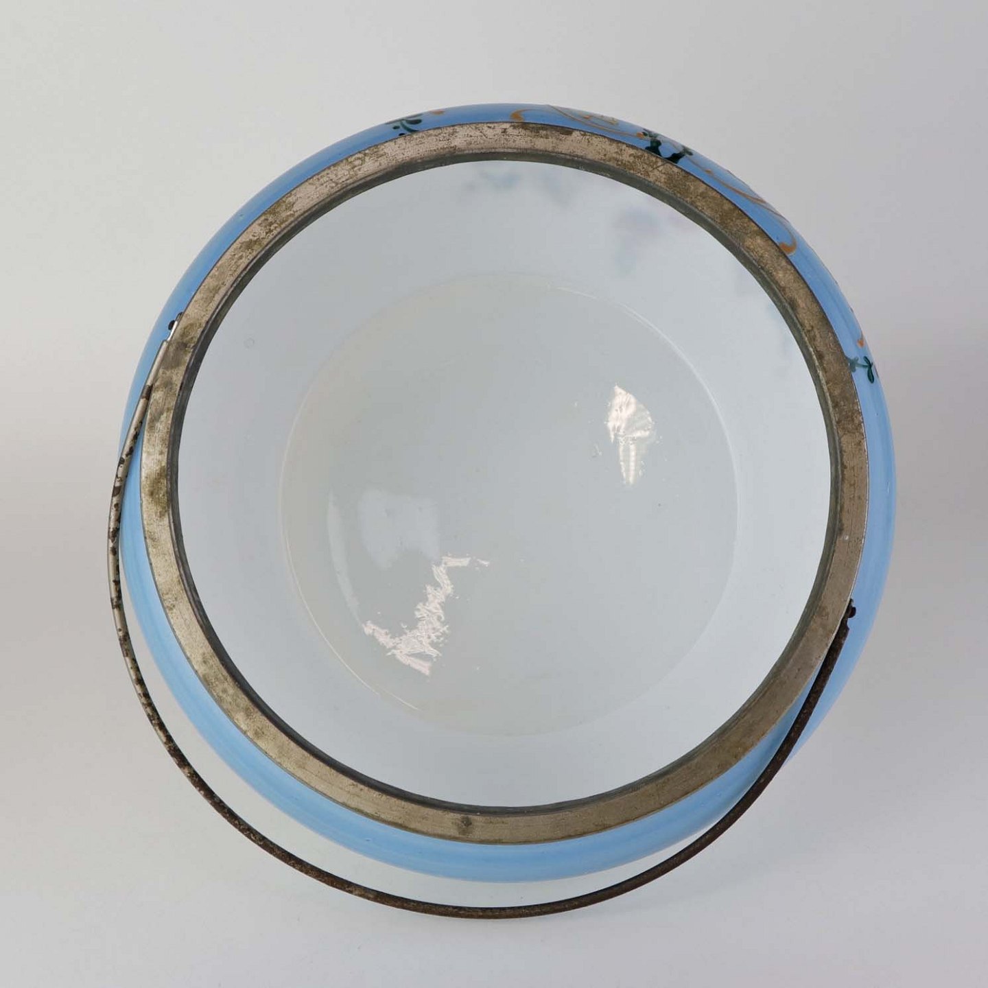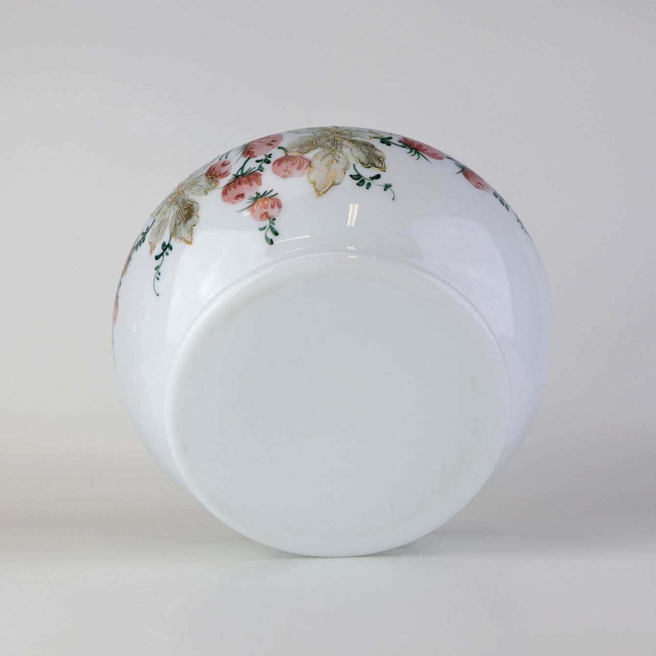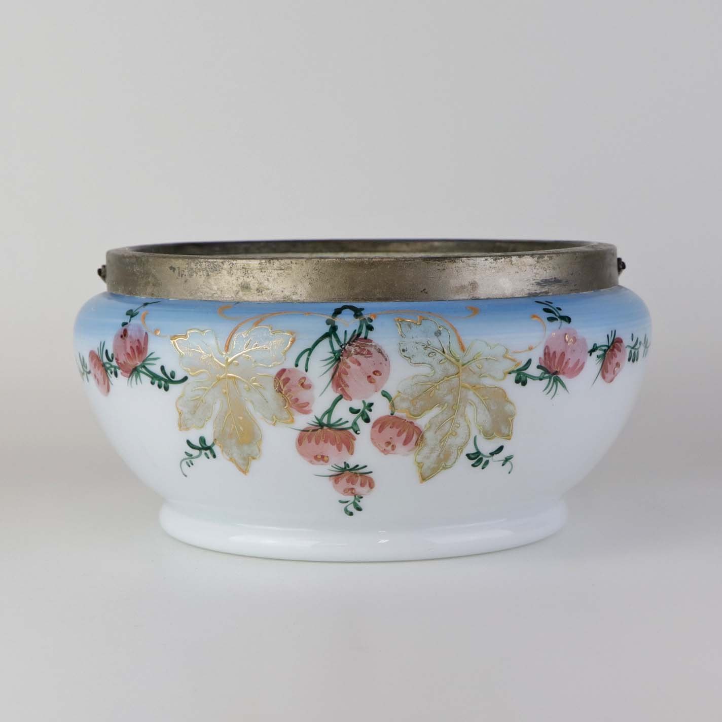 Skål i glas med høj hank i metal og malede motiv af lyserøde blomster og gyldne blade.