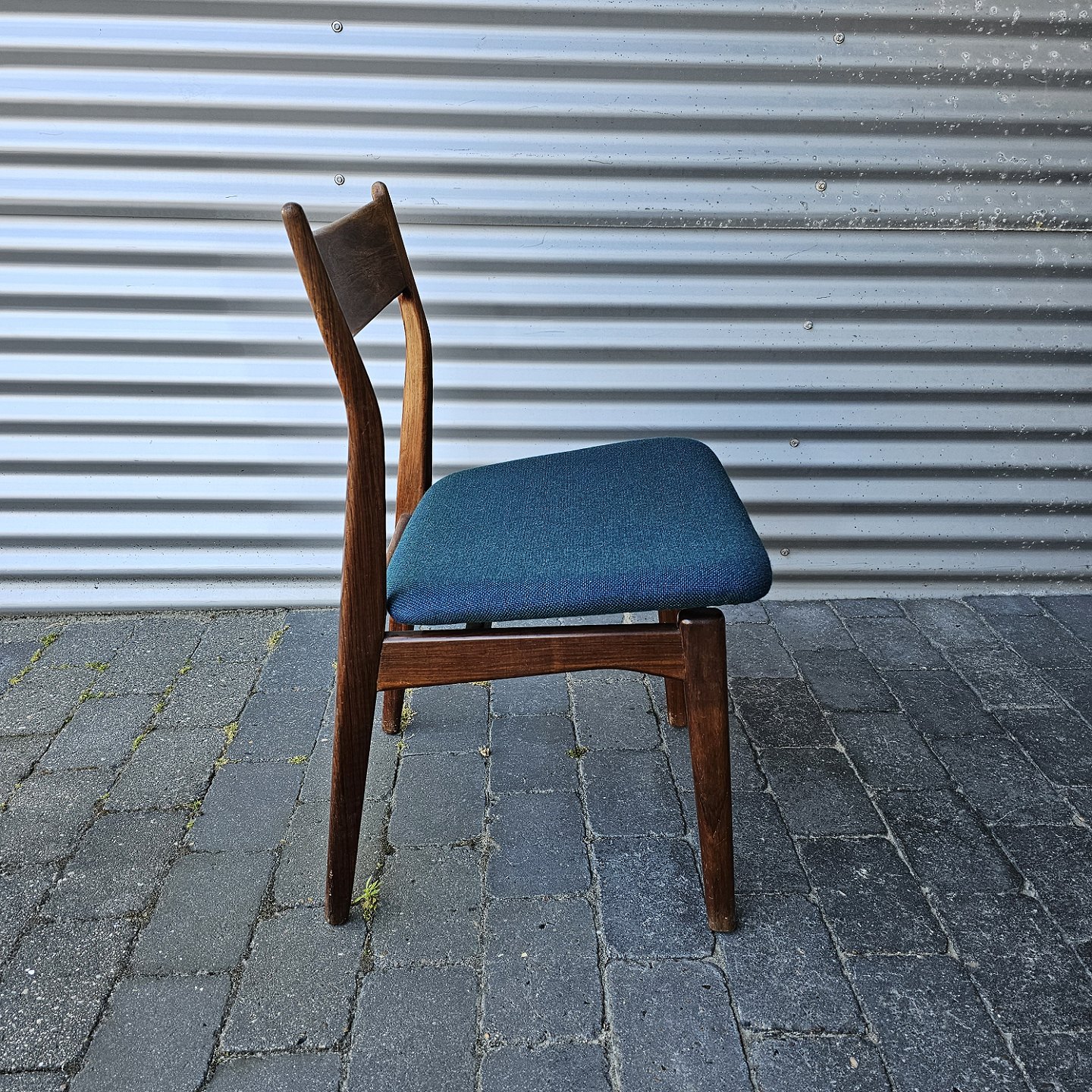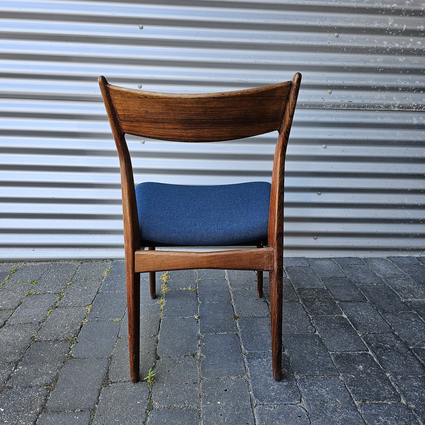 Sæt med fire spisebordsstole i palisander med sæde betrukket med blåt stof