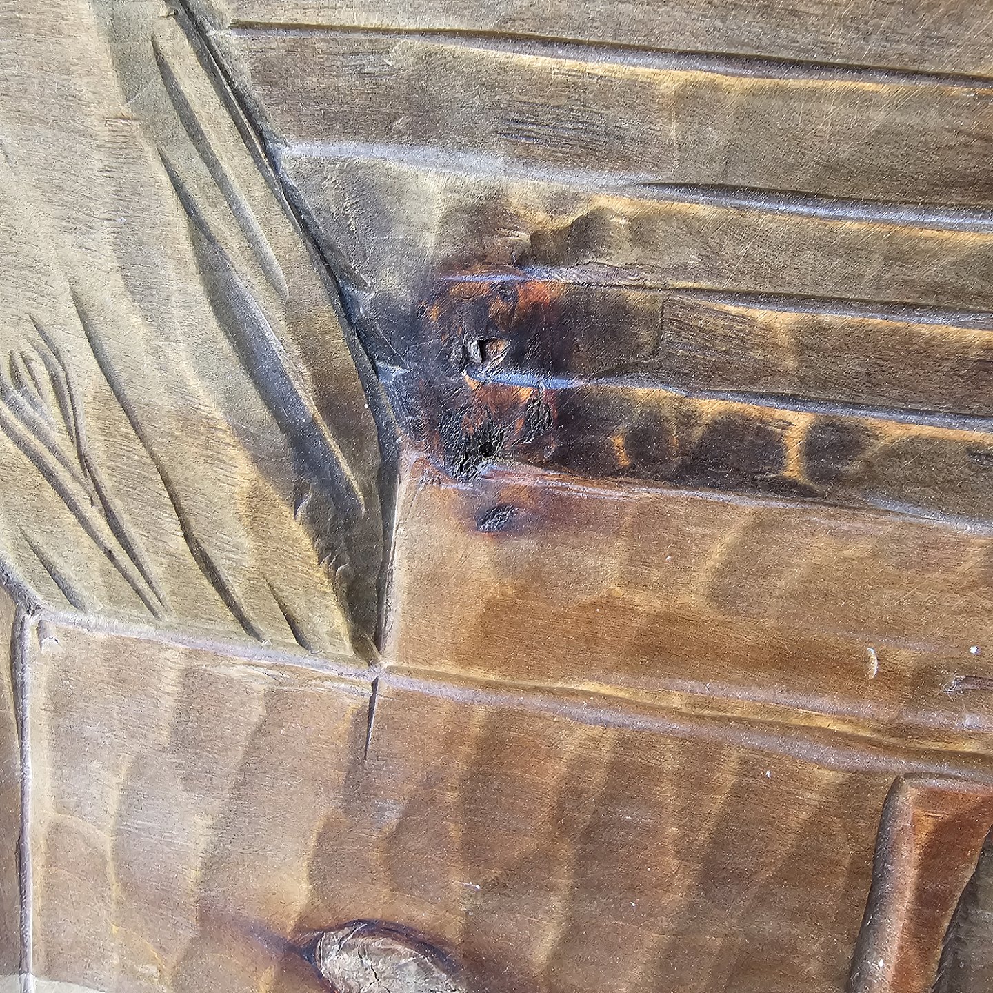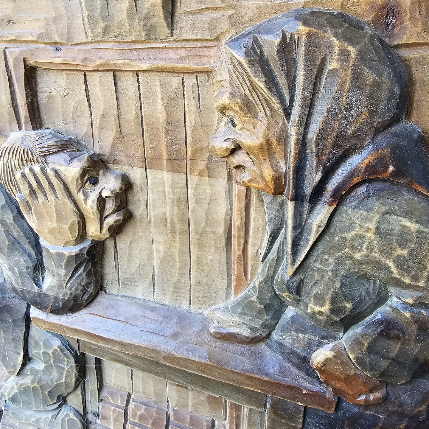 Trærelief med motiv af mand og kvinde ved et bord fra 1952