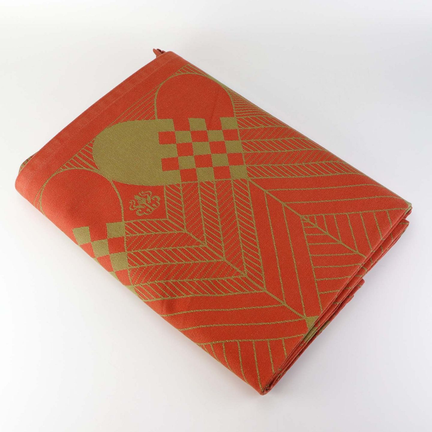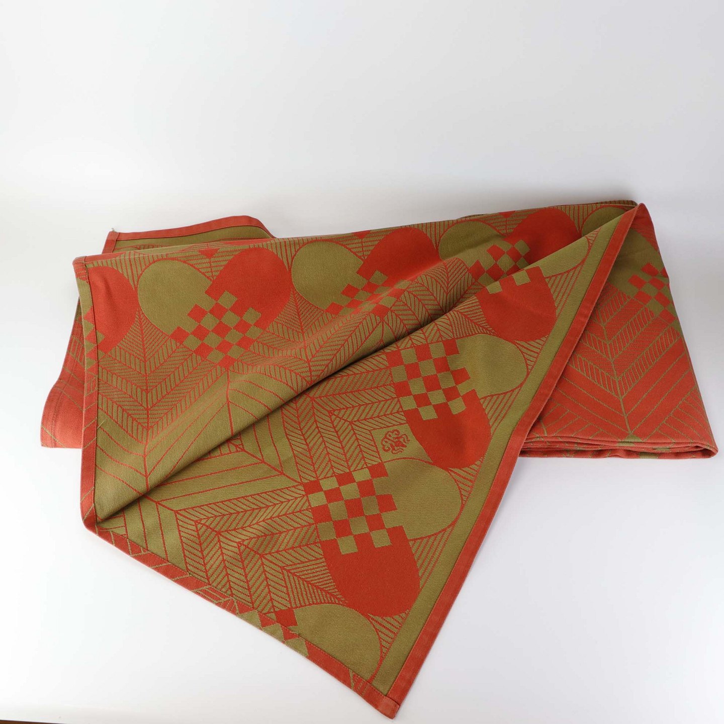 Vævet damask dug i bomuld med motiv af flettede julehjerter i rød og grøn farve.