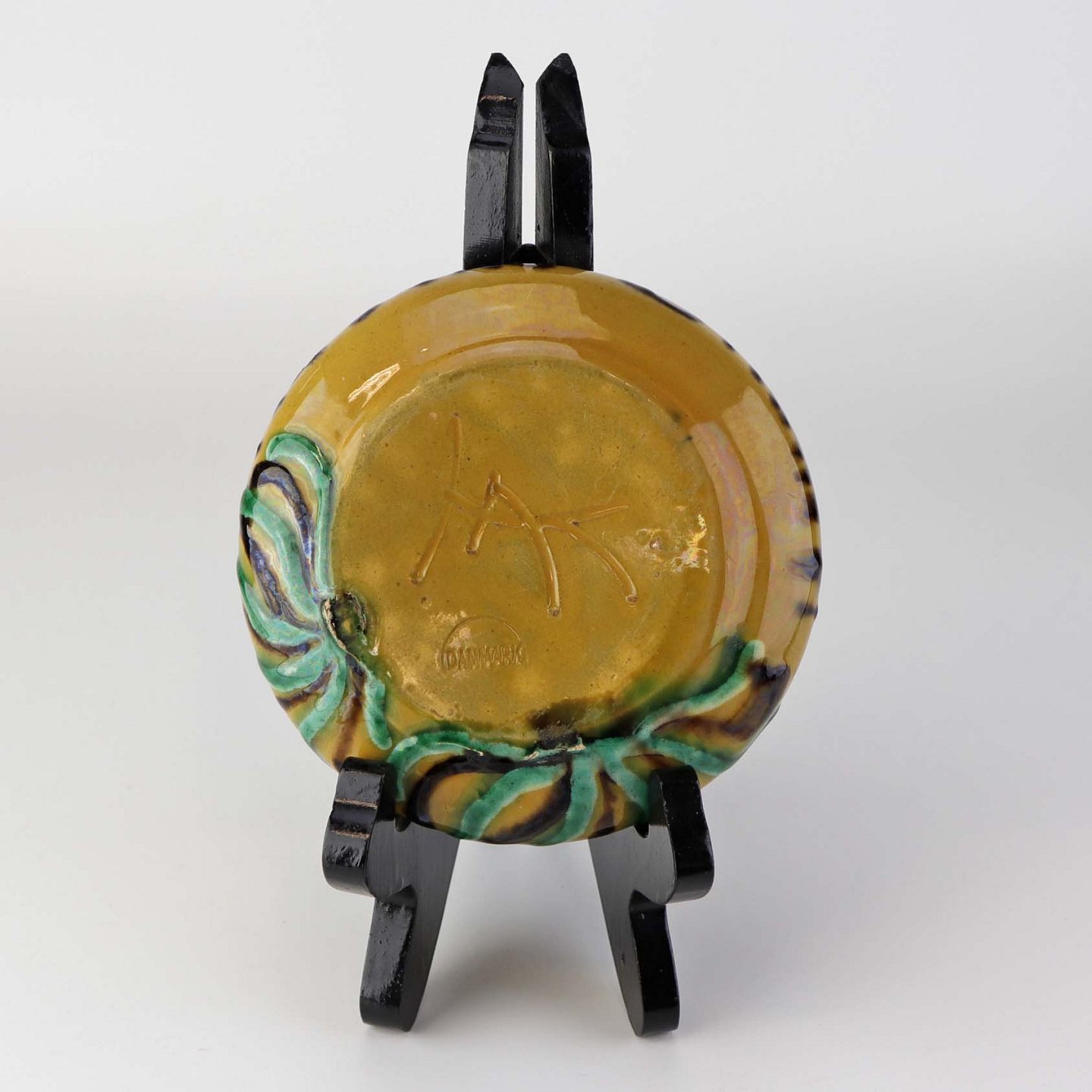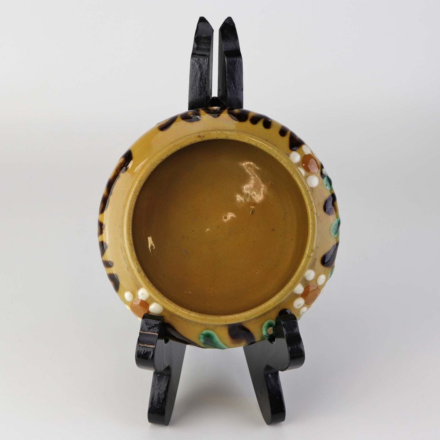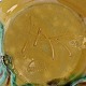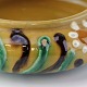 Mindre skål i glaseret keramik med teksten Nyborg Strand og dekoration af blomster og blade.
