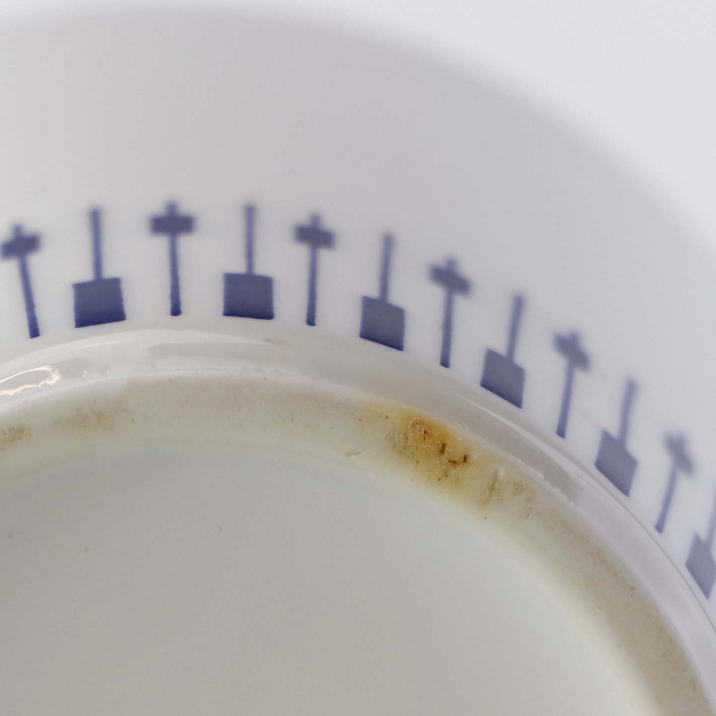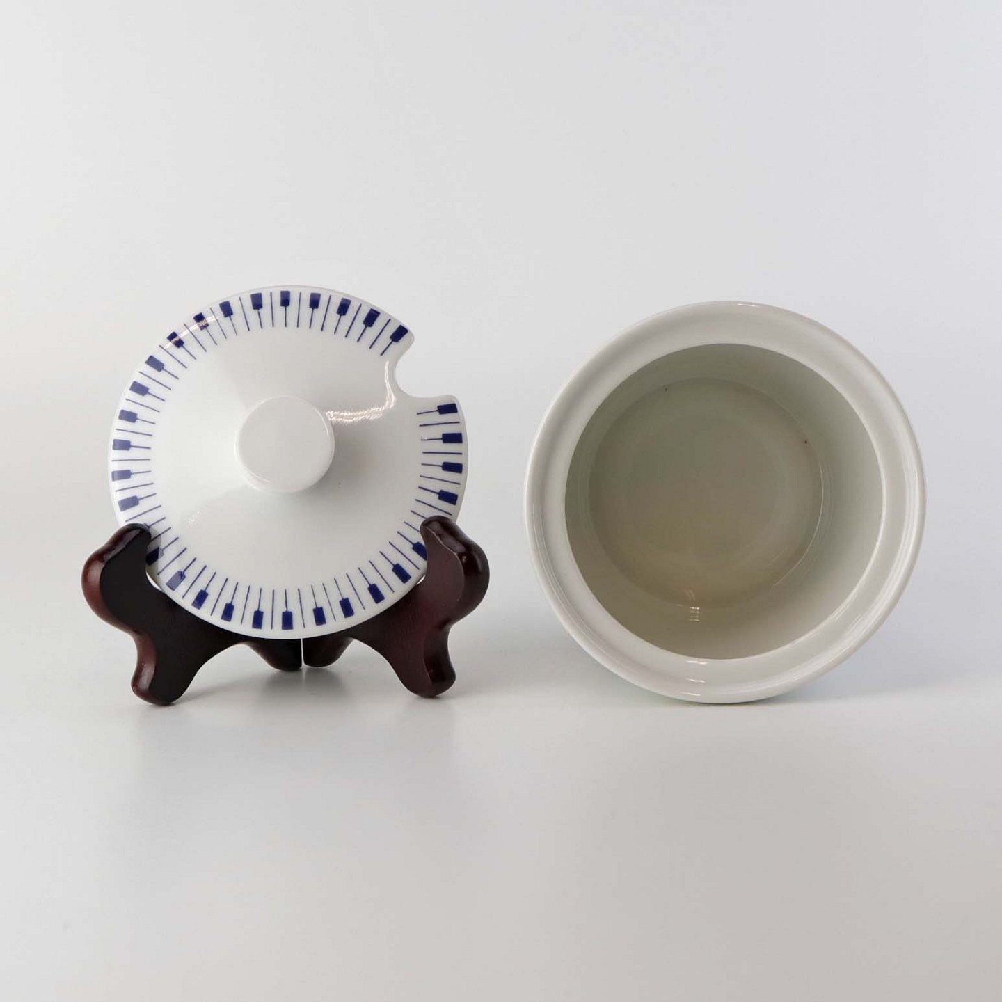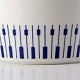 Stellet er fremstillet i ildfast glat porcelæn dekoreret med mørkeblå tangenter på hvid baggrund.