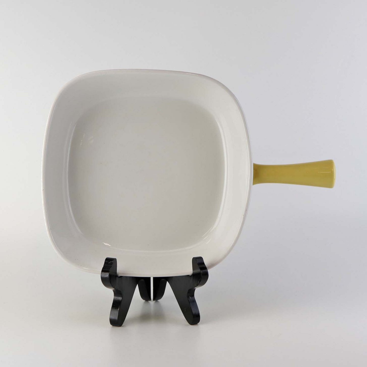 Stellet er fremstillet i ildfast glat porcelæn dekoreret med gul glaseret yderside og hvid glaseret inderside.