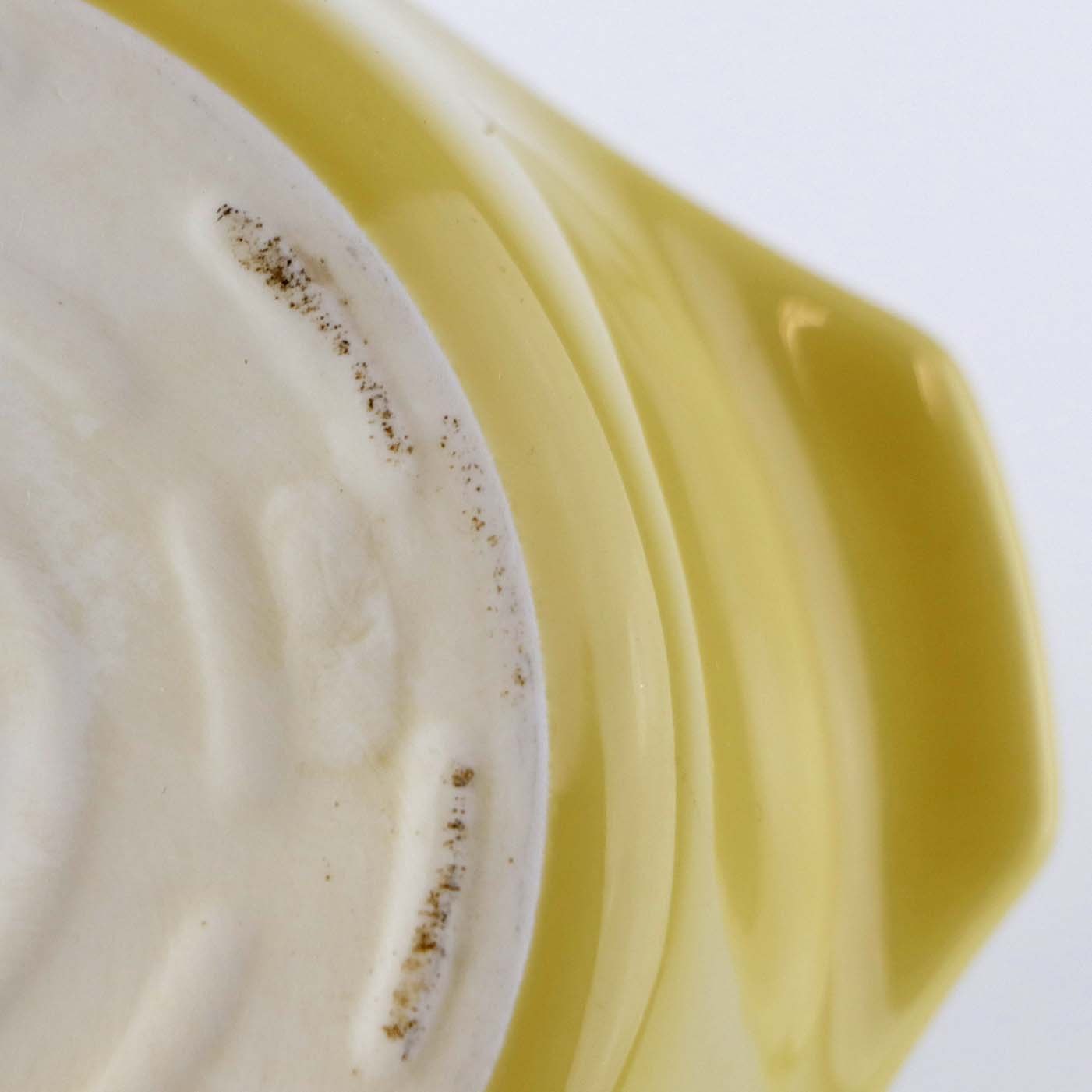 Stellet er fremstillet i ildfast glat porcelæn dekoreret med gul glaseret yderside og hvid glaseret inderside.