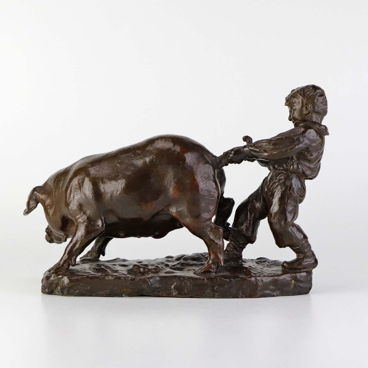 Figur i brunmalet bronze med motiv af dreng, som trækker en gris i halen.