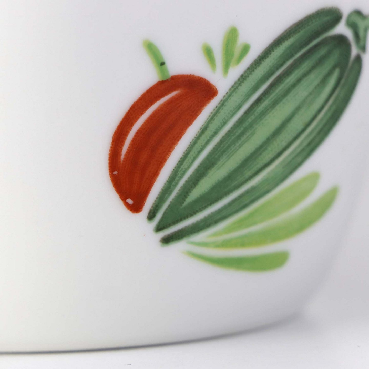 Stellet er i glat hvidt porcelæn med varierende farverige motiver af frugter og grønt.